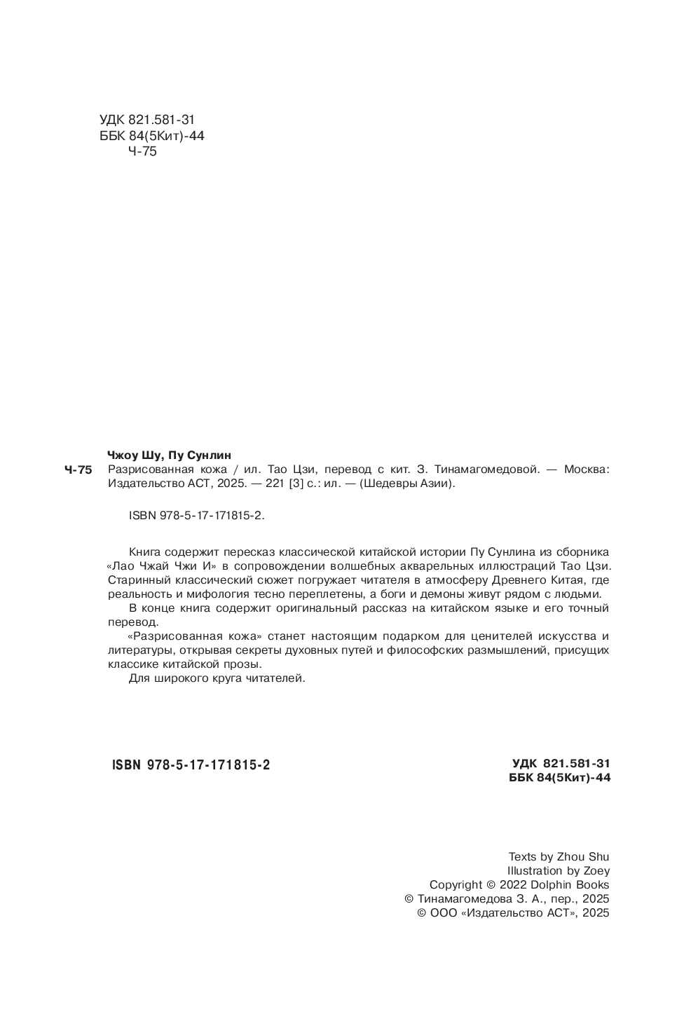 "Разрисованная кожа" станет настоящим подарком для ценителей искусства и литературы, открывая секреты духовных путей и философских размышлений, присущих классике китайской прозы.