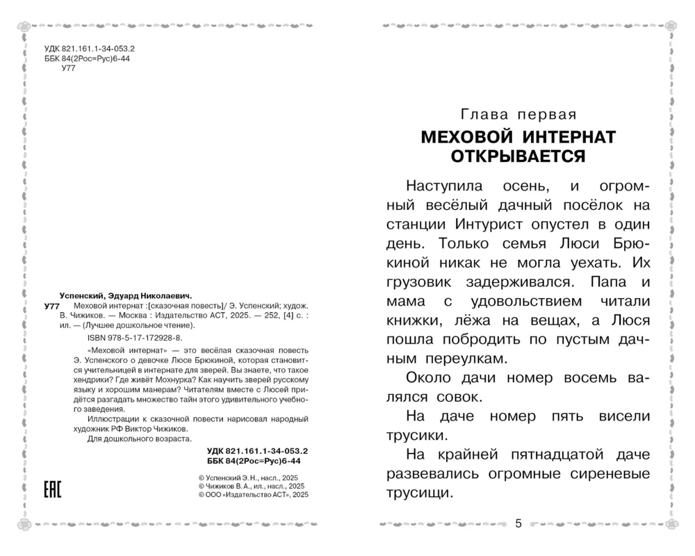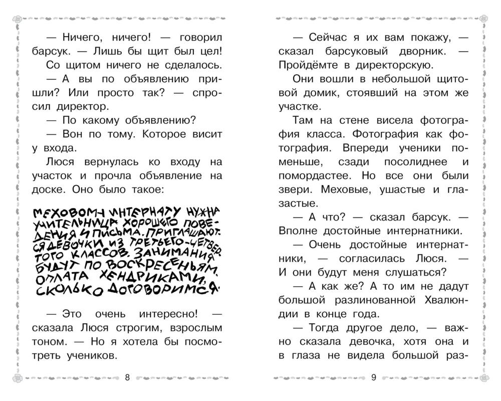 "Меховой интернат" – это весёлая сказочная повесть Э. Успенского о девочке Люсе Брюкиной, которая становится учительницей в интернате для зверей. Вы знаете, что такое хендрики? Где живёт Мохнурка? Как научить зверей русскому языку и хорошим манерам? Читателям вместе с Люсей придётся разгадать множество тайн этого удивительного учебного заведения.