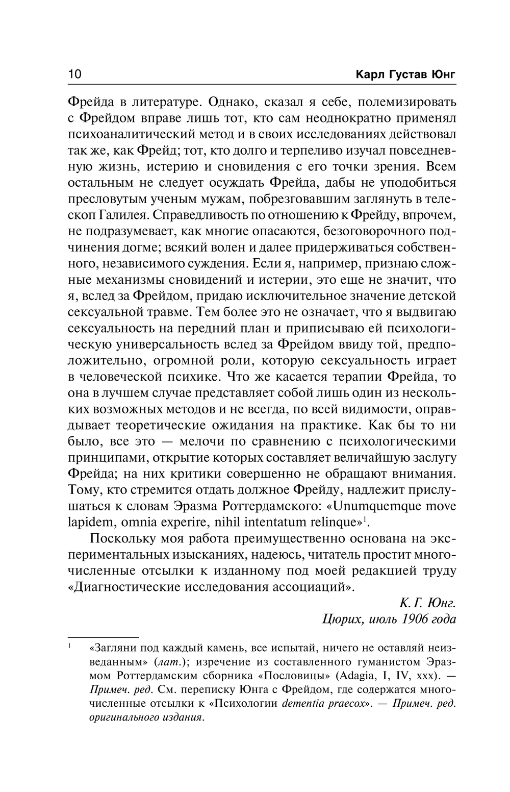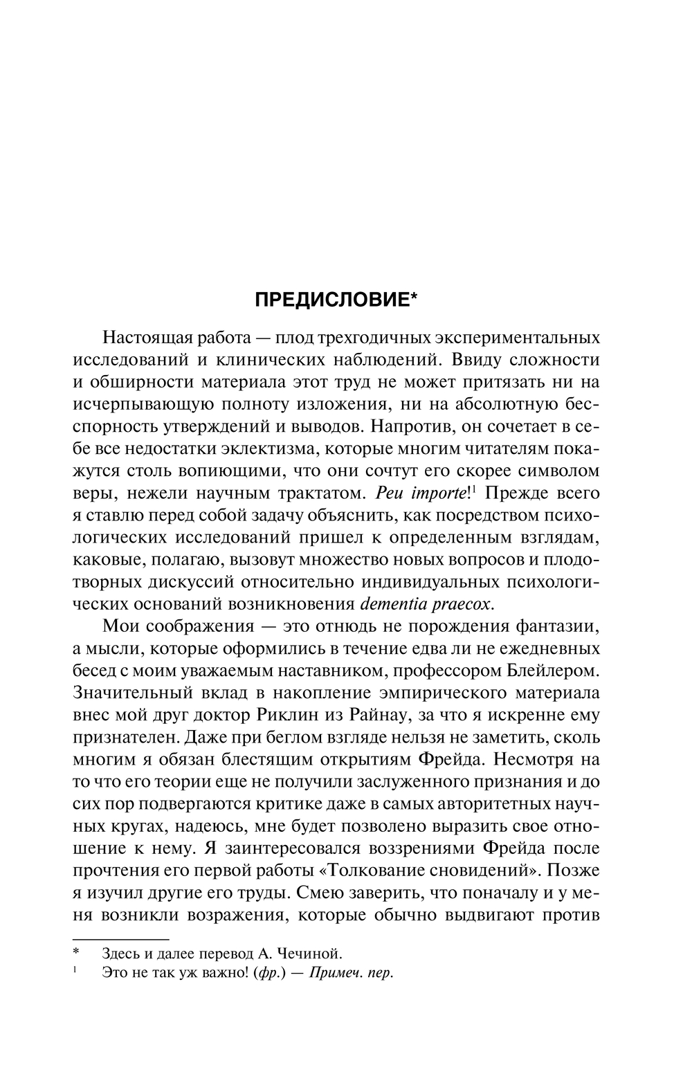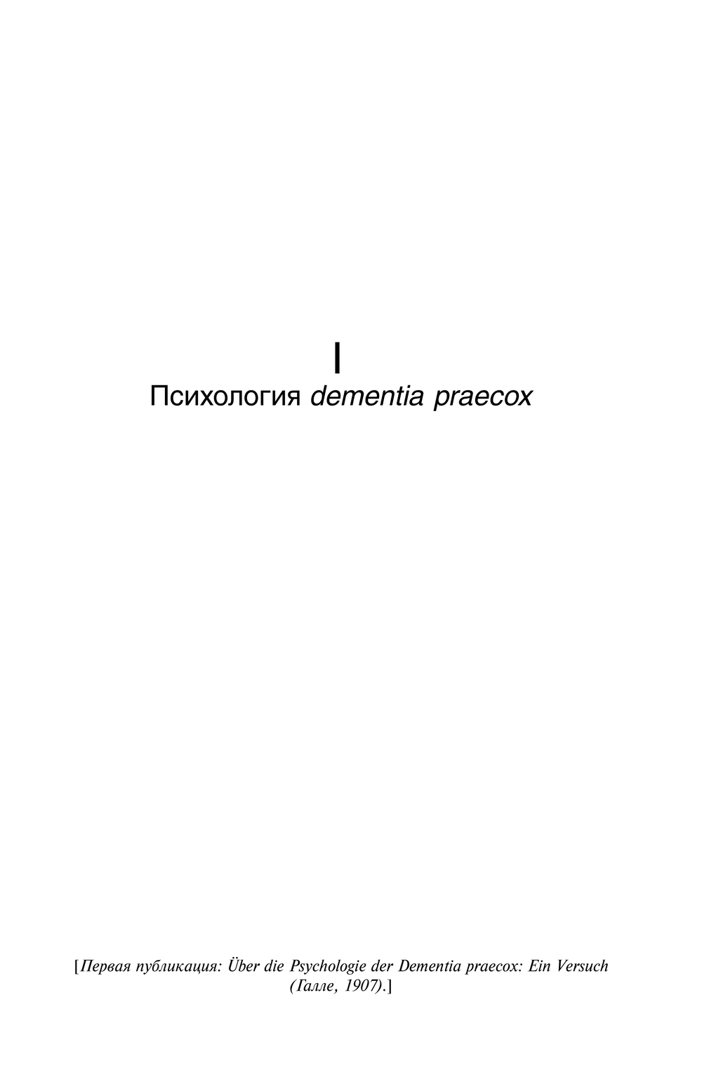 В открывающей сборник работе "Психология dementia praecox", посвященной психогенезу и особенностям течения шизофрении, Юнг обобщил результаты своих ранних исследований в клинике Бургхольцли, где он имел широкие возможности для изучения природы и проявлений психозов. Эта работа произвела большое впечатление на Зигмунда Фрейда и мгновенно ввела молодого ученого в круг признанных исследователей в области психиатрии. В дальнейшем Юнг неоднократно возвращался к теме психогенеза душевных болезней, пересматривая свои оценки и предложения с учетом новых исследований и накопленного опыта. Представленные в сборнике работы позволяют проследить динамику взглядов Юнга на этот вопрос на протяжении полувека – с 1907 по 1958 год.