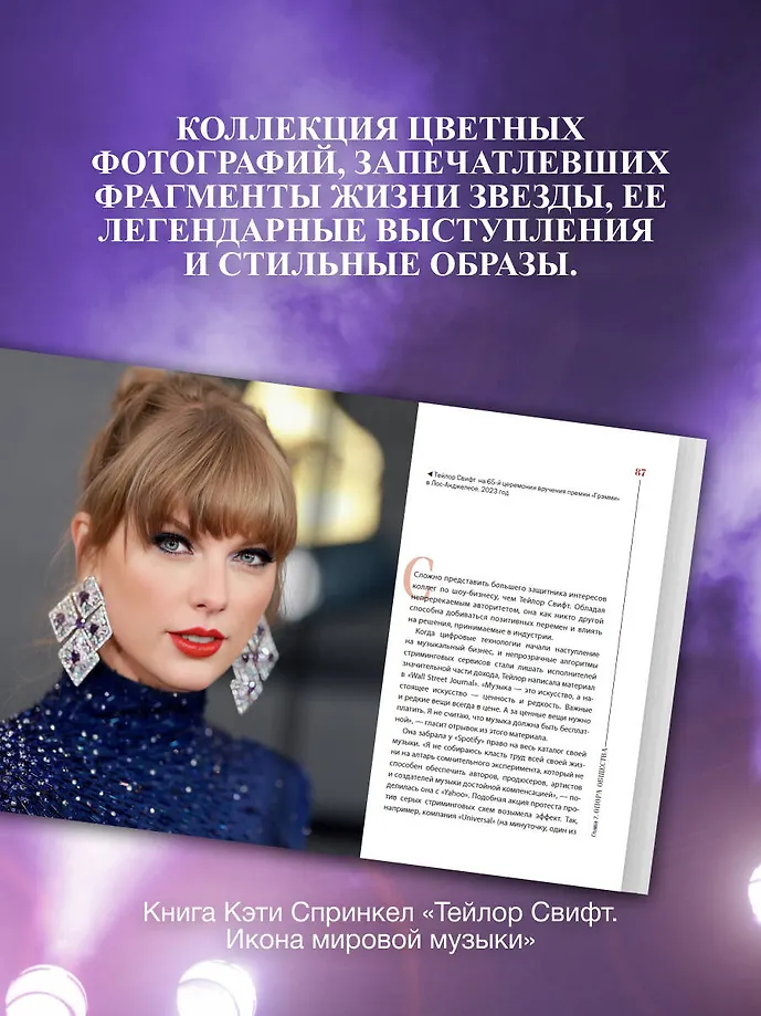 В этой книге музыкальный эксперт Кэти Спринкел рассказывает о детстве певицы и её пути к успеху, о разных этапах её творчества, о том, как она создаёт хиты, и о многом другом. Творец, новатор, лучшая подруга, законодатель мод – в каждой главе рассматривается одно из определений, которыми можно описать Тейлор. Все они складываются в единый портрет многогранной личности и блистательной певицы, которая по праву считается одной из величайших исполнительниц XXI века.