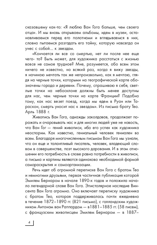 Спорить и говорить можно бесконечно, постоянно задаваясь вопросом: «почему мы снова и снова хотим знать о нем больше, отчего нас так трогает эта нервная и тревожная живопись, эти солнечные краски, эти порой неземные сюжеты? Вот уж поистине можно поверить Морису Вламинку, сказавшему как-то: "Я люблю Ван Гога, больше чем своего отца". И мы вновь открываем альбомы, идем в музеи, останавливаемся перед его полотнами и вглядываемся в них, словно пытаемся разгадать его тайну, которую навсегда он унес с собой… к звездам.