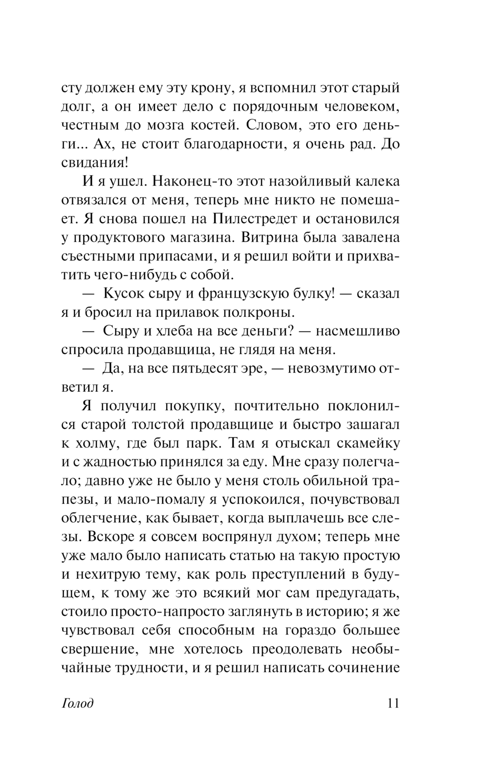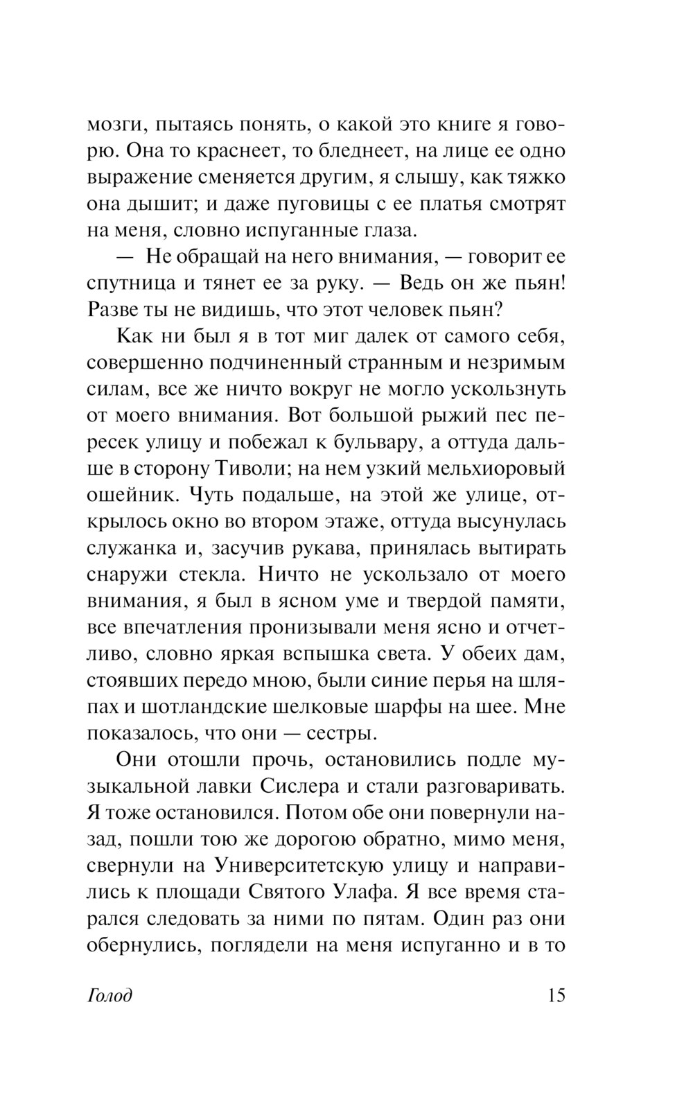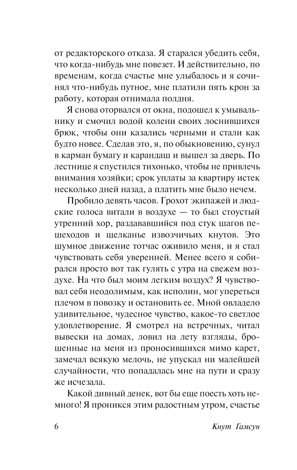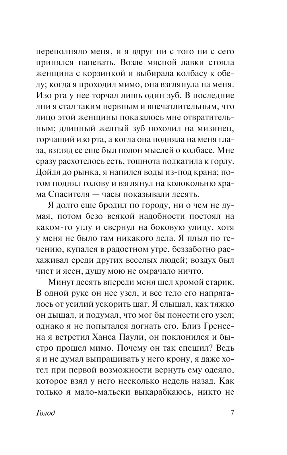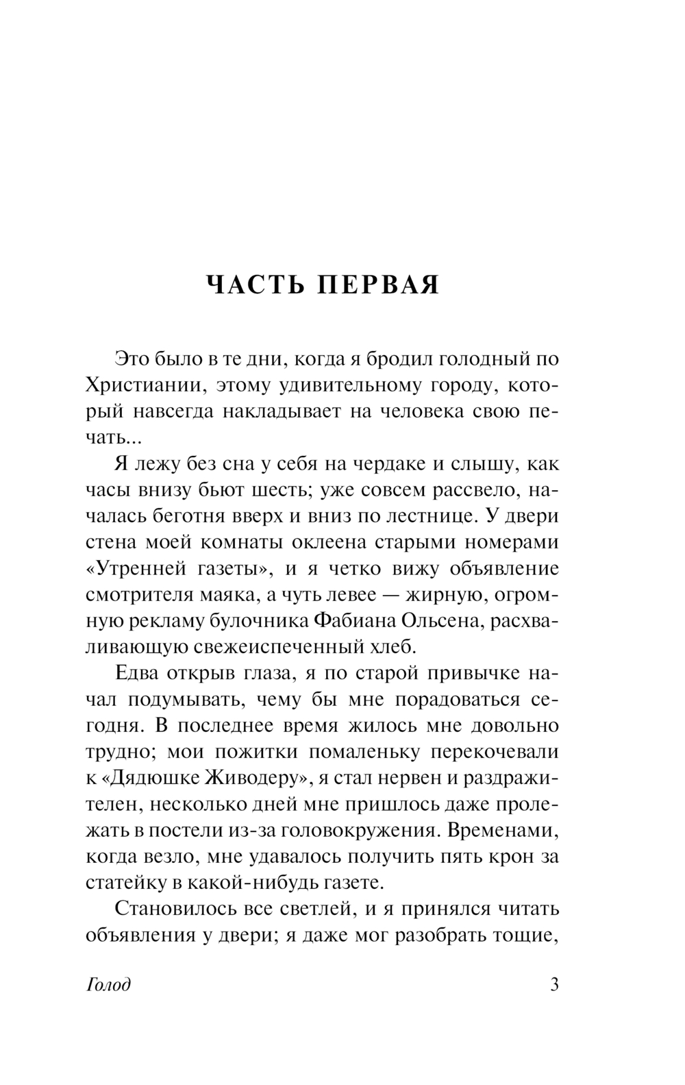 "Голод" (1890) – во многом автобиографичный роман Кнута Гамсуна, принесший автору мировую славу. Страшная в своей простоте история молодого непризнанного писателя, день за днем балансирующего на грани голодной смерти. Реальность и причудливые, болезненные фантазии переплетаются в его сознании, мучительно переживающем несоответствие между идеальным и материальным миром...
