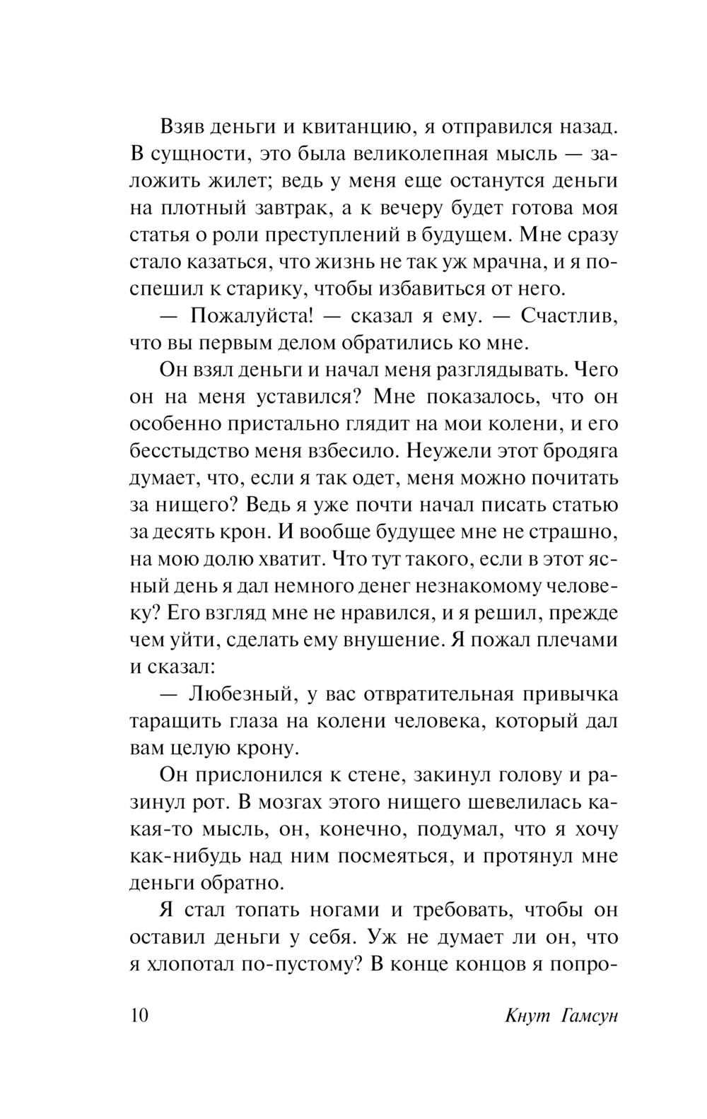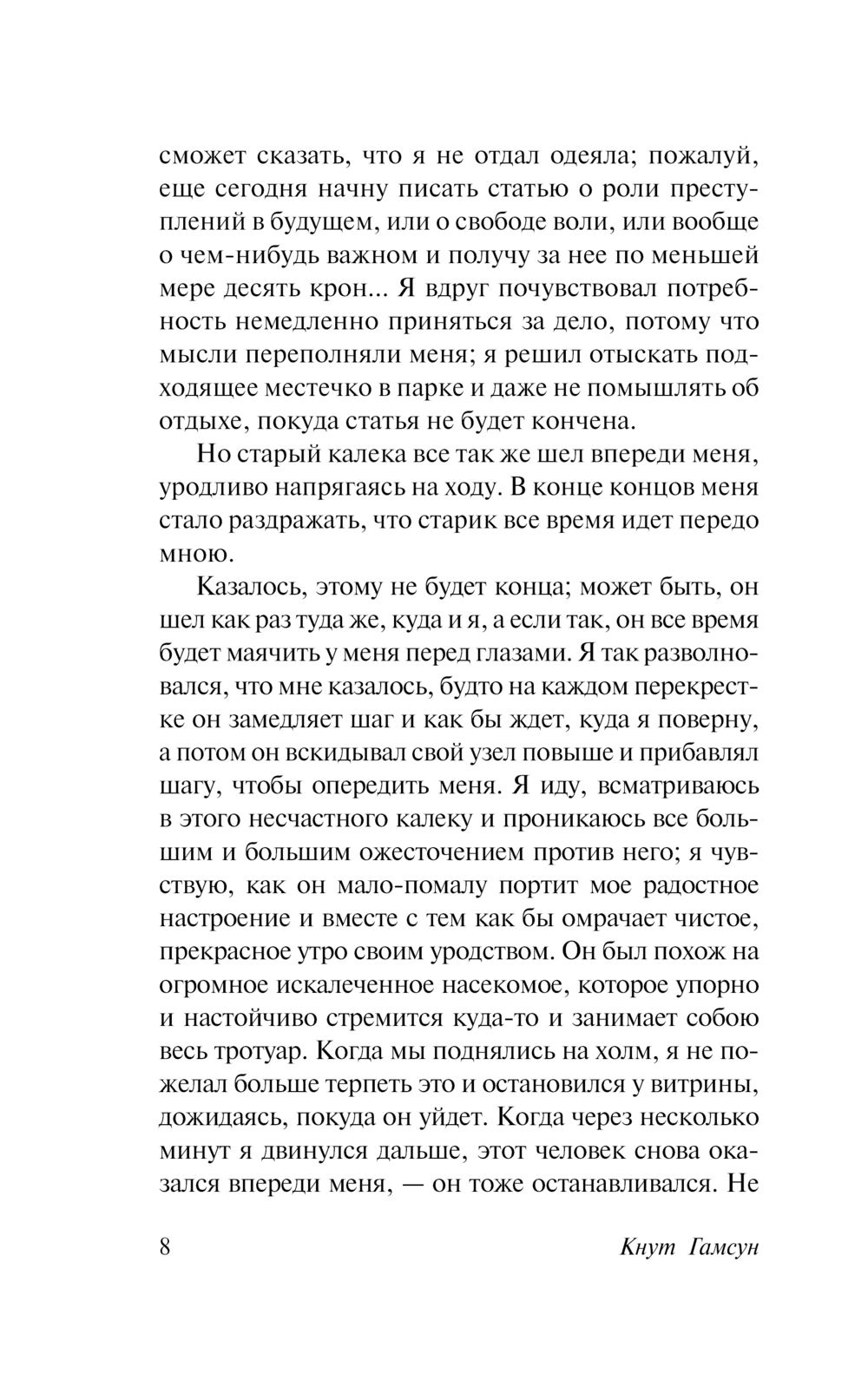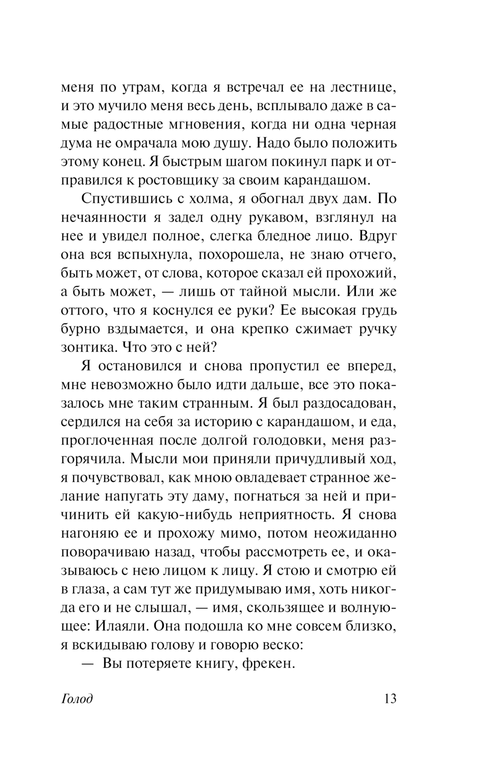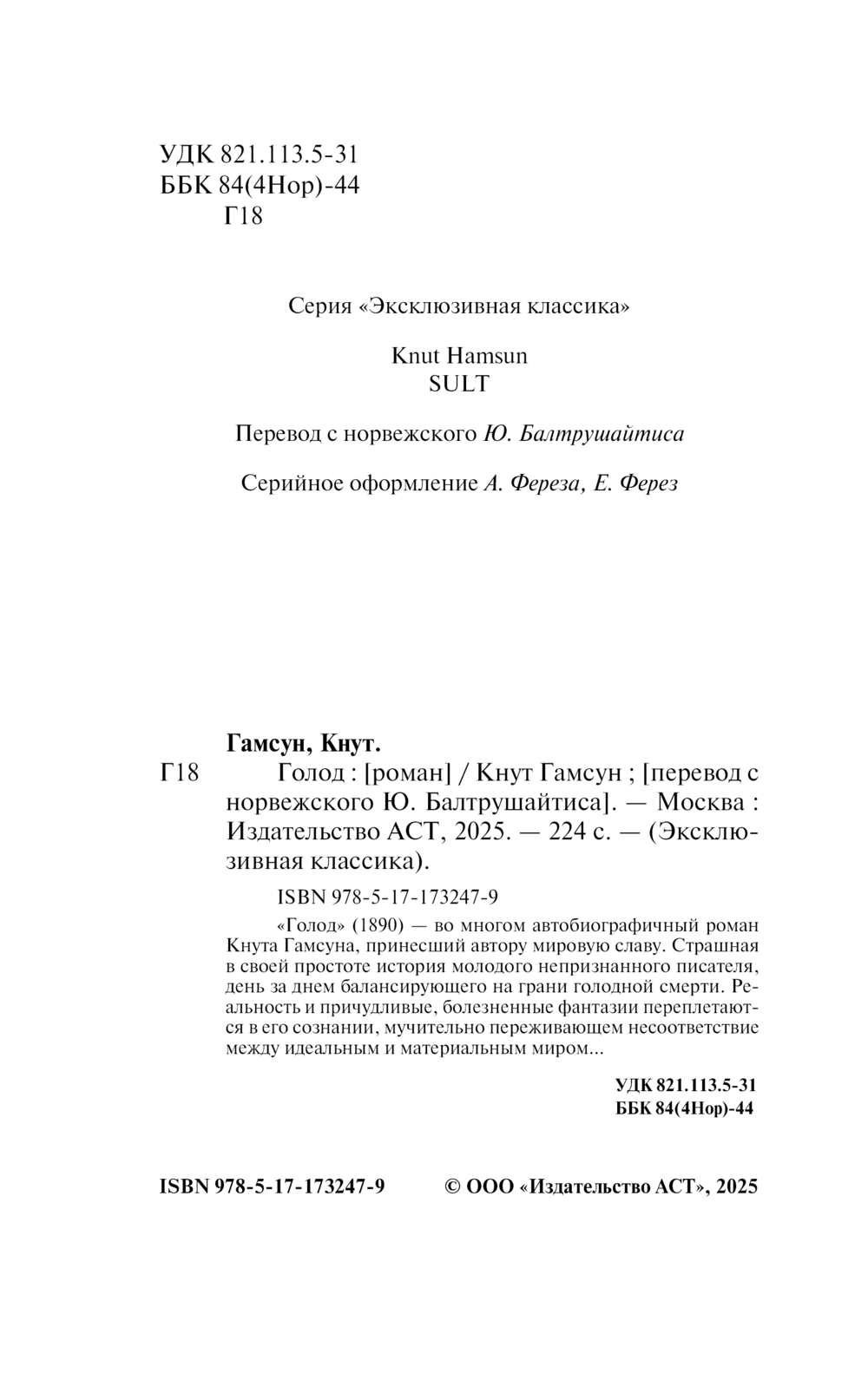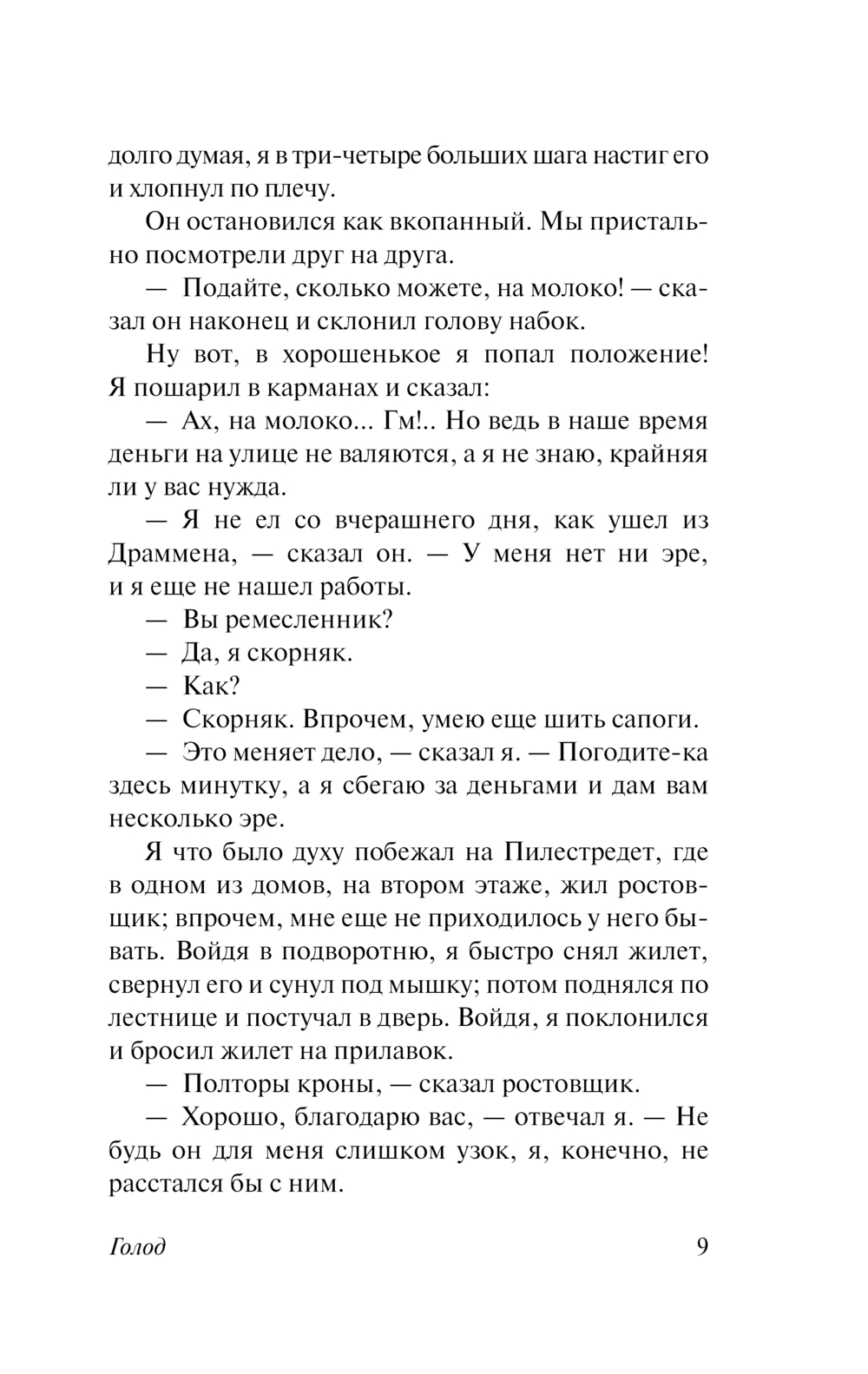 "Голод" (1890) – во многом автобиографичный роман Кнута Гамсуна, принесший автору мировую славу. Страшная в своей простоте история молодого непризнанного писателя, день за днем балансирующего на грани голодной смерти. Реальность и причудливые, болезненные фантазии переплетаются в его сознании, мучительно переживающем несоответствие между идеальным и материальным миром...