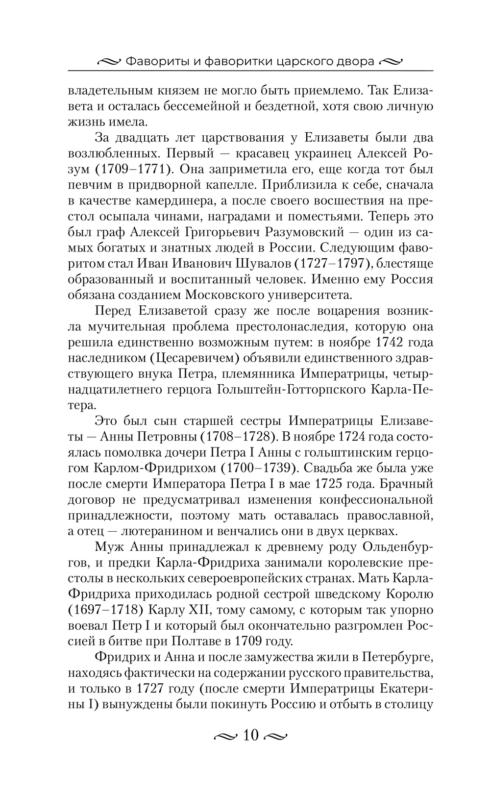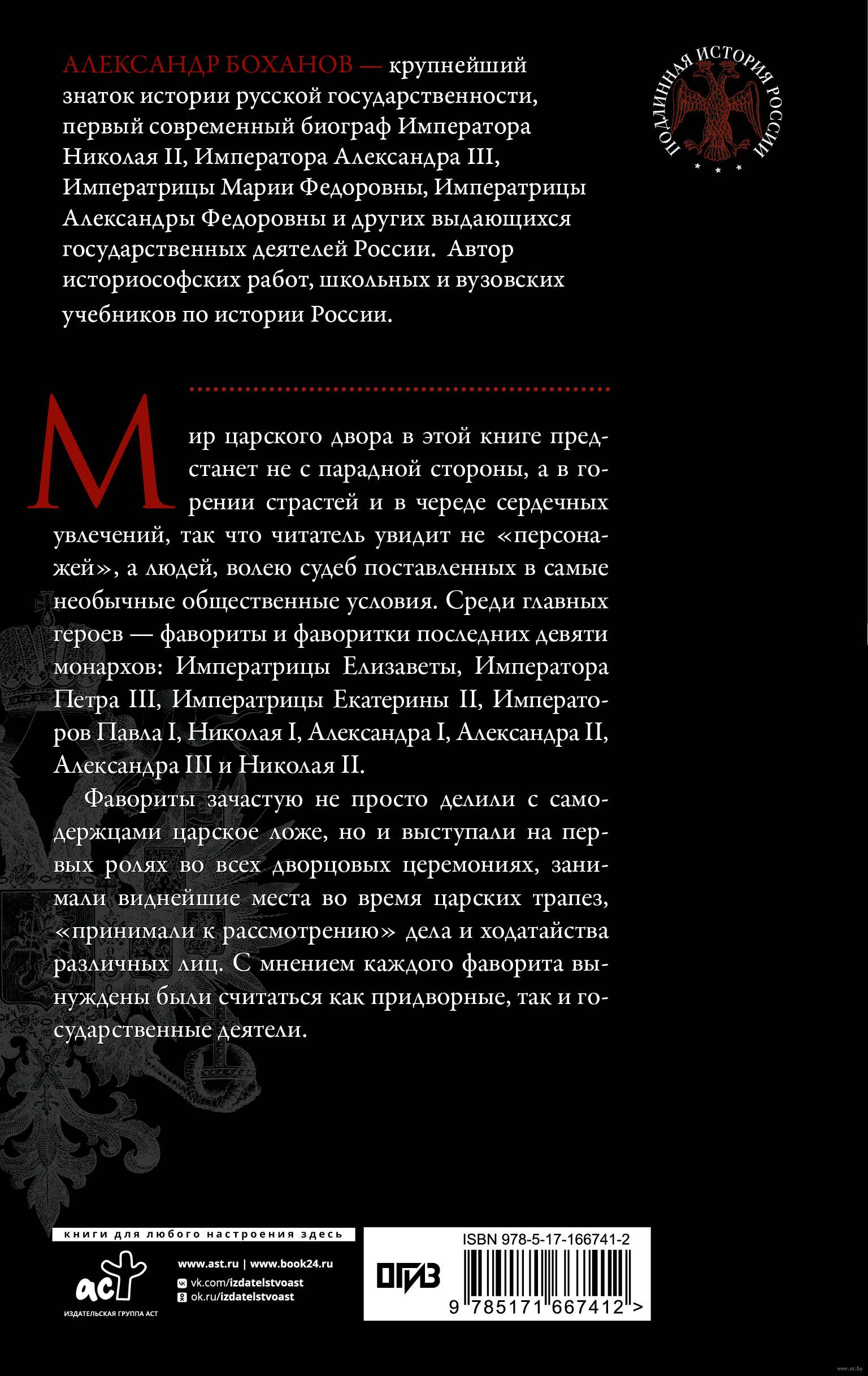 В данной книге профессиональный историк, крупнейший специалист по династии Романовых, правившей в России более 300 лет, представляет рассказ об эпизодах русской истории, не получивших пока широкой известности. Мир царского двора предстанет не с парадной стороны, а в горении страстей, в череде сердечных увлечений, так что читатель увидит не "персонажей", а людей, волею судеб поставленных в самые необычные общественные условия. Среди главных героев – фавориты и фаворитки последних девяти монархов: Императрицы Елизаветы, Императора Петра III, Императрицы Екатерины II, Императоров Павла I, Николая I, Александра I, Александра II, Александра III и Николая II. Фавориты зачастую не просто делили с самодержцами царское ложе, но и выступали на первых ролях во всех дворцовых церемониях, занимали виднейшие места во время царских трапез, «принимали к рассмотрению» дела и ходатайства различных лиц. С мнением каждого фаворита вынуждены были считаться как придворные, так и государственные деятели.