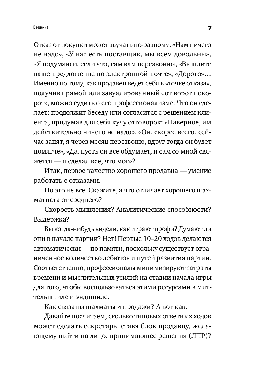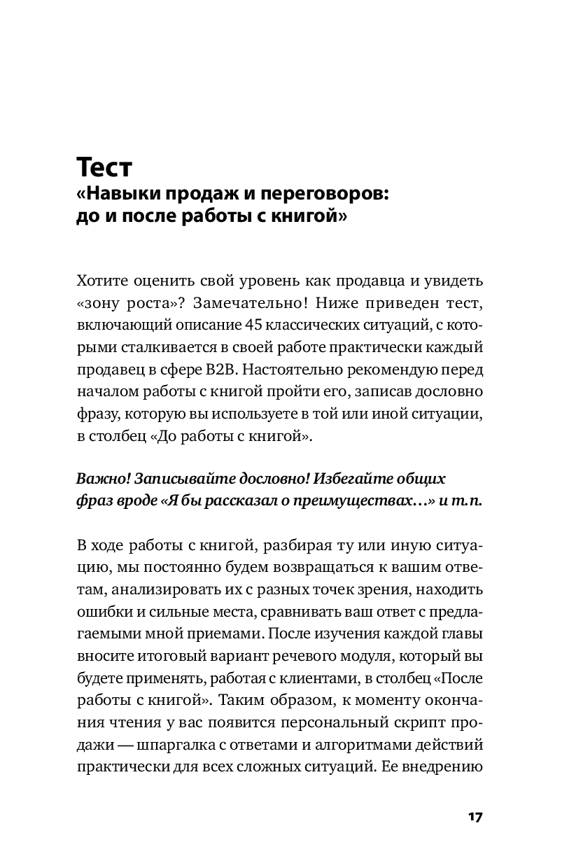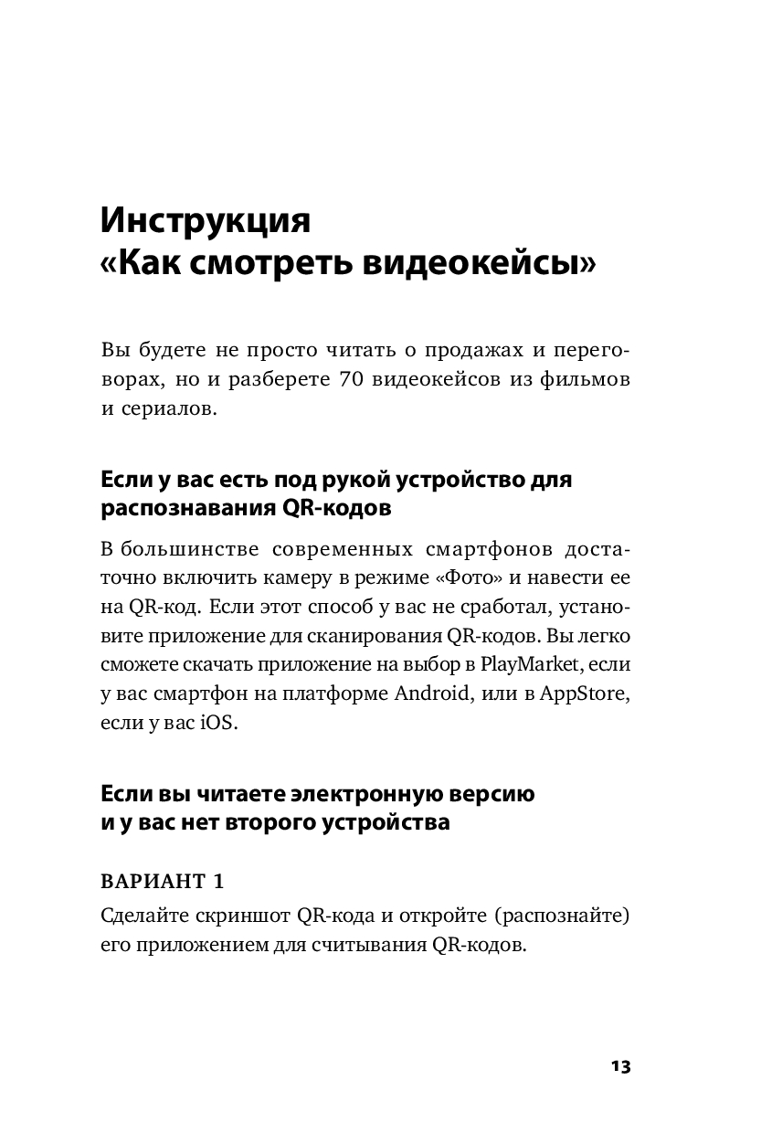 Книга построена, как практикум – в начале работы с ней вы оцените свои навыки продаж и увидите зону роста, а в ходе чтения выберите приемы и методы, подходящие именно под ваш уникальный стиль продаж. Фишкой книги является ее интерактивность – вы будете не только читать о продажах, но и разберете 70 видеокейсов из фильмов и сериалов, а давая свой вариант в предлагаемых переговорных кейсах, увидите свою зону ближайшего развития.