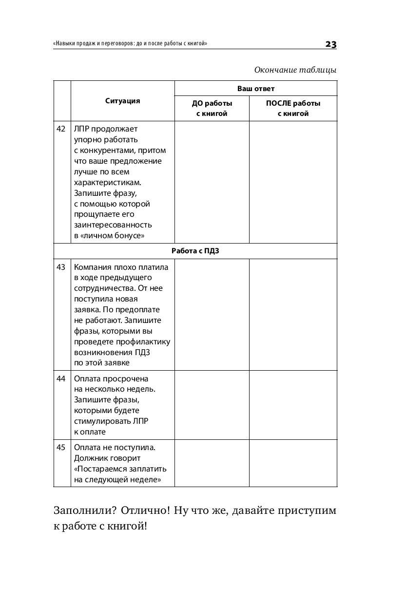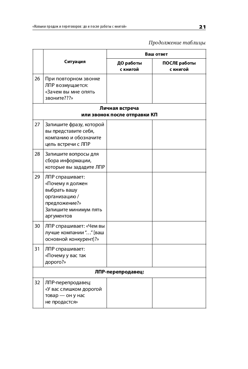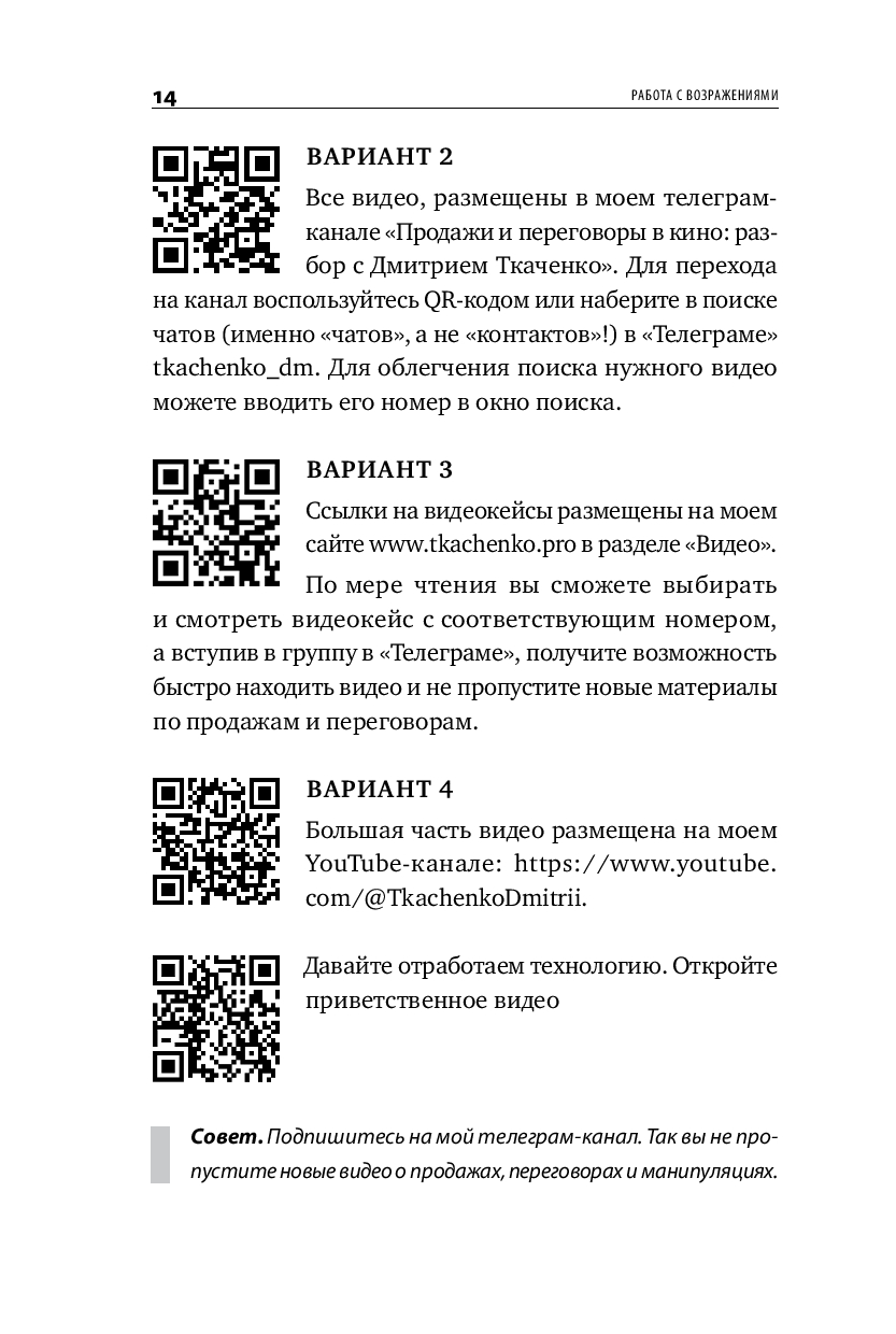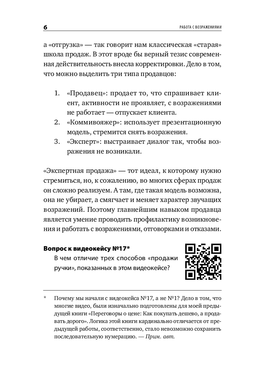 Книга построена, как практикум – в начале работы с ней вы оцените свои навыки продаж и увидите зону роста, а в ходе чтения выберите приемы и методы, подходящие именно под ваш уникальный стиль продаж. Фишкой книги является ее интерактивность – вы будете не только читать о продажах, но и разберете 70 видеокейсов из фильмов и сериалов, а давая свой вариант в предлагаемых переговорных кейсах, увидите свою зону ближайшего развития.