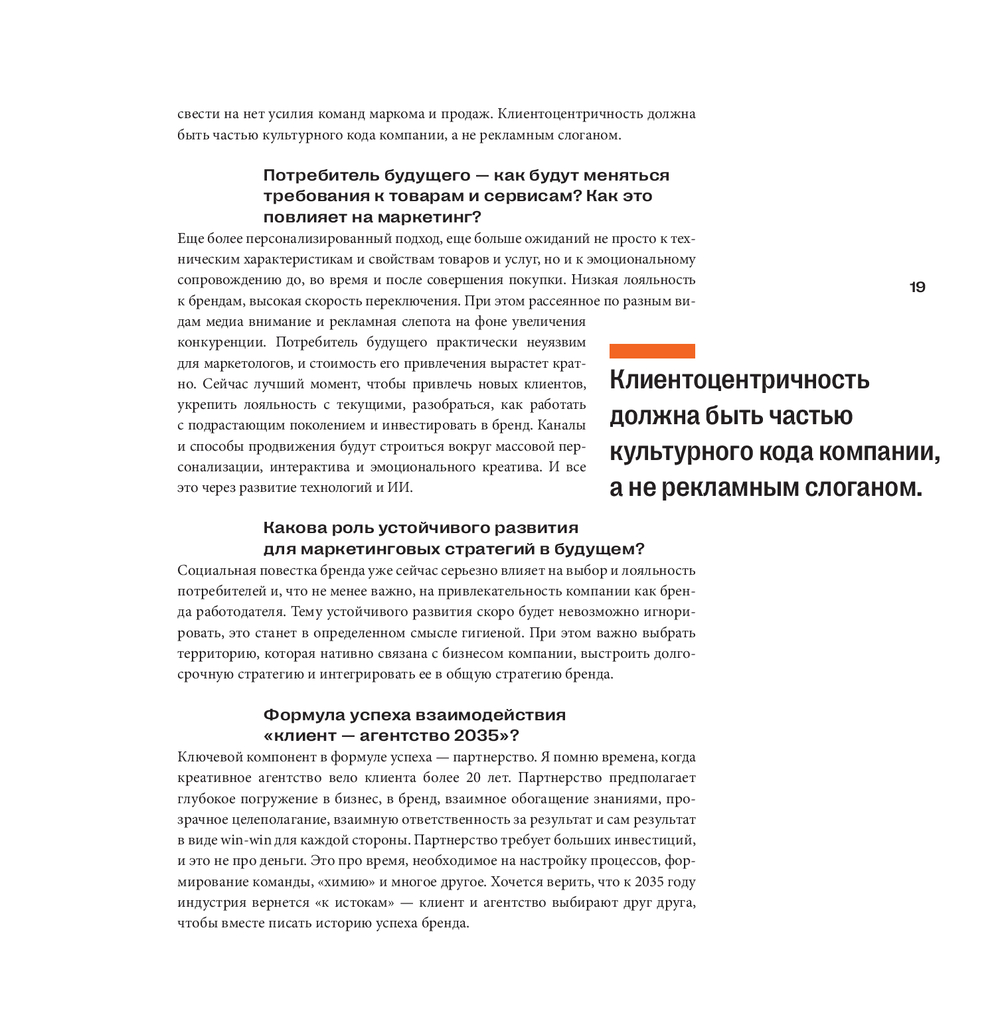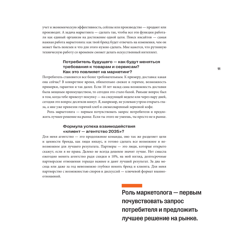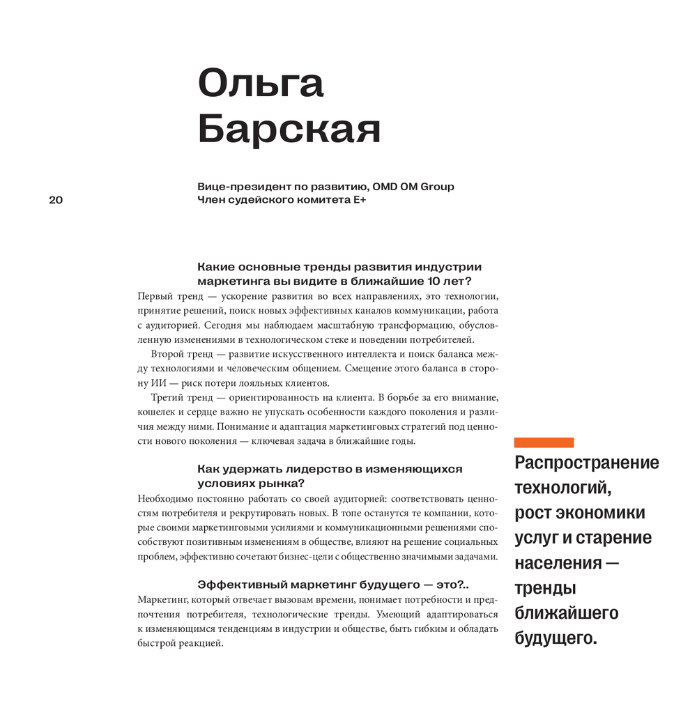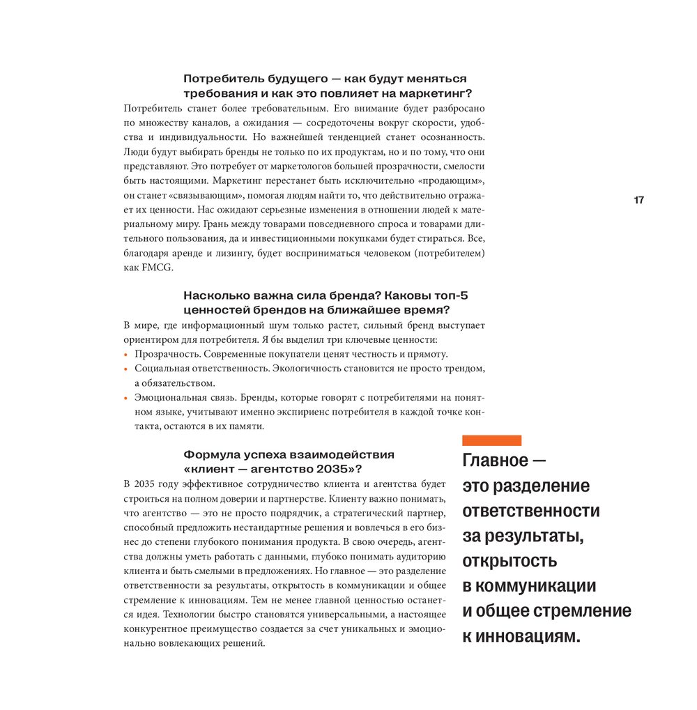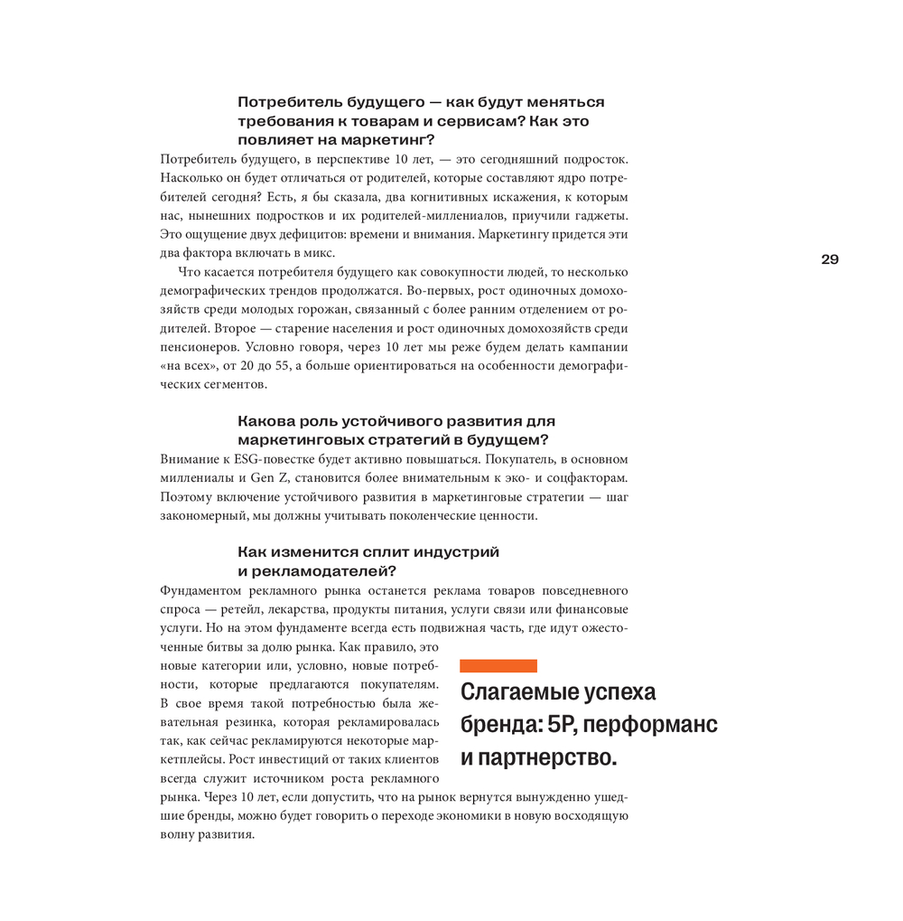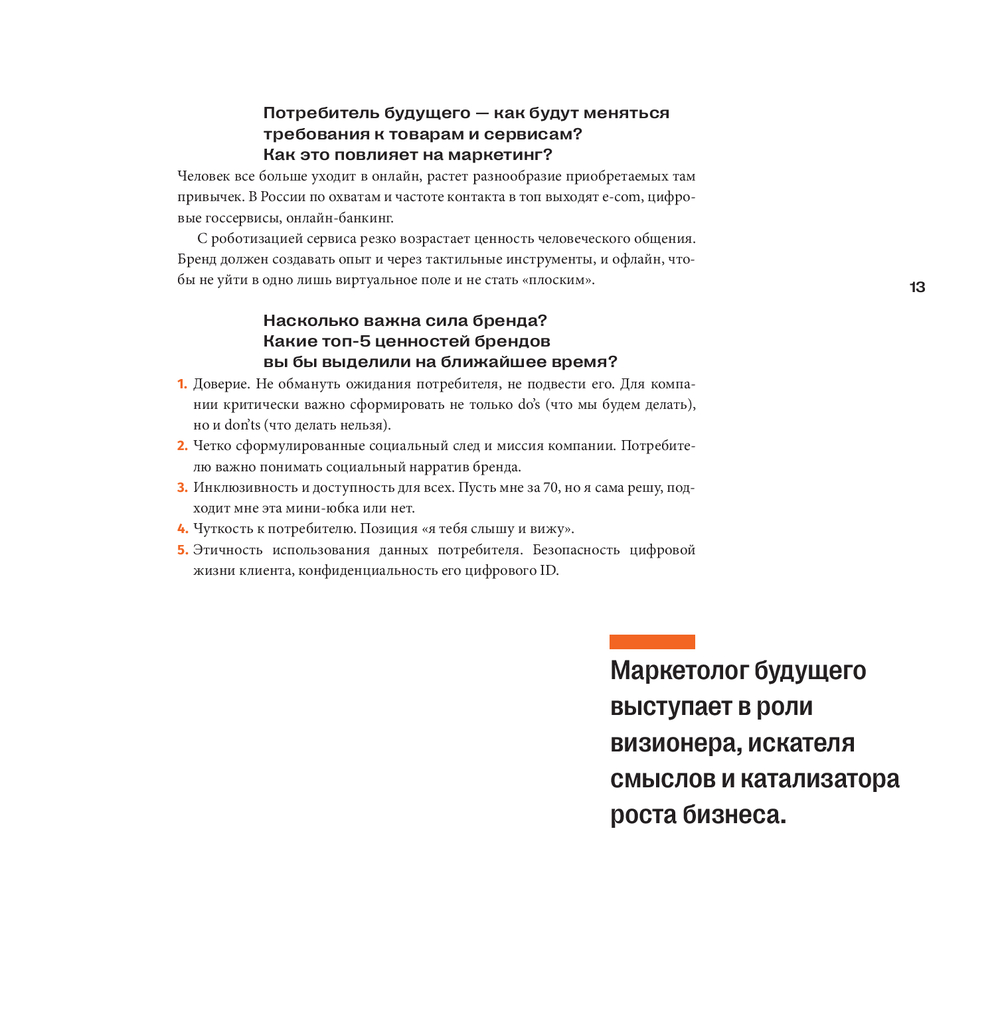 Книга охватывает различные отрасли и направления маркетинга, от FMCG и ретейла до финансов и IT, а также включает 20 интервью с ведущими экспертами отрасли, которые делятся своими визионерскими взглядами на будущее маркетинга.