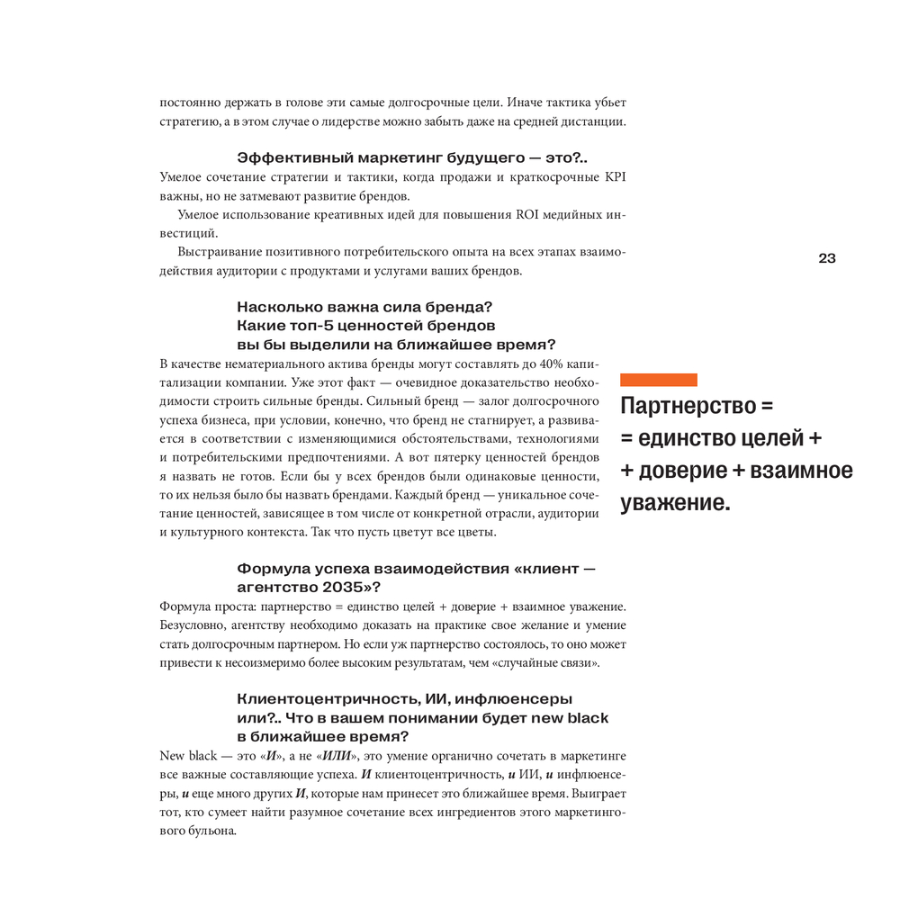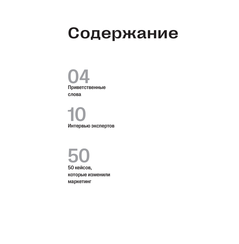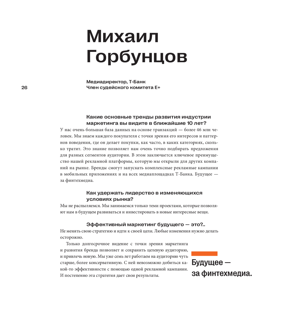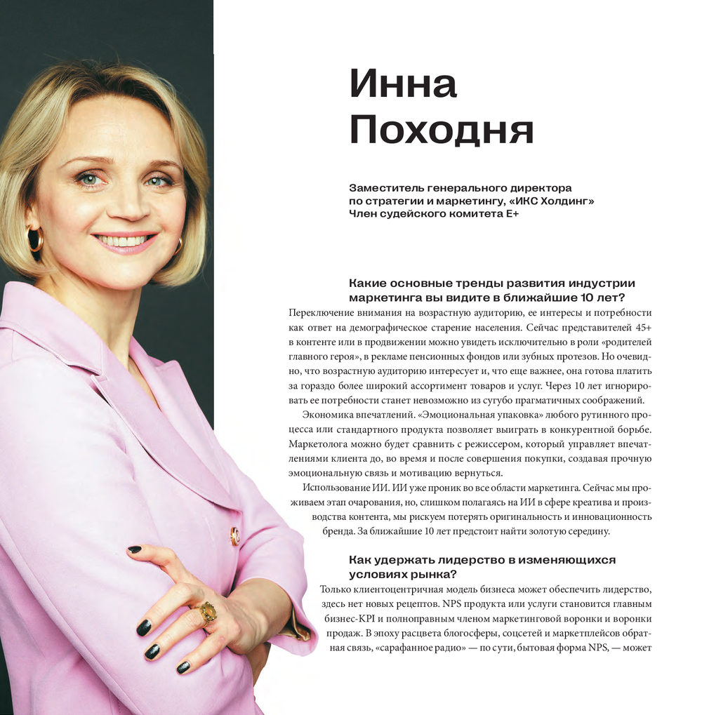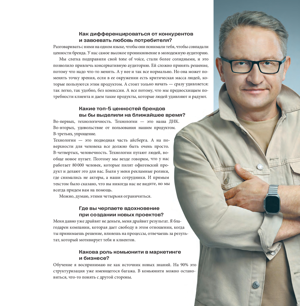 Книга охватывает различные отрасли и направления маркетинга, от FMCG и ретейла до финансов и IT, а также включает 20 интервью с ведущими экспертами отрасли, которые делятся своими визионерскими взглядами на будущее маркетинга.