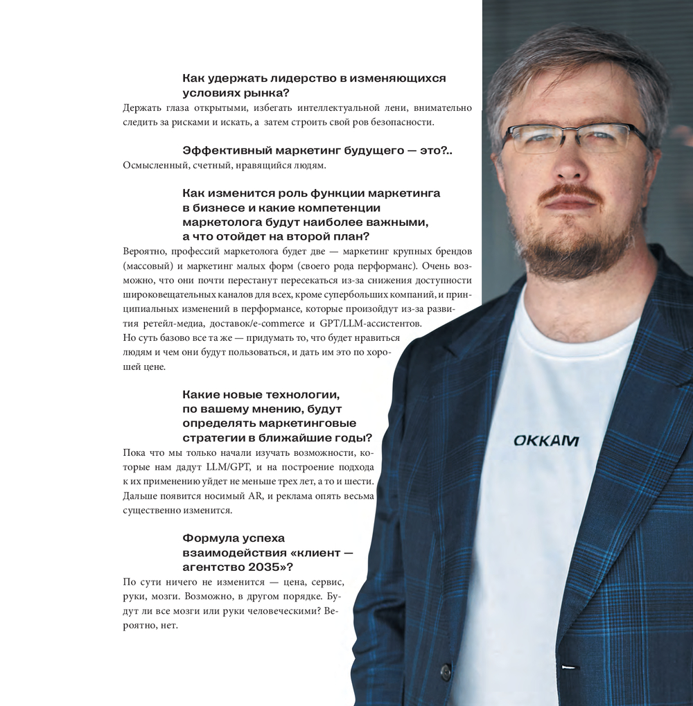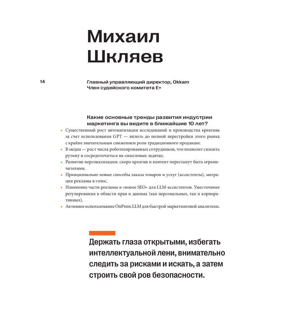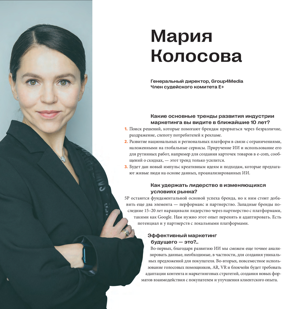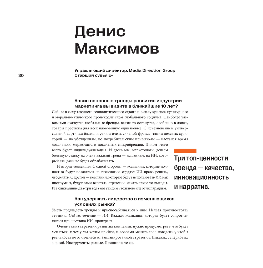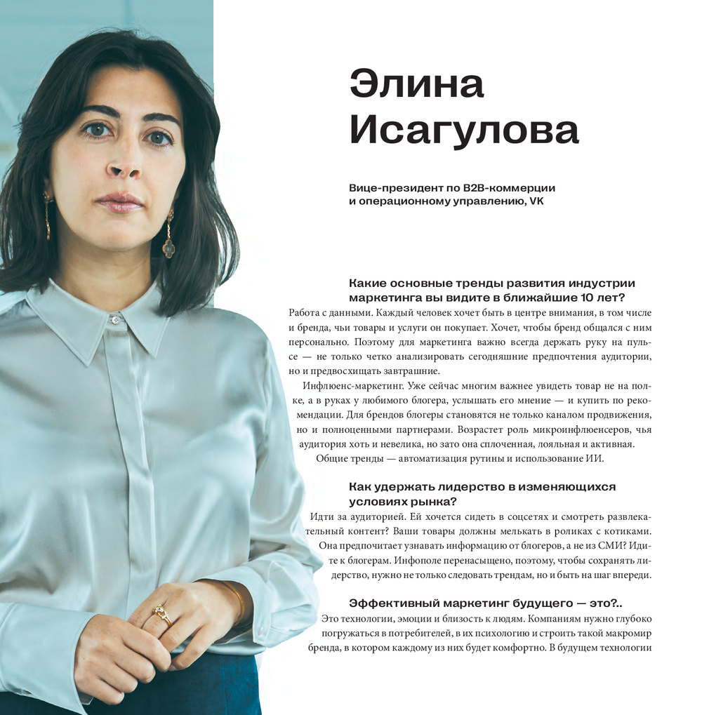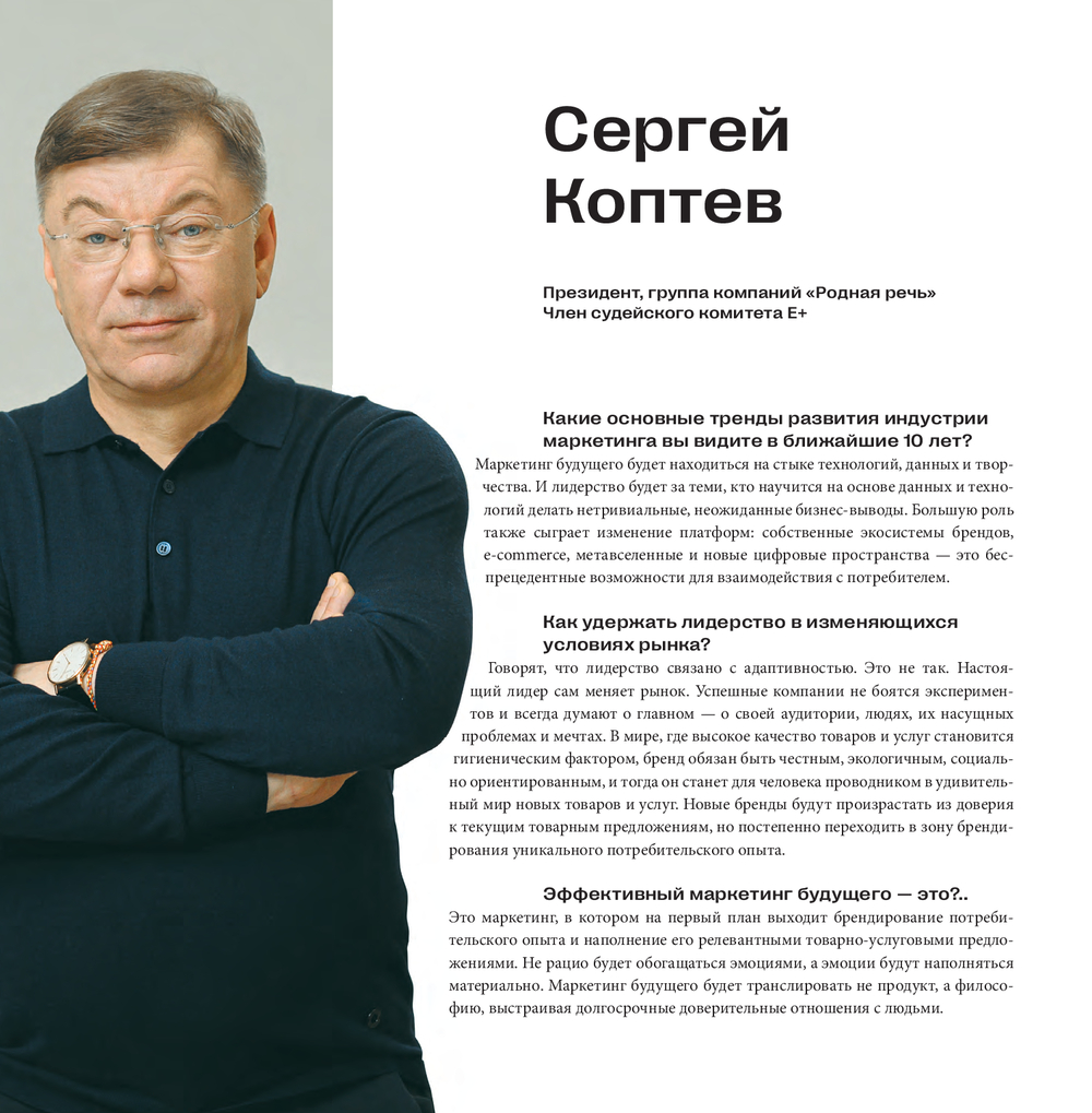 Книга охватывает различные отрасли и направления маркетинга, от FMCG и ретейла до финансов и IT, а также включает 20 интервью с ведущими экспертами отрасли, которые делятся своими визионерскими взглядами на будущее маркетинга.