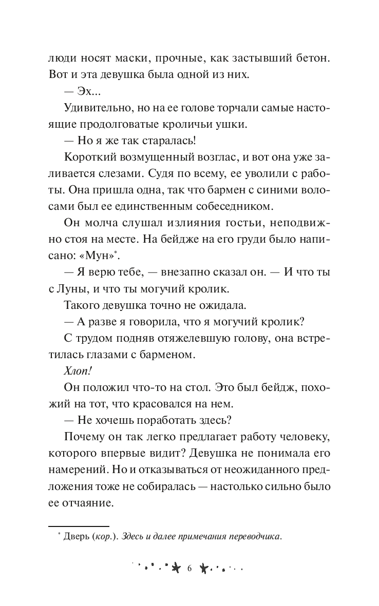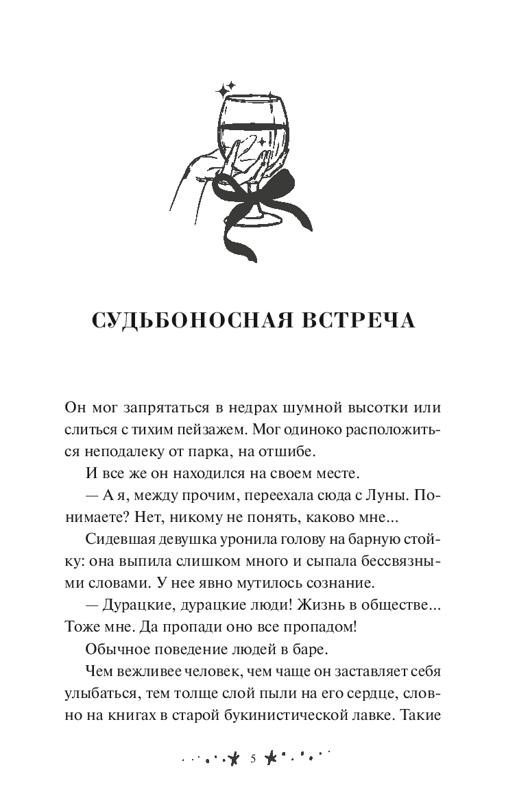 Не бывает жизни без историй – и не бывает историй без книг. Все человеческие истории хранятся в огромной космической библиотеке, и менять их сюжет строго запрещено. Но что, если один хранитель библиотеки пойдет против правил и откроет особое заведение, где каждый сможет переписать историю собственной жизни?.. Если вы живете в тоске по утраченному времени... Если упустили безграничное счастье... Если раз за разом совершали неправильный выбор... Добро пожаловать в книжный бар "Переплет судьбы"!