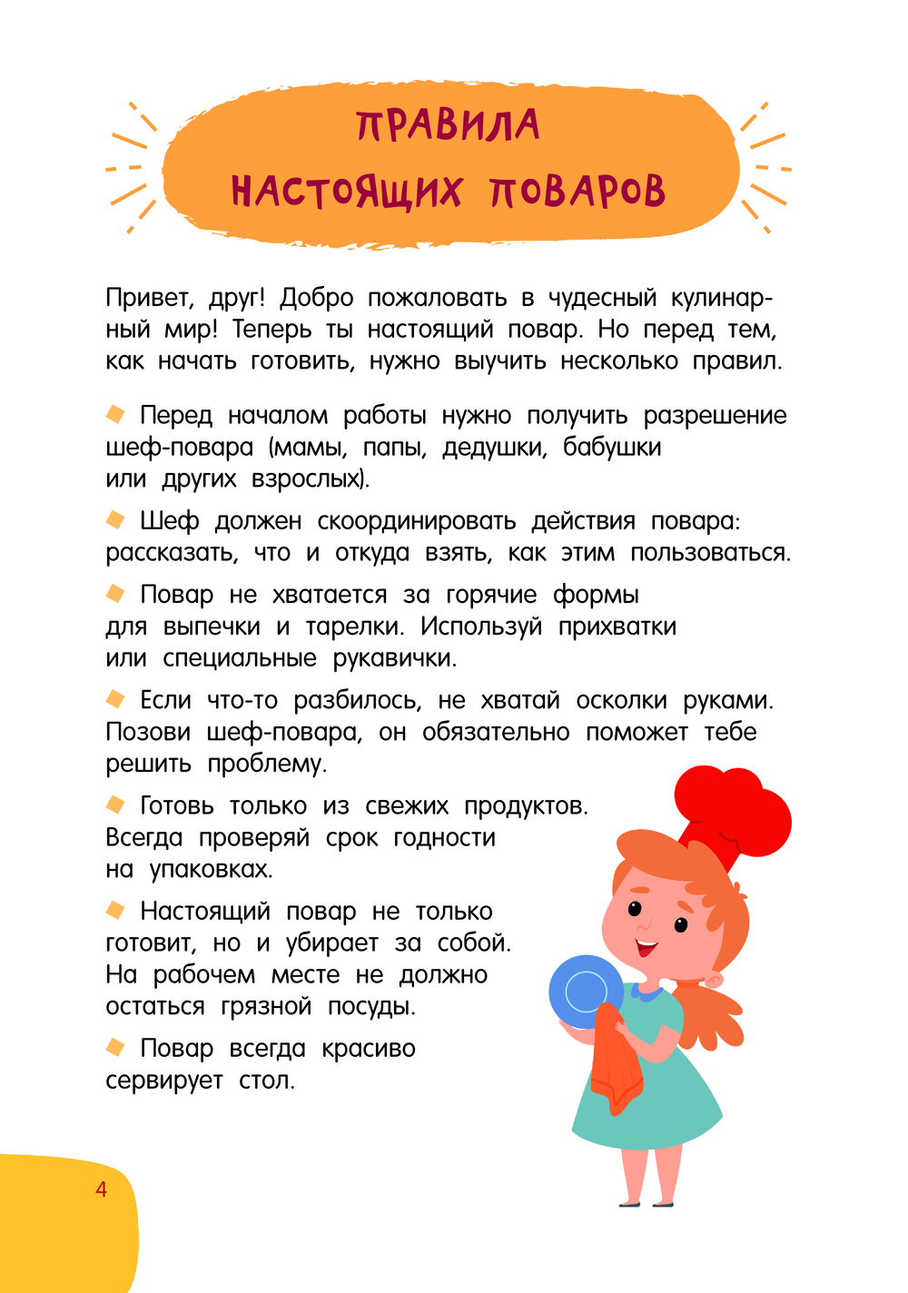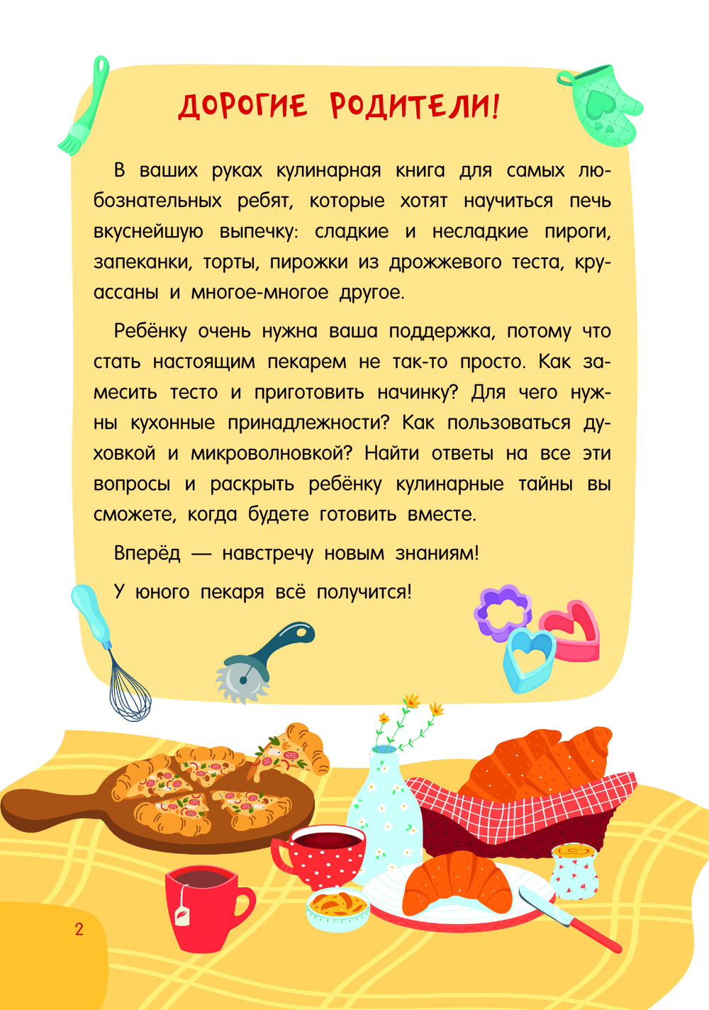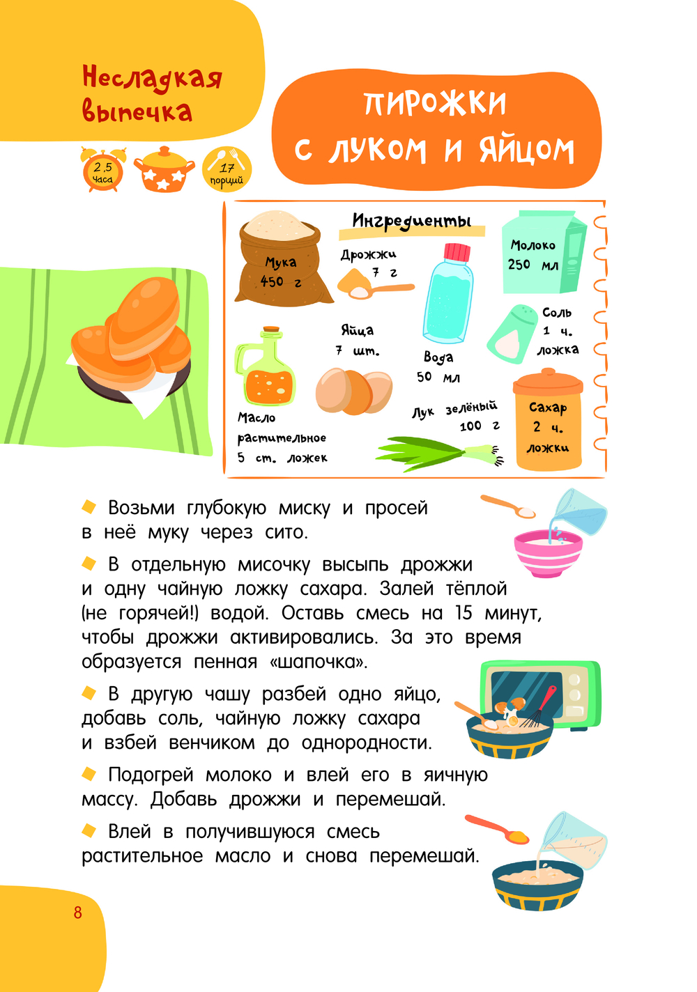 "Вкусная выпечка: готовлю сам без мамы" – настоящая находка для юных пекарей и их родителей. Это очень удобная книга на спирали – страницы легко перекидываются из стороны в сторону, открываясь на 360 градусов. Под обложкой ребёнок найдёт множество рецептов с пошаговым описанием: запеканки, пироги, печенье, торты, круассаны и многое-многое другое. В книге яркие иллюстрации, выполненные в стиле современных мультфильмов: помогать ребёнку будут весёлые персонажи – звери, волшебные существа и герои сказок.