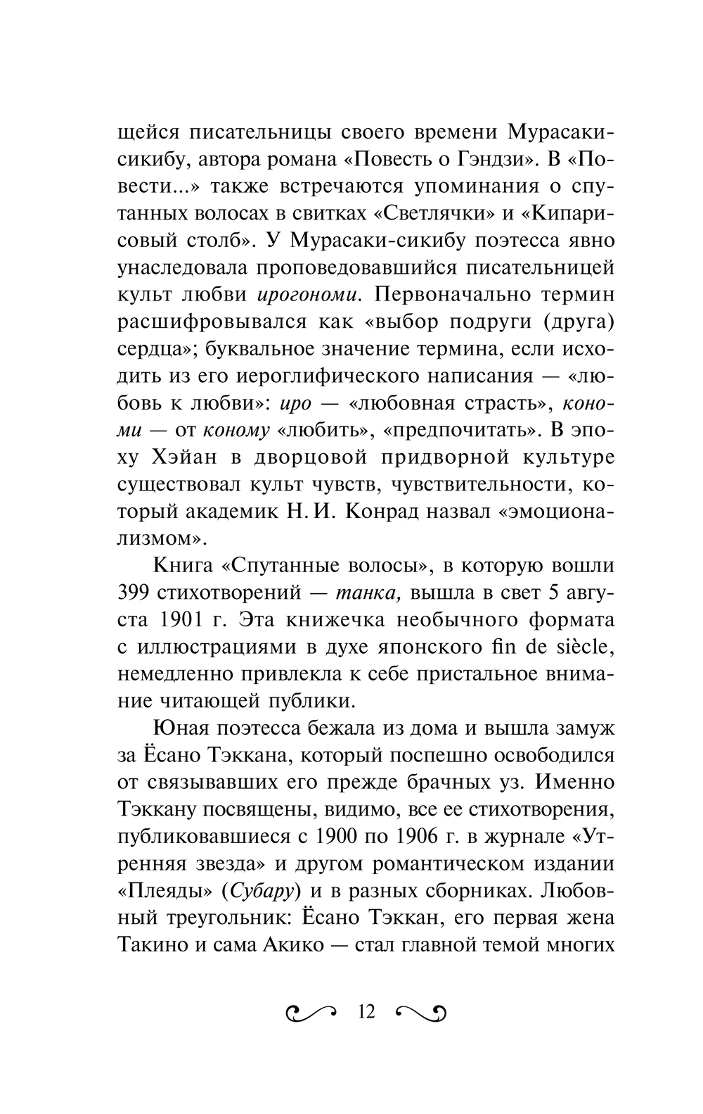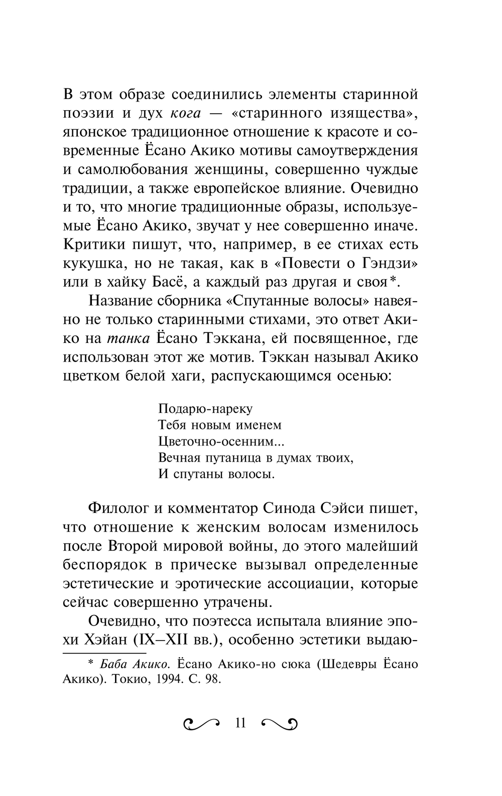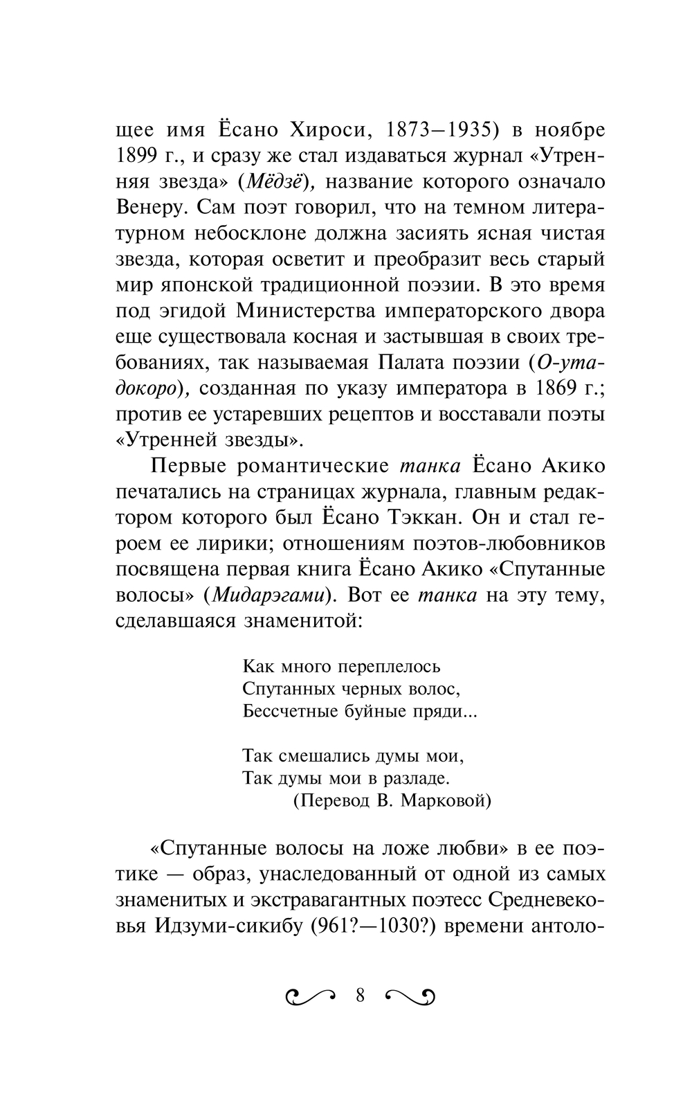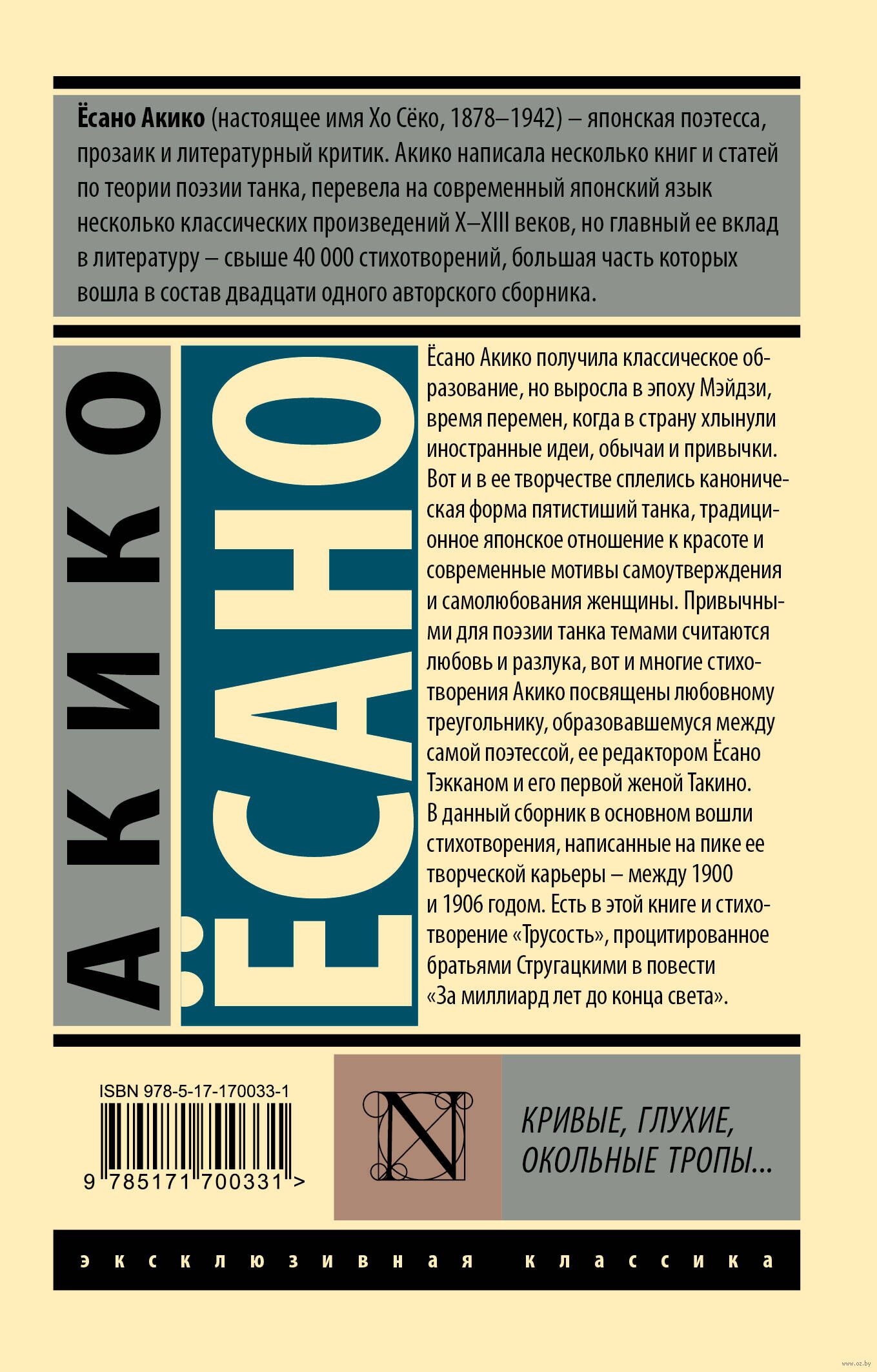 Ёсано Акико получила классическое образование, но выросла в эпоху Мэйдзи, время перемен, когда в страну хлынули иностранные идеи, обычаи и привычки. Вот и в ее творчестве сплелись каноническая форма пятистиший танка, традиционное японское отношение к красоте и современные мотивы самоутверждения и самолюбования женщины. Привычными для поэзии танка темами считаются любовь и разлука, вот и многие стихотворения Акико посвящены любовному треугольнику, образовавшемуся между самой поэтессой, ее редактором Ёсано Тэкканом и его первой женой Такино.