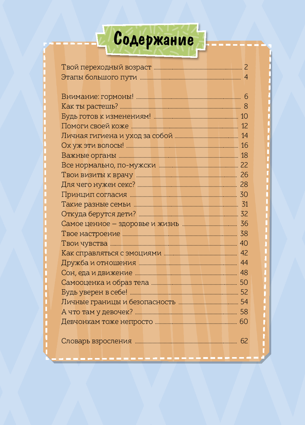 Взрослеть – круто и очень увлекательно! Но также волнительно и страшно. Зная, что тебя ждет в подростковом возрасте, подготовиться к переменам проще, а прожить переходный период – комфортнее. Эта книга затрагивает многие темы, на которые стесняются говорить взрослые. Что такое гормоны, что делать с волосами на лице и почему меняется голос, что такое "эрекция" и как ухаживать за лицом и телом? Откровенный разговор и полезные советы помогут мальчикам помогут подготовиться к изменениям и чувствовать себя увереннее в переходном возрасте.