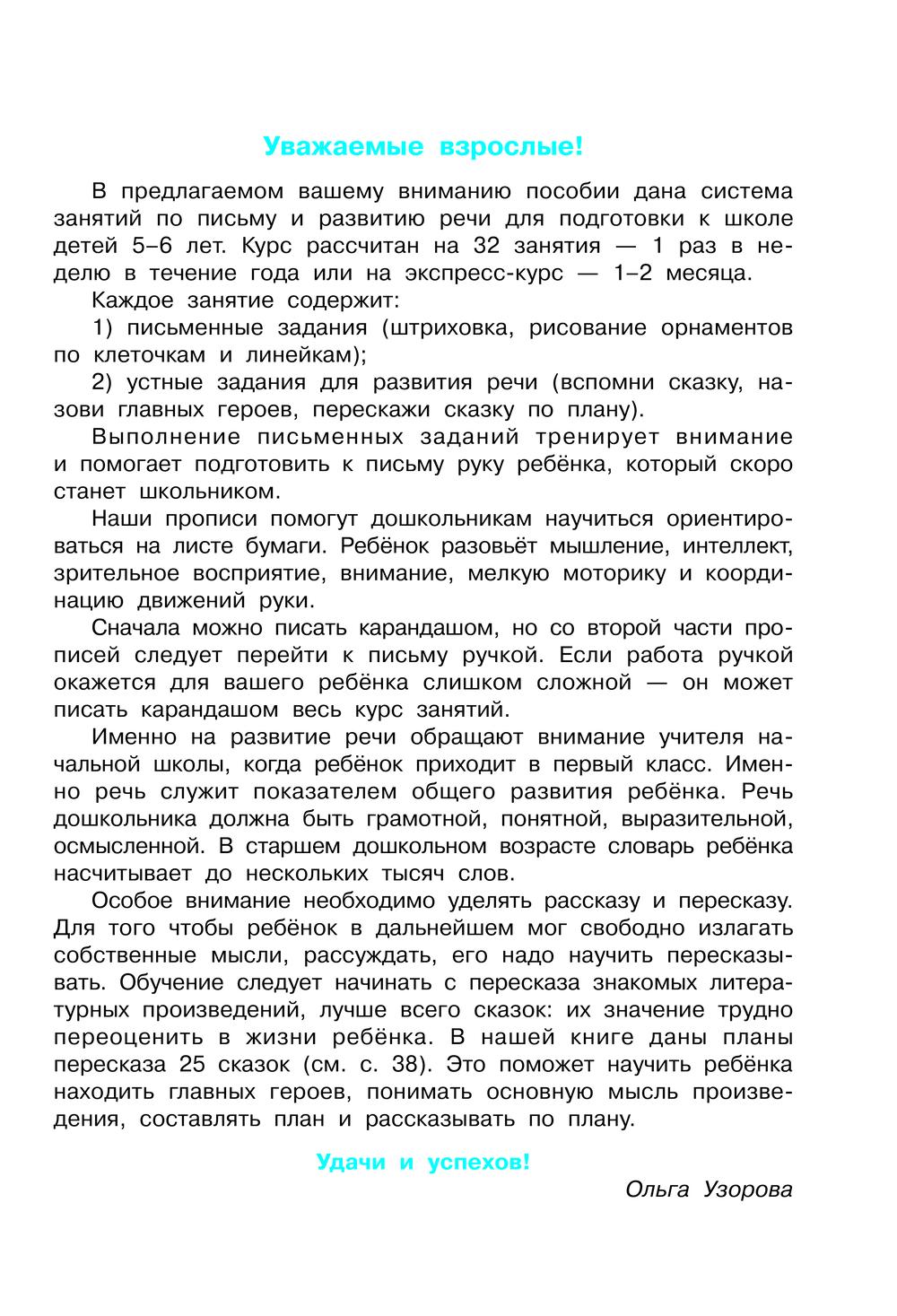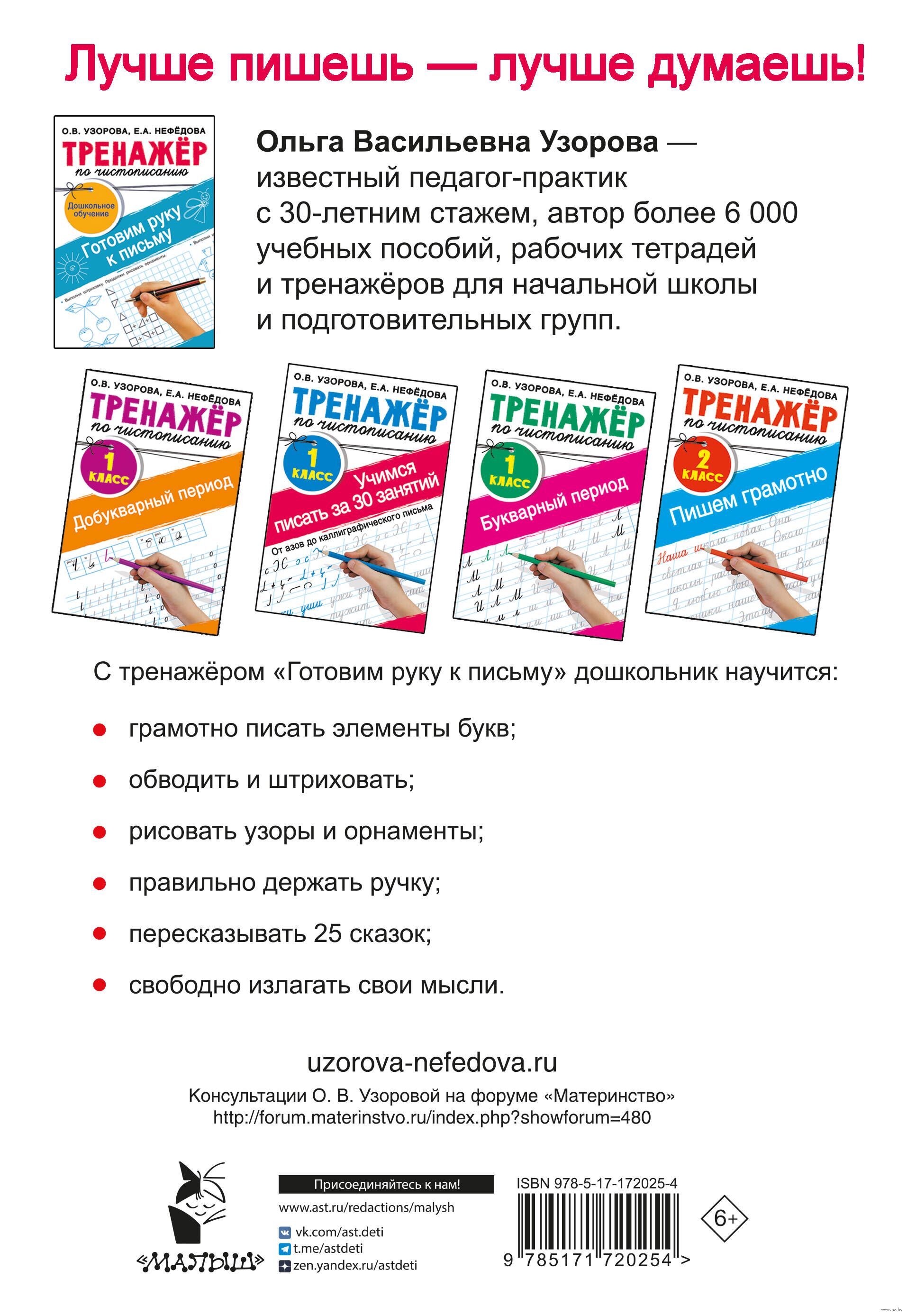 "Тренажёр по чистописанию. Готовим руку к письму" – это рабочая тетрадь с прописями, разработанная на основе авторской методики известного педагога-практика О. В. Узоровой. Интересные письменные и устные задания помогут детям 5-6 лет подготовить руку к письму, сформировать графические навыки, научиться ориентироваться на листе бумаги, развить мелкую моторику, речь, подготовиться к школе.