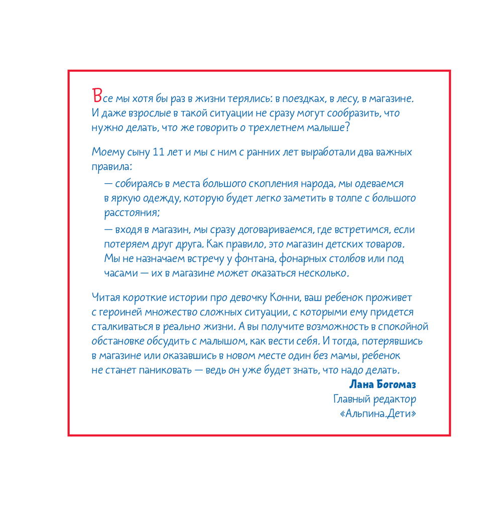 Как вести себя в больших торговых центрах? Почему так важно помнить, как зовут тебя и твоих родителей? И как не растеряться, если все-таки потерялся? Обо всем этом вы сможете поговорить со своим малышом, прочитав очередную историю о приключениях Конни.