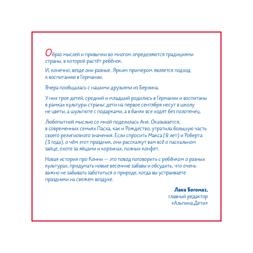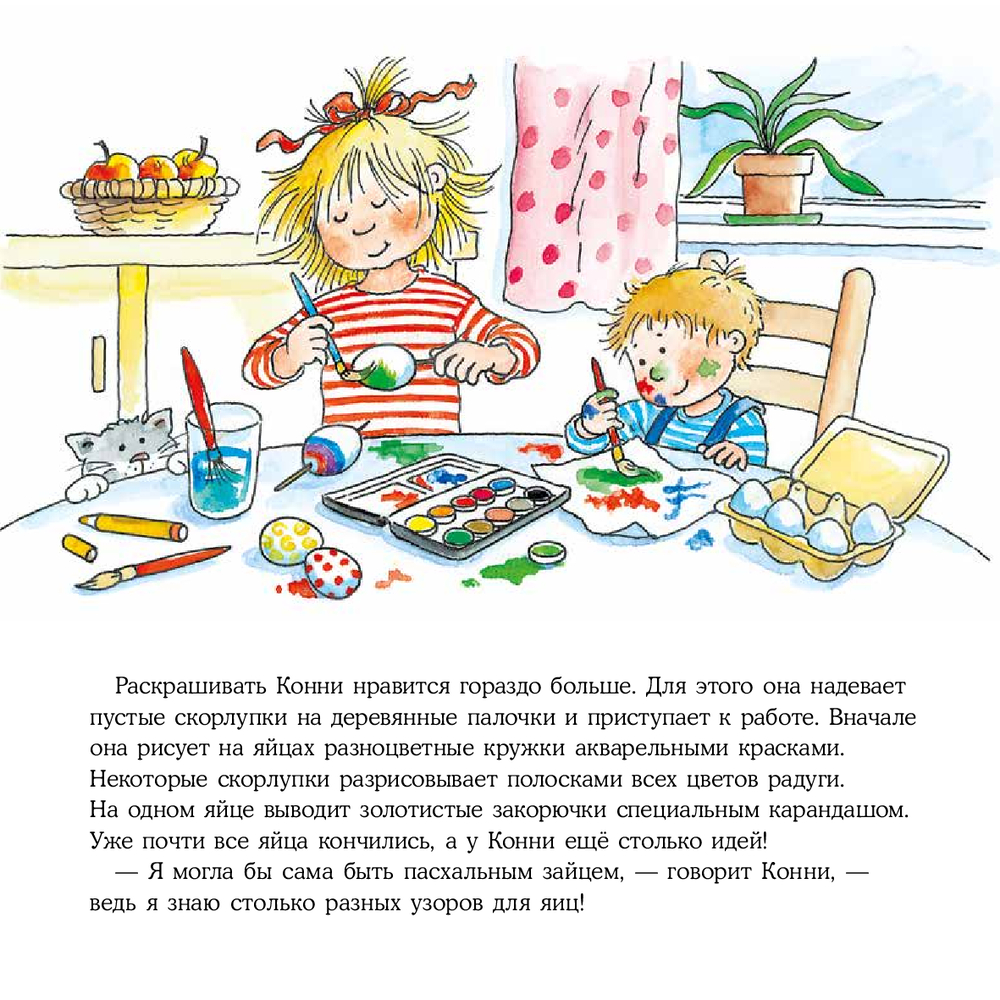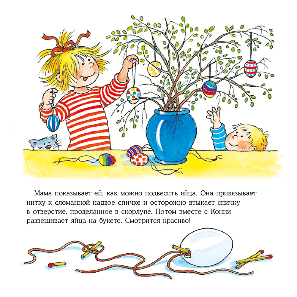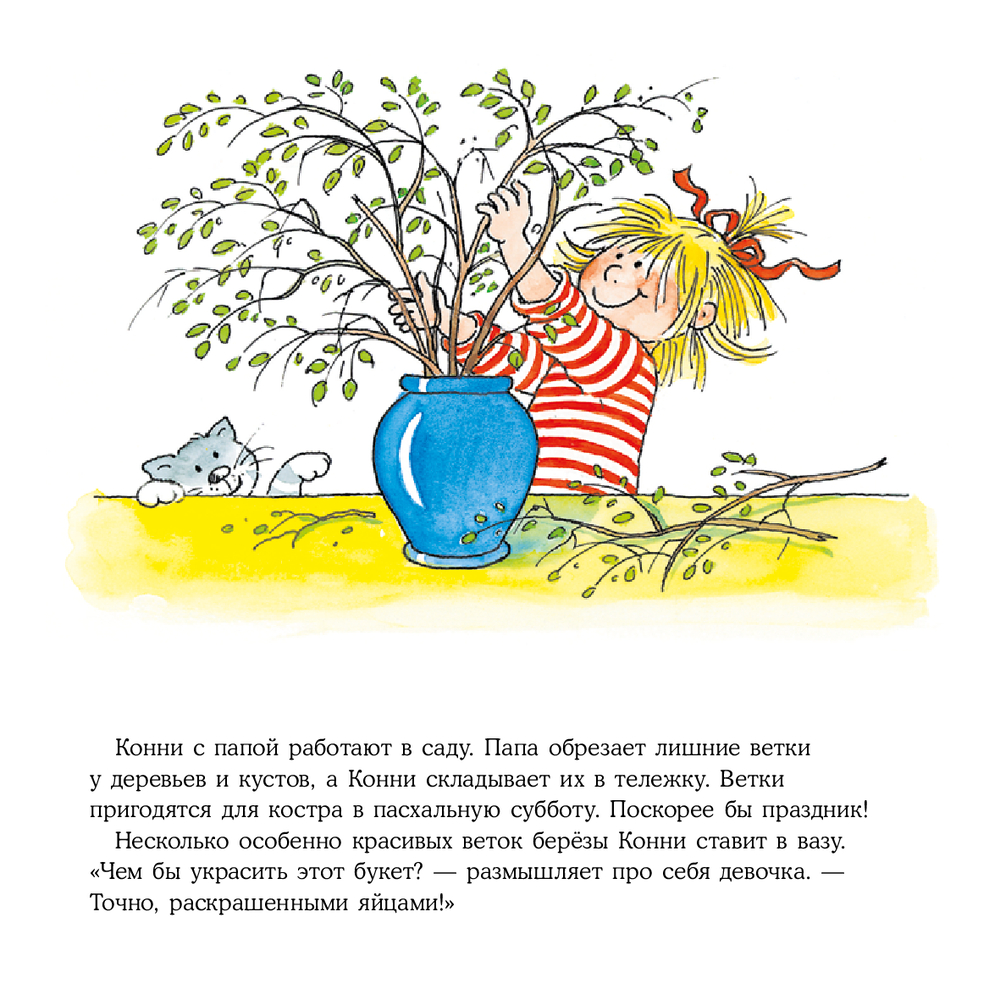 В городке Конни все готовятся к празднованию Пасхи: украшают дома, собирают ветки для общего пасхального костра и раскрашивают яйца. Конни тоже не отстаёт и устраивает на окне маленький садик с домашней зеленью.