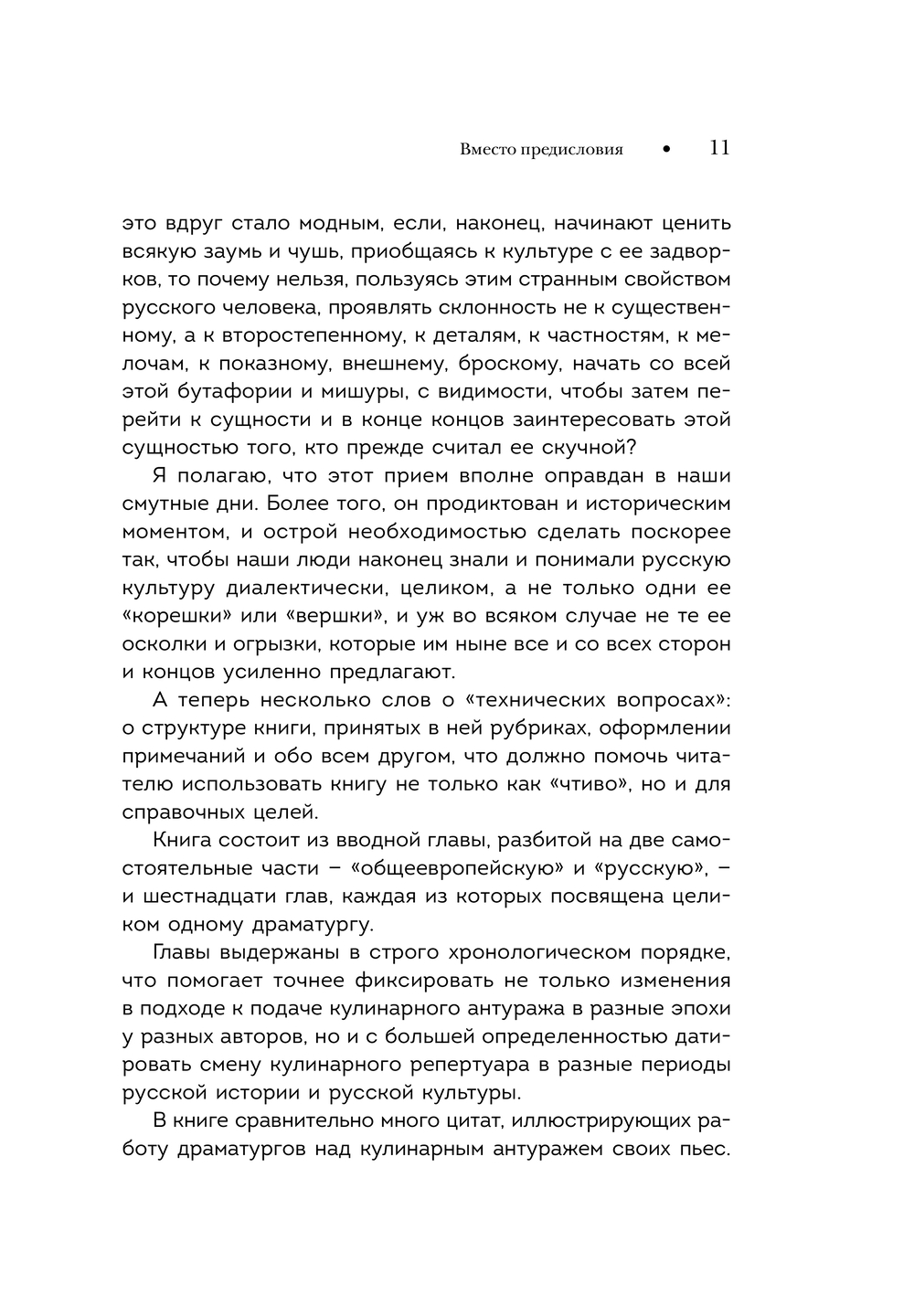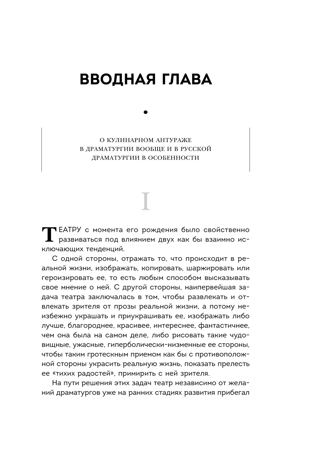 Лучший способ рассказать широкой публике о нашей классической драматургии – это обратить внимание как раз на то, на что никогда театральные и литературные критики не обращали, а именно – на роль и значение того крайне скудного кулинарного антуража, который присутствует в произведениях отечественных драматургов с конца XVIII по начало XX века. И через показ этого незначительного "аппендикса" на теле русской драматургии осветить с несколько неожиданной стороны отраженную в ней бытовую русскую культуру для самого широкого, самого простого и самого инертного круга читателей и зрителей. Того круга, который никак никаким "литературоведением" не проймешь.