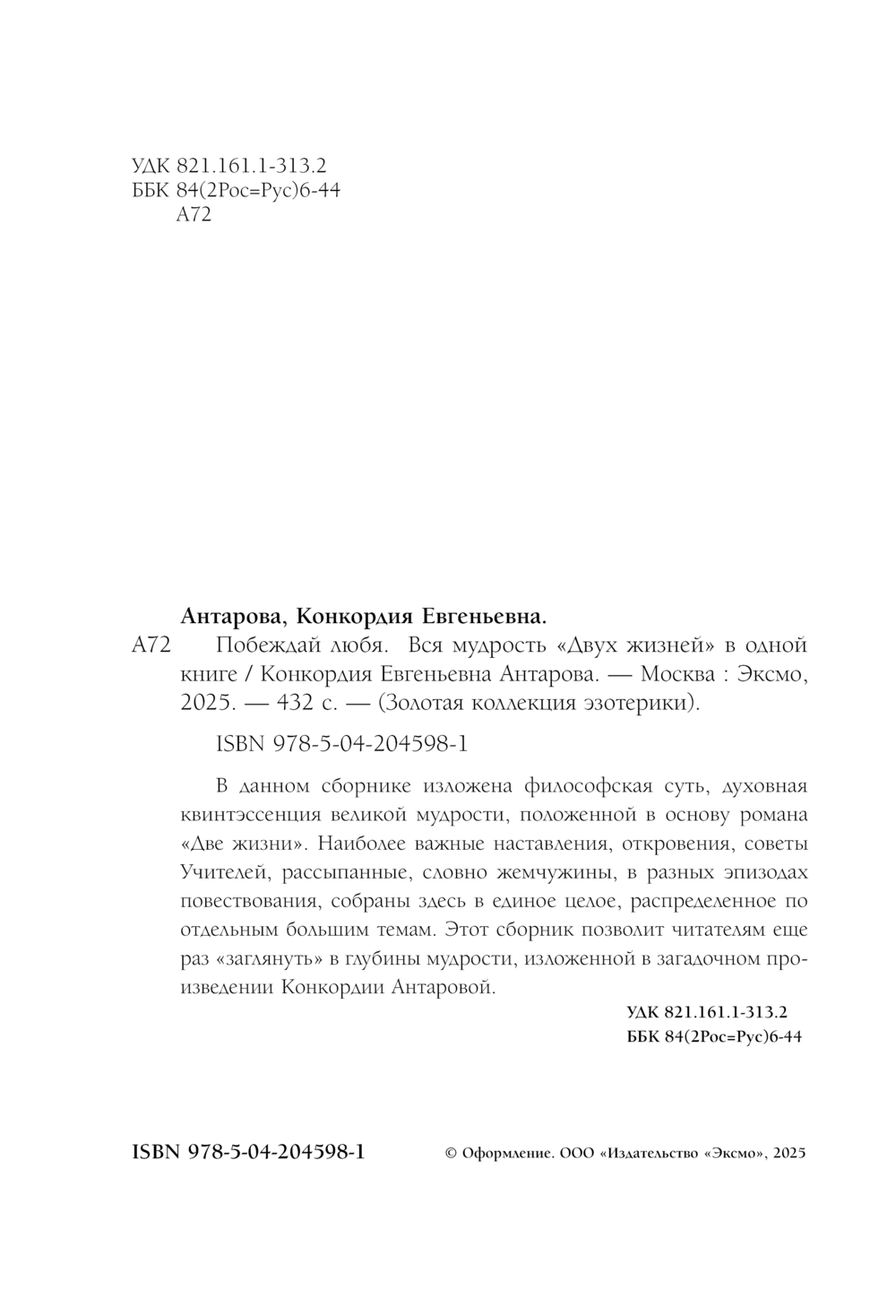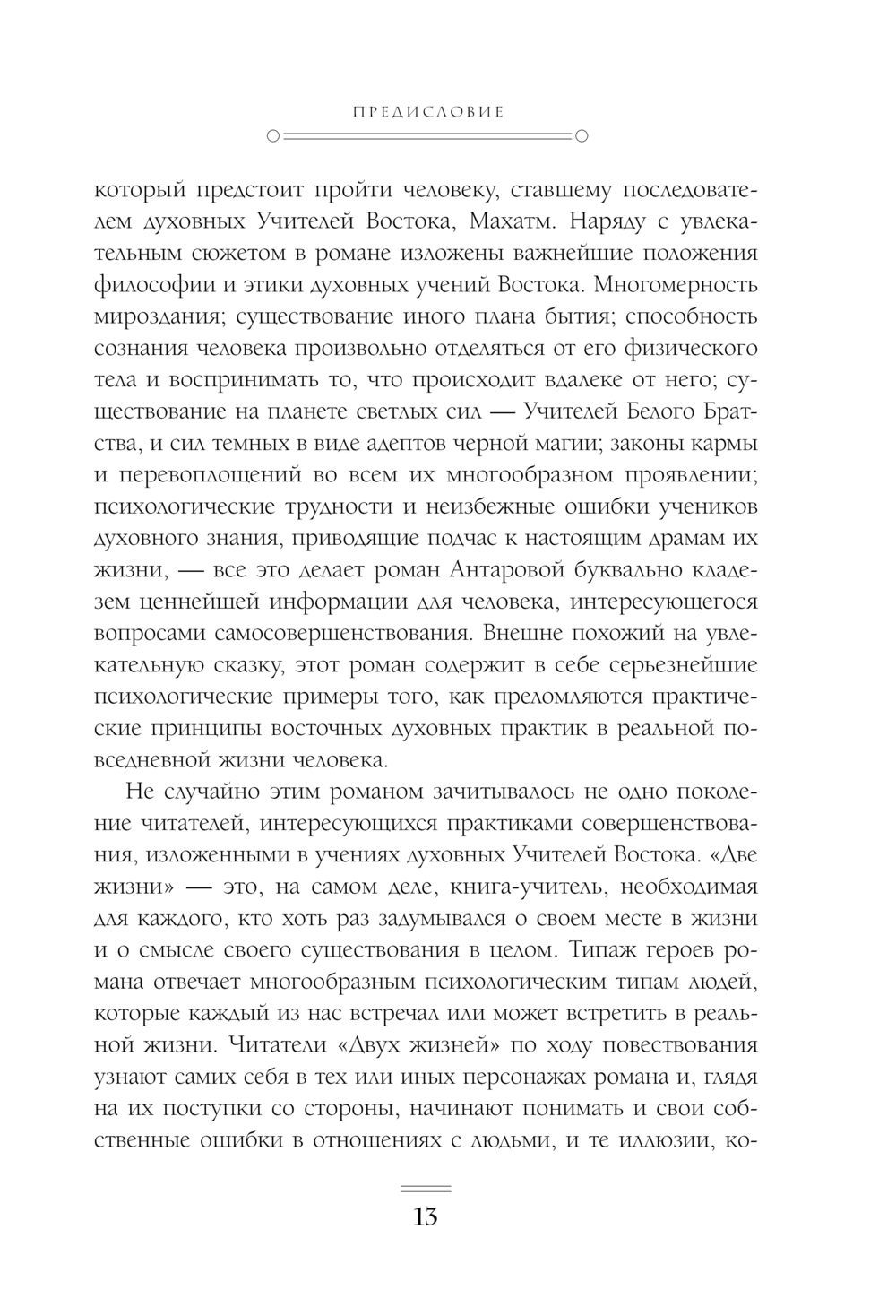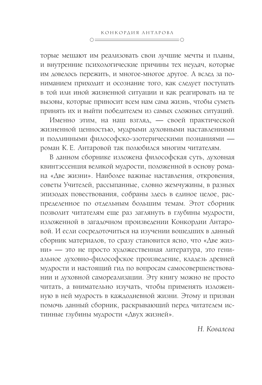 В данном сборнике изложена философская суть, духовная квинтэссенция великой мудрости, положенной в основу романа "Две жизни". Наиболее важные наставления, откровения, советы Учителей, рассыпанные, словно жемчужины, в разных эпизодах повествования, собраны здесь в единое целое, распределенное по отдельным большим темам. Этот сборник позволит читателям еще раз "заглянуть" в глубины мудрости, изложенной в загадочном произведении Конкордии Антаровой.