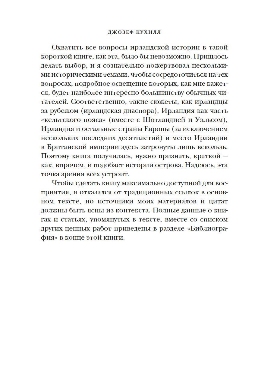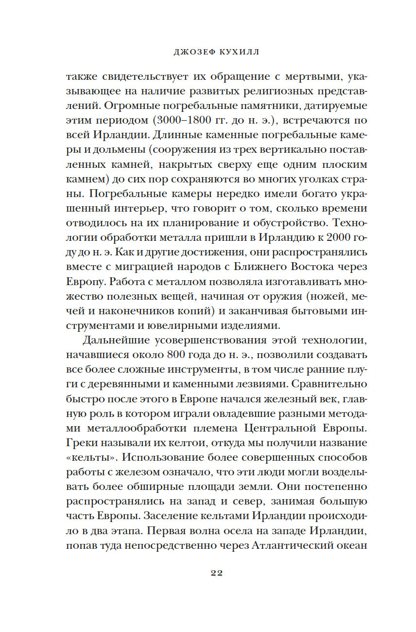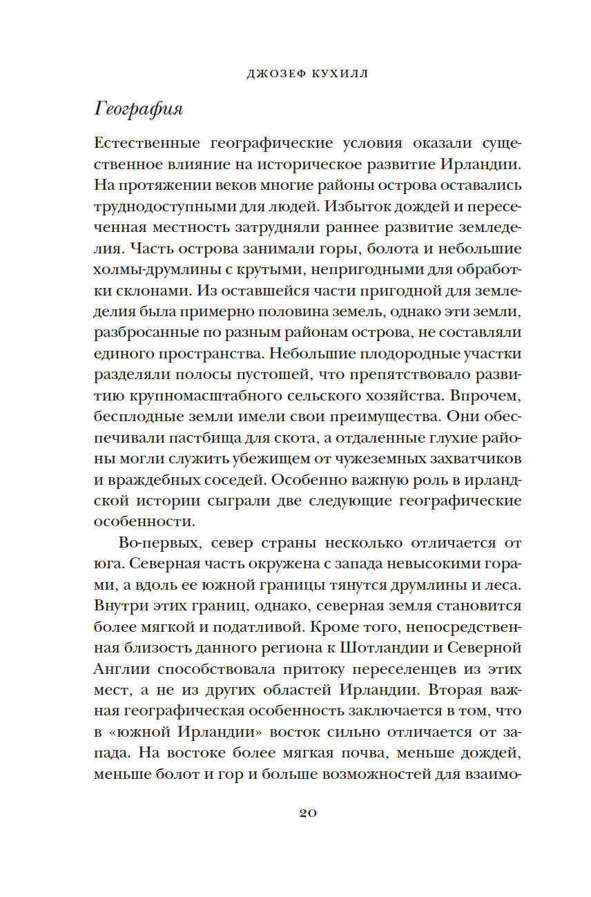 Много веков Ирландия, отдаленный остров на краю Европы, занимала особое место в мировой культуре. За 8000 лет Ирландии пришлось пережить гражданские войны, вражеские набеги и завоевания, голод и религиозные расколы, но этот уникальный и самобытный остров не потерял связь с древними традициями. Британский историк Джозеф Кухилл мастерски описывает захватывающие события прошлого и непростую судьбу ирландцев в настоящем, раскрывая многогранный характер этой страны. Какими были древнекельтские поселения? Как вторжение викингов изменило историю острова? В чем заключалась миссия святого Патрика? Как ирландцам удалось сохранить свой язык? Эта книга заново откроет для вас невероятный остров с удивительной судьбой.