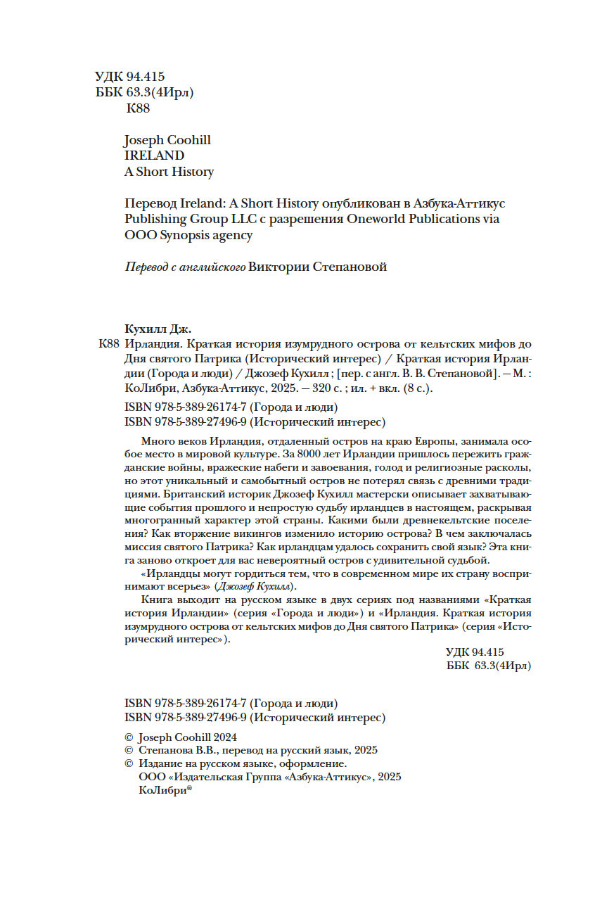 Книга выходит на русском языке в двух сериях под названиями "Краткая история Ирландии" (серия "Города и люди") и "Ирландия. Краткая история изумрудного острова от кельтских мифов до Дня святого Патрика" (серия "Исторический интерес").