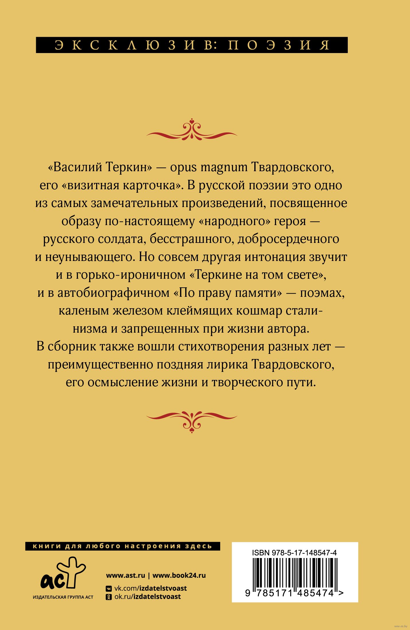 "Василий Теркин" – opus magnum Твардовского, его "визитная карточка". В русской поэзии это одно из самых замечательных произведений, посвященное образу по-настоящему "народного" героя – русского солдата, бесстрашного, добросердечного и неунывающего. Но совсем другая интонация звучит и в горько-ироничном "Теркине на том свете", и в автобиографичном "По праву памяти", – поэмах, каленым железом клеймящих кошмар сталинизма и запрещенных при жизни автора.
