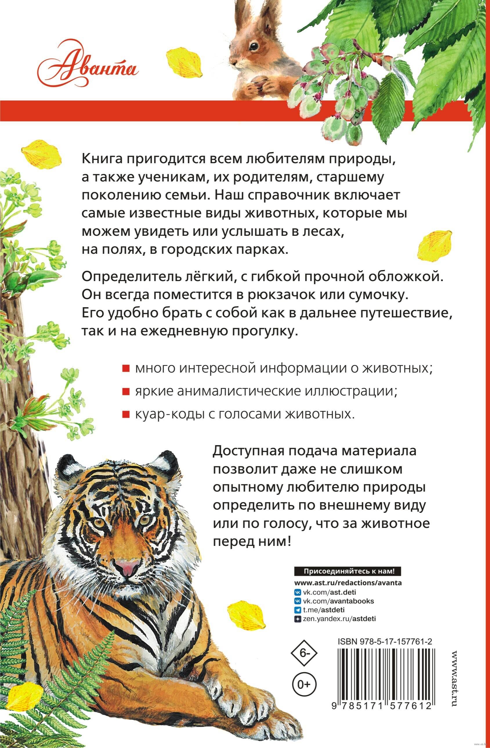 В книге вы найдете не только описания и изображения, но и голоса различных животных России. От известного всем ежа и суслика до тигра, от представителя отряда рукокрылых – рыжей вечерницы до косатки и бутылконосого дельфина – афалины, от волка и енотовидной собаки до бурого медведя... Мурлыканье, писк, рев, ржанье, щелчки – самые разнообразные "песни" и "разговоры" животных услышат читатели с помощью куар-кодов, представленных в нашем определителе.