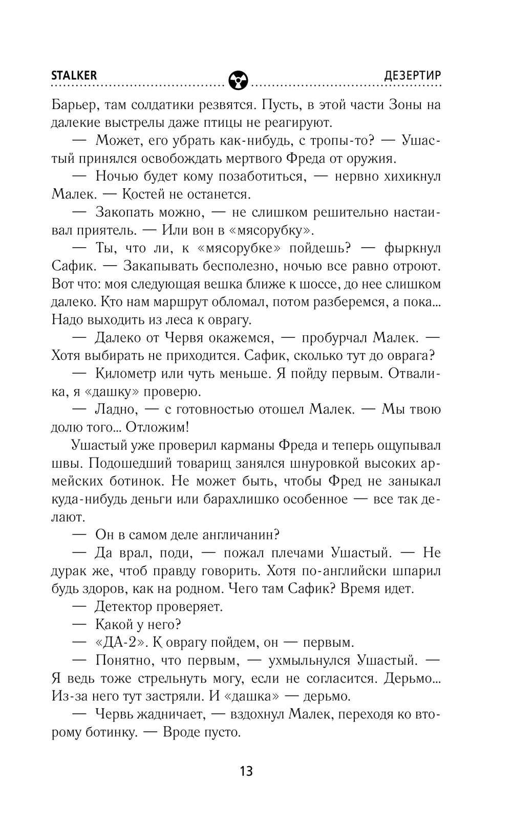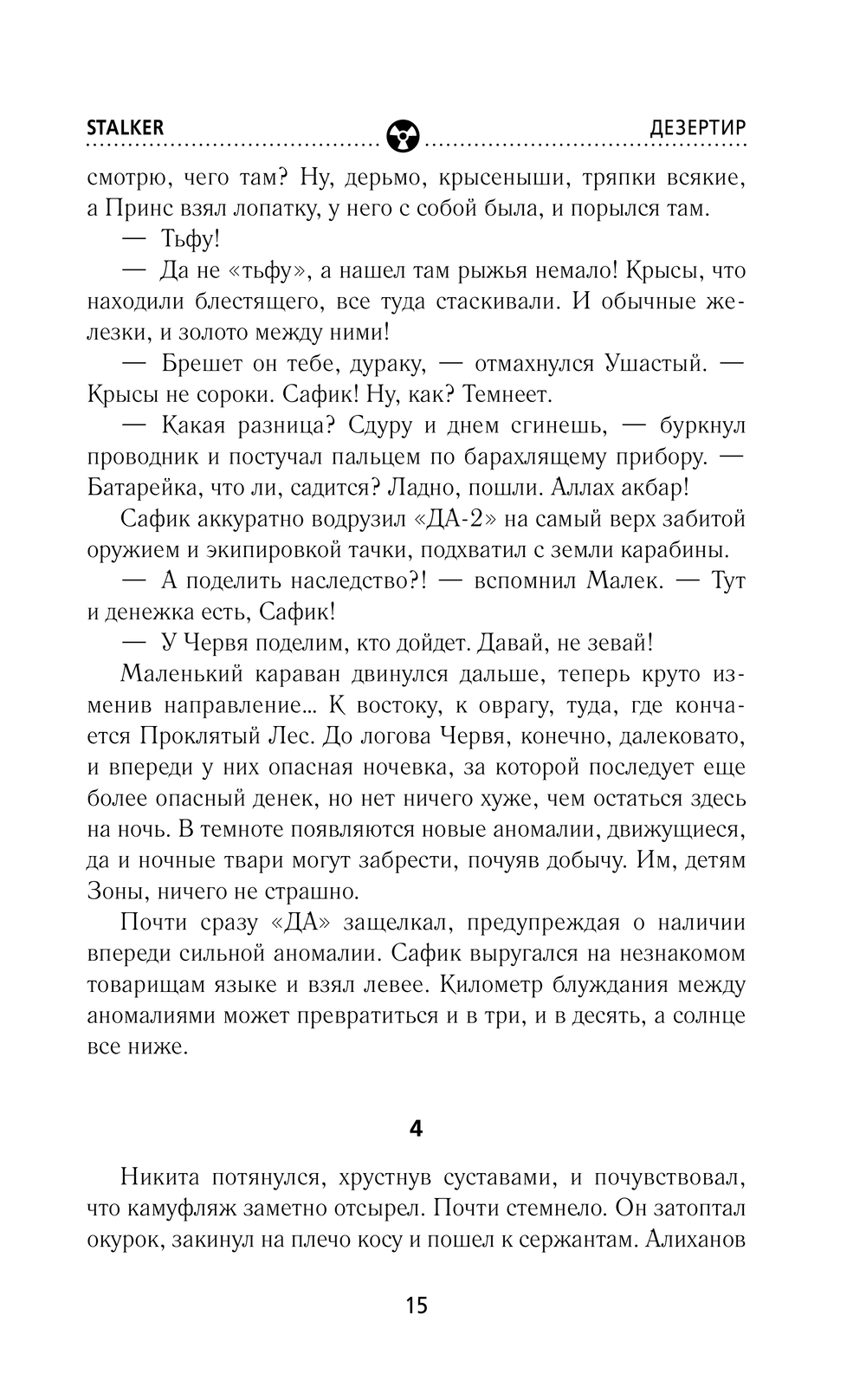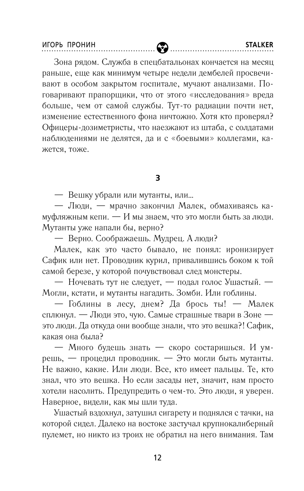 Вот только на запретной территории жизнь не слаще, а ее обитатели – куда беспощаднее "дедов" и офицеров. Опасности тут подстерегают на каждом шагу и на любой вкус: радиация, выбросы аномальной энергии, смертельные ловушки, мутанты... Впрочем, со временем и к этому можно приспособиться. Но как свыкнуться с бесконечной войной группировок, с хитростью, подлостью и предательством людей? И есть ли шанс при этом самому остаться человеком?