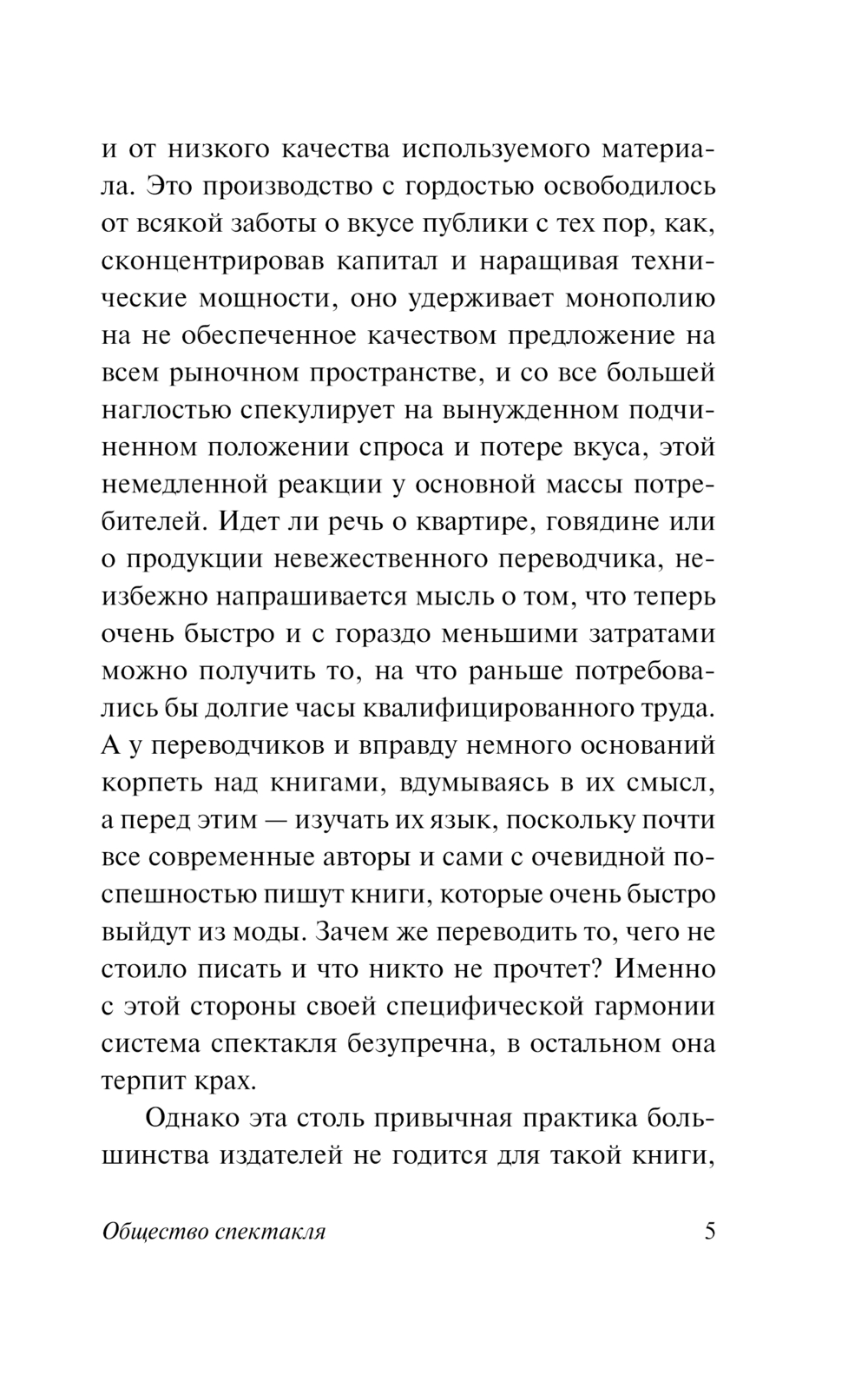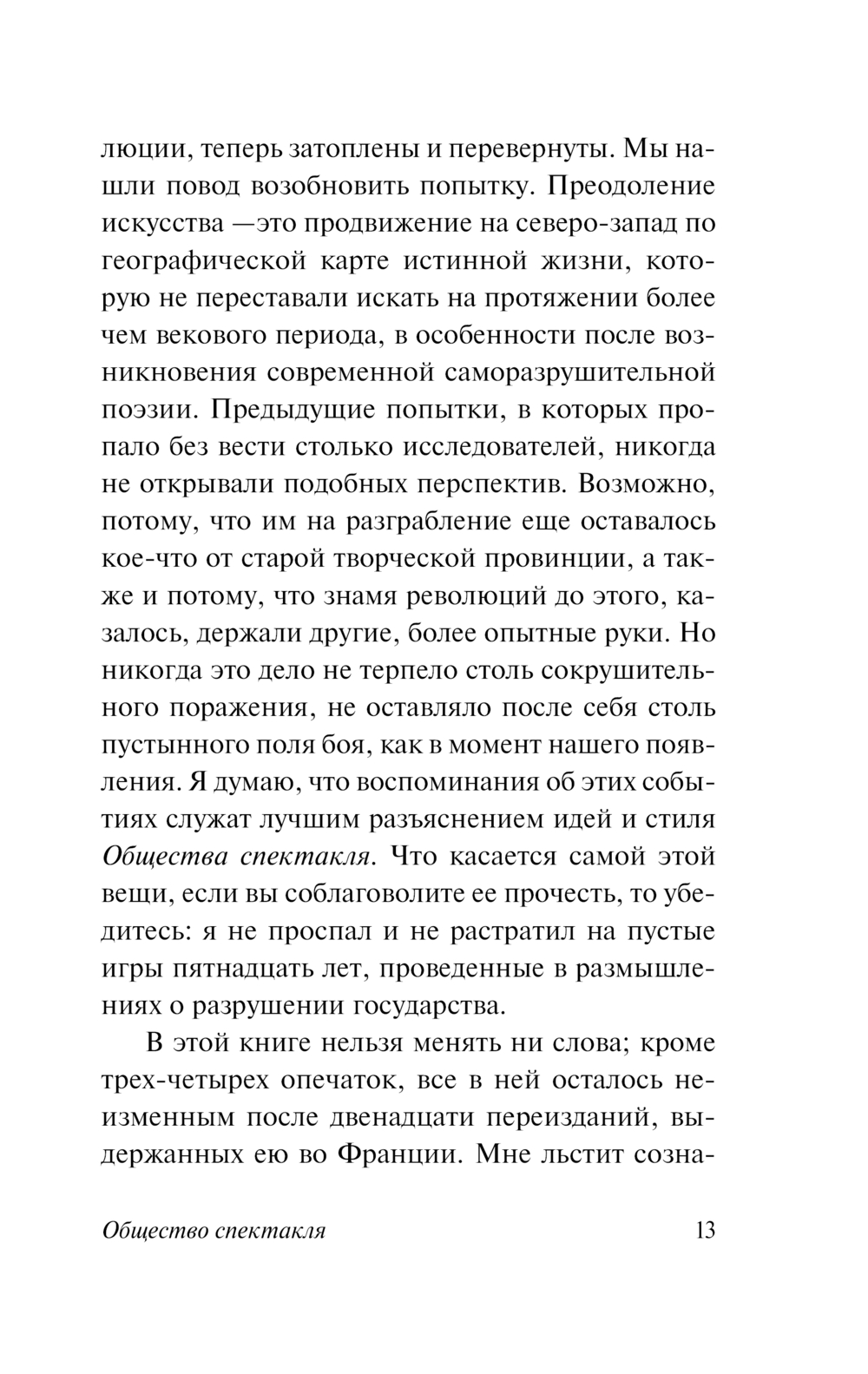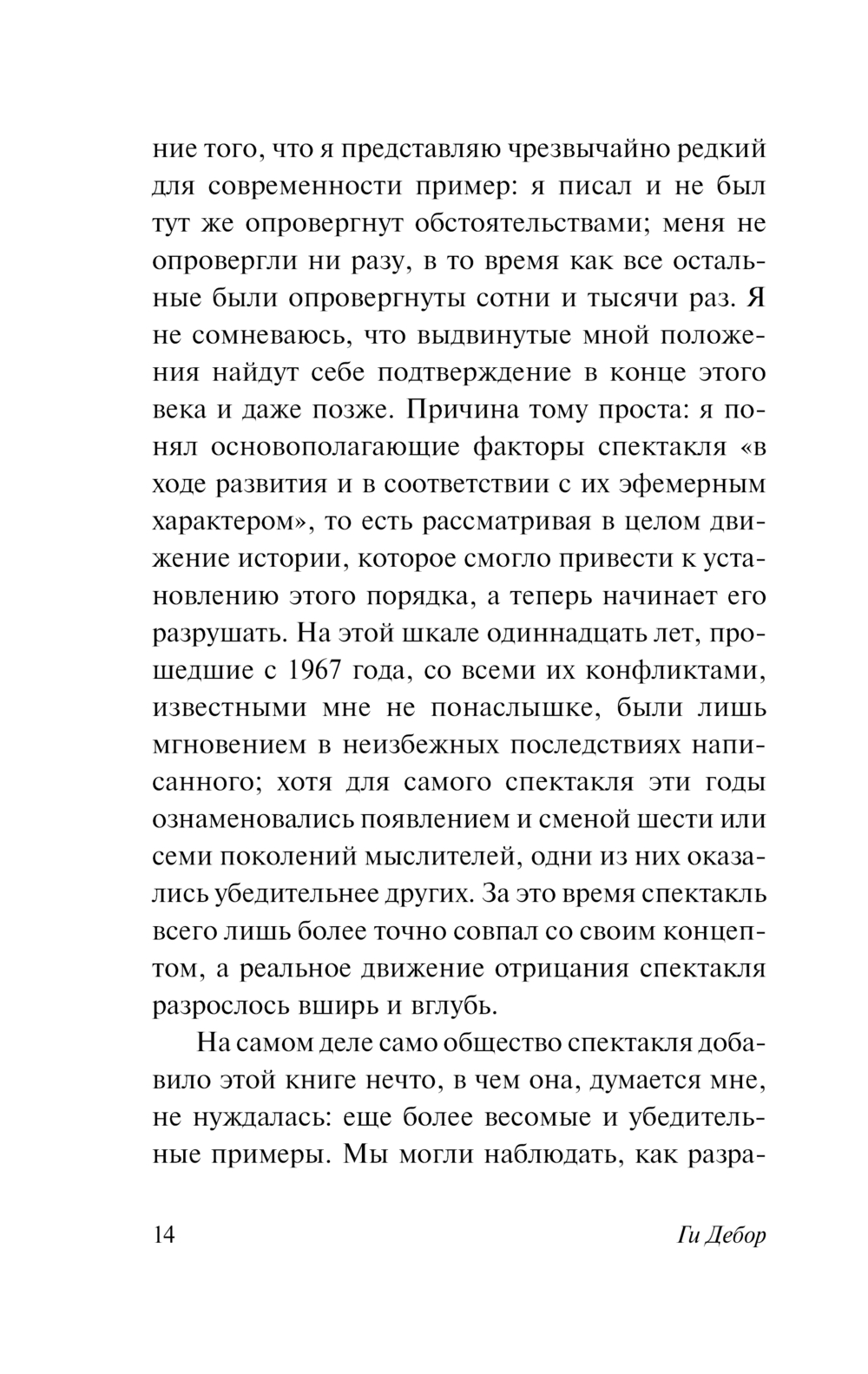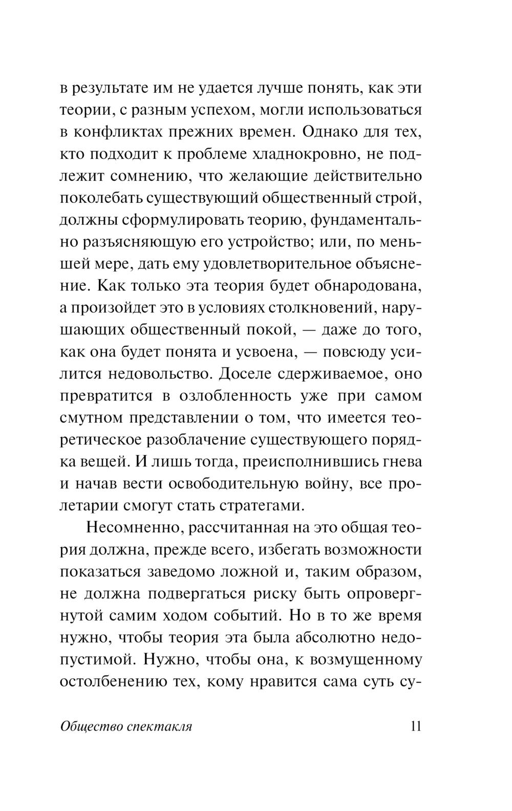 "Общество спектакля" – это метафора мира, в котором утрачен непосредственный контакт с реальностью: "Все, что раньше переживалось непосредственно, теперь отстраняется в представление". Работа посвящена анализу и критике как западной капиталистической системы – "общества рассредоточенного спектакля", так и советской авторитарной системы – "общества сосредоточенного спектакля". В "Комментариях" представлено общество интегрированного спектакля, включающего в себя и тоталитарный контроль, и диктат общества потребления.
