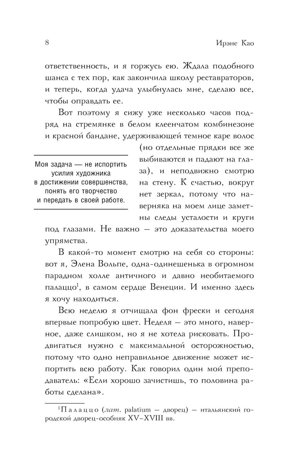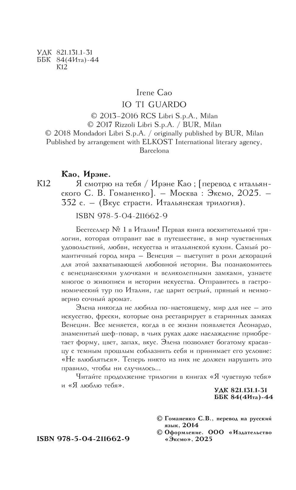 Первая книга восхитительной трилогии, которая отправит вас в путешествие, в мир чувственных удовольствий, любви, искусства и итальянской кухни. Самый романтичный город мира – Венеция, выступит в роли декораций для этой захватывающей любовной истории. Вы познакомитесь с венецианскими улочками и великолепными замками, узнаете многое о живописи и истории искусства. Отправитесь в гастрономический тур по Италии, где царит острый, пряный и неимоверно сочный аромат.