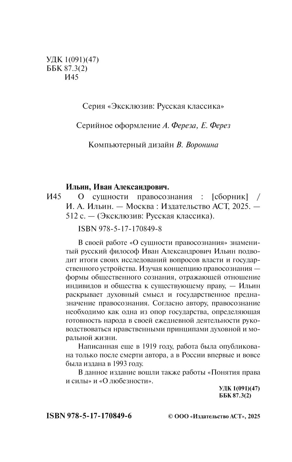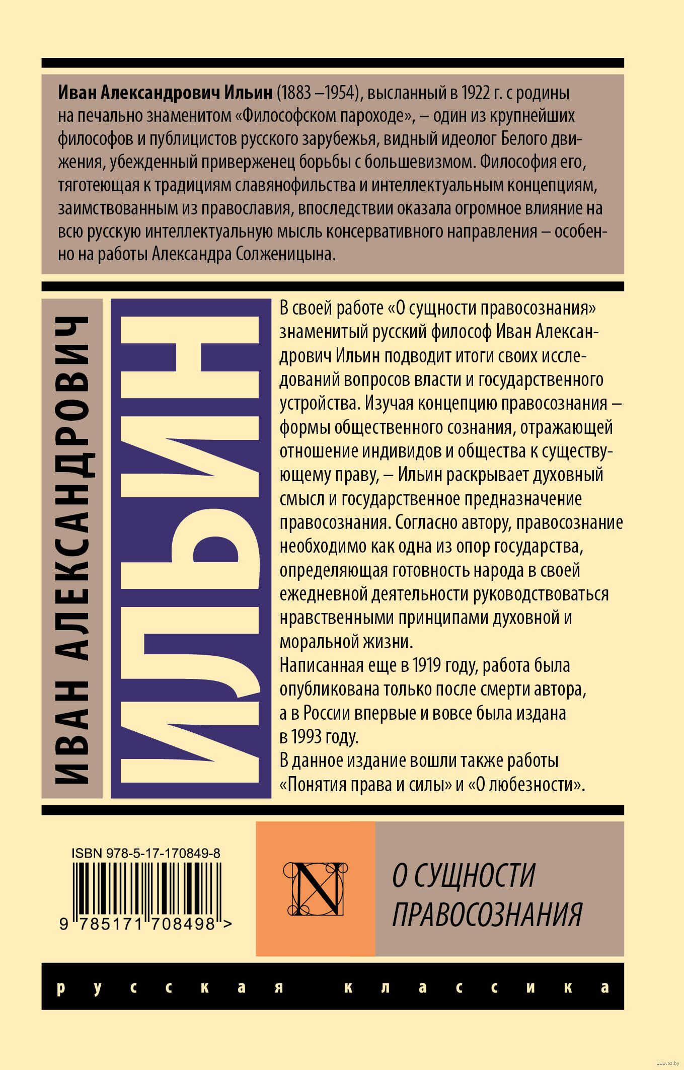 В своей работе "О сущности правосознания" знаменитый русский философ Иван Александрович Ильин подводит итоги своих исследований вопросов власти и государственного устройства. Изучая концепцию правосознания – формы общественного сознания, отражающей отношение индивидов и общества к существующему праву – Ильин раскрывает духовный смысл и государственное предназначение правосознания. Согласно автору, правосознание необходимо как одна из опор государства, определяющая готовность народа в своей ежедневной деятельности руководствоваться нравственными принципами духовной и моральной жизни.