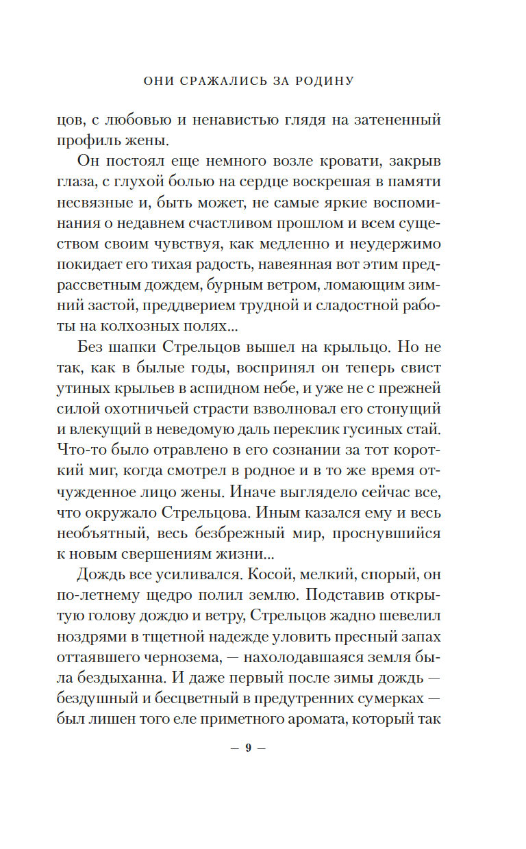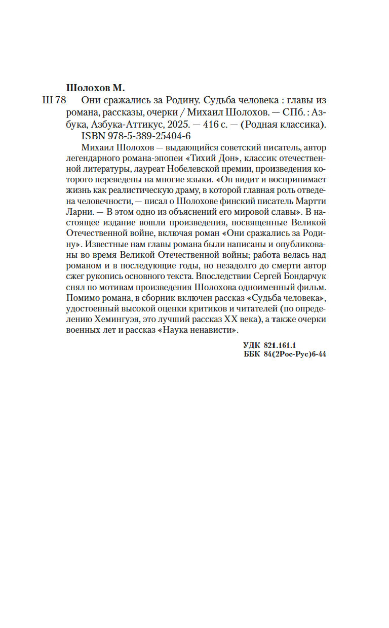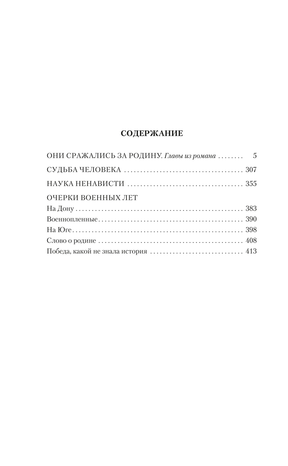 В настоящее издание вошли произведения, посвященные Великой Отечественной войне, включая роман "Они сражались за Родину". Известные нам главы романа были написаны и опубликованы во время Великой Отечественной войны; работа велась над романом и в последующие годы, но незадолго до смерти автор сжег рукопись основного текста. Впоследствии Сергей Бондарчук снял по мотивам произведения Шолохова одноименный фильм. Помимо романа, в сборник включен рассказ "Судьба человека", удостоенный высокой оценки критиков и читателей (по определению Хемингуэя, это лучший рассказ ХХ века), а также очерки военных лет и рассказ "Наука ненависти".