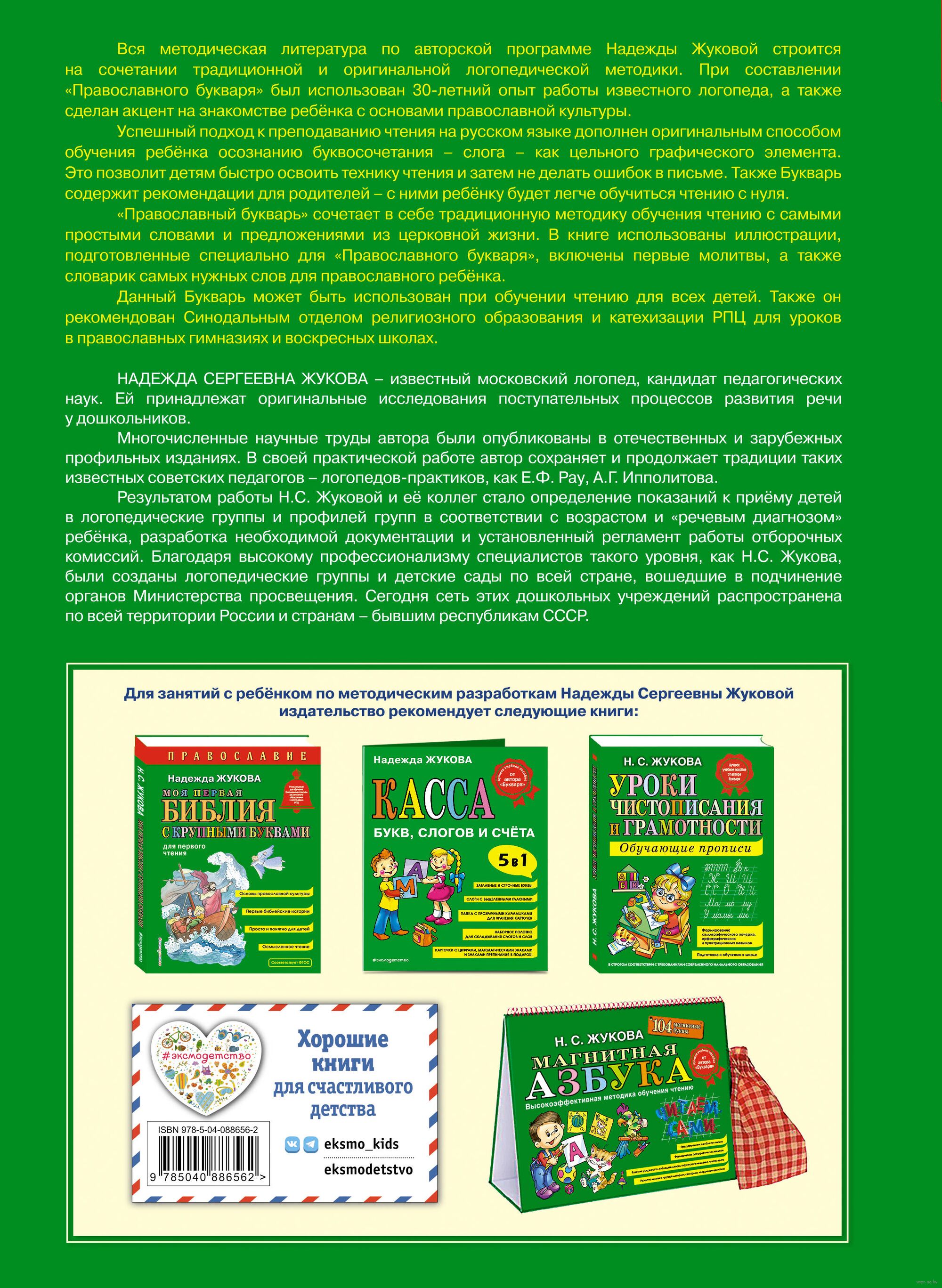 Вся методическая литература по авторской программе Надежды Жуковой строится на сочетании традиционной и оригинальной логопедической методики. При составлении "Православного букваря" был использован 30-тилетний опыт работы известного логопеда, а также сделан акцент на знакомстве ребёнка с основами православной культуры.