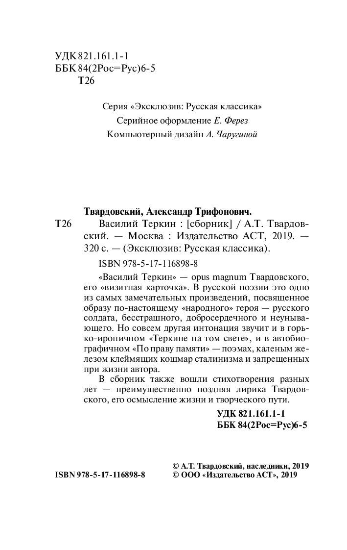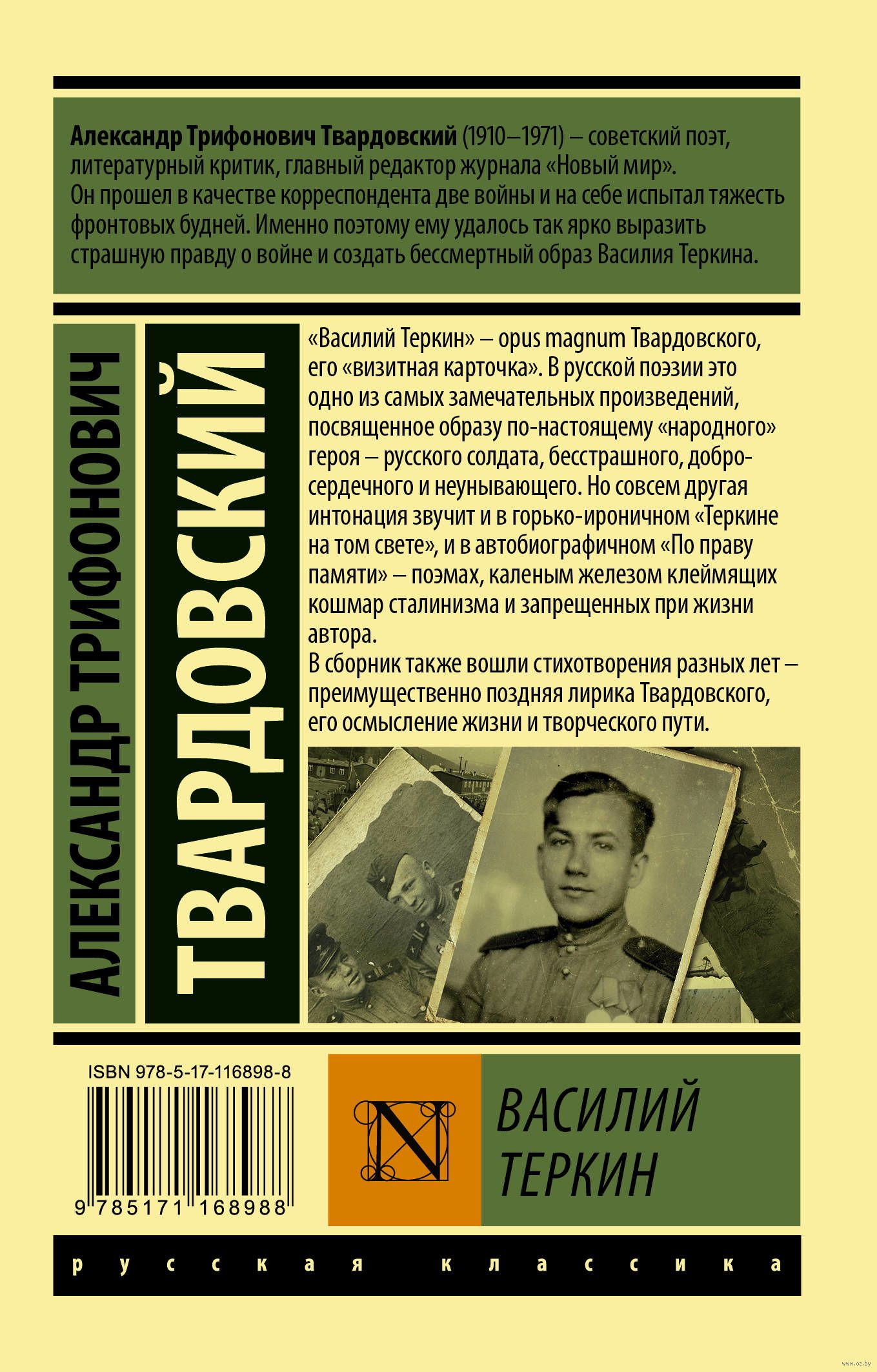 "Василий Теркин" – opus magnum Твардовского, его "визитная карточка". В русской поэзии это одно из самых замечательных произведений, посвященное образу по-настоящему "народного" героя – русского солдата, бесстрашного, добросердечного и неунывающего. Но совсем другая интонация звучит и в горько-ироничном "Теркине на том свете", и в автобиографичном "По праву памяти", – поэмах, каленым железом клеймящих кошмар сталинизма и запрещенных при жизни автора.