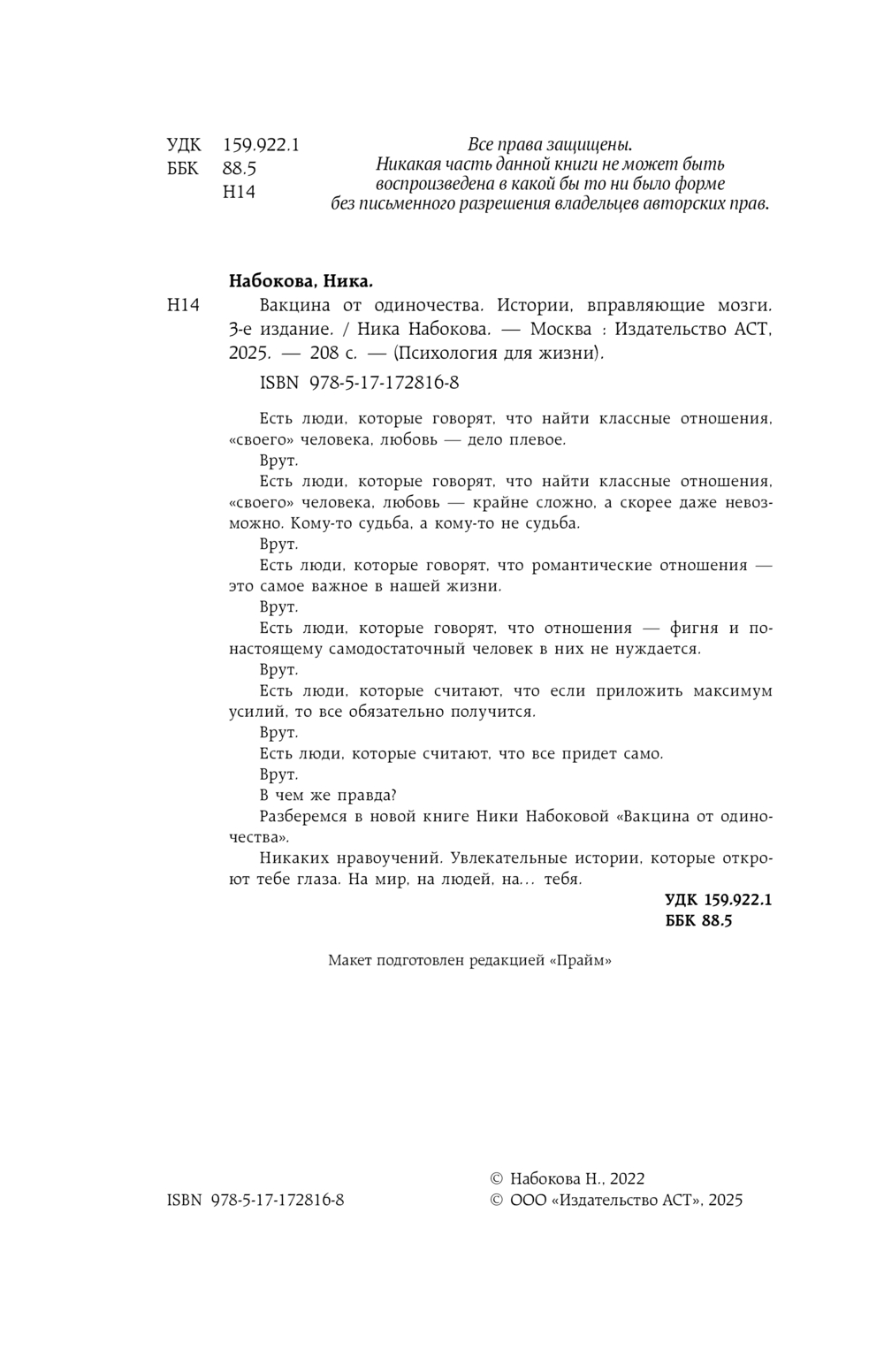 В чем же правда? Разберемся в новой книге Ники Набоковой "Вакцина от одиночества". Никаких нравоучений. Увлекательные истории, которые откроют тебе глаза. На мир, на людей, на... тебя.