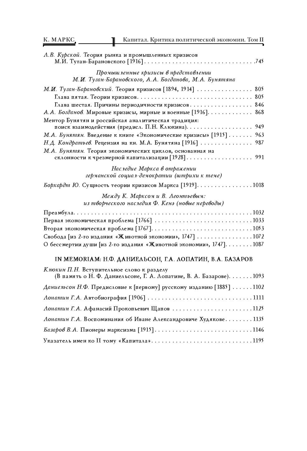 Вторая часть тома содержит большое количество ценных текстов, которые не принадлежат Марксу, но тесно связаны с проблематикой воспроизводства и кругооборота и сгруппированы в тематические разделы. Публикуется всемирно известная рецензия на II том "Капитала" немецкого экономиста и статистика В. Лексиса (1837-1914), сыгравшая важную роль в восприятии идей Маркса в западном академическом мире. Завершает том мемориальный раздел, в котором с подробными примечаниями (сделанными впервые) публикуются произведения первых марксистов Г. А. Лопатина (с очерками о А. П. Щапове и И. А. Худякове), Н. Ф. Даниельсона и В. А. Базарова. Статья Базарова "Пионеры марксизма" 1915 г., повествуя о периоде распространения марксизма в России, полноценно вводится в научный оборот.