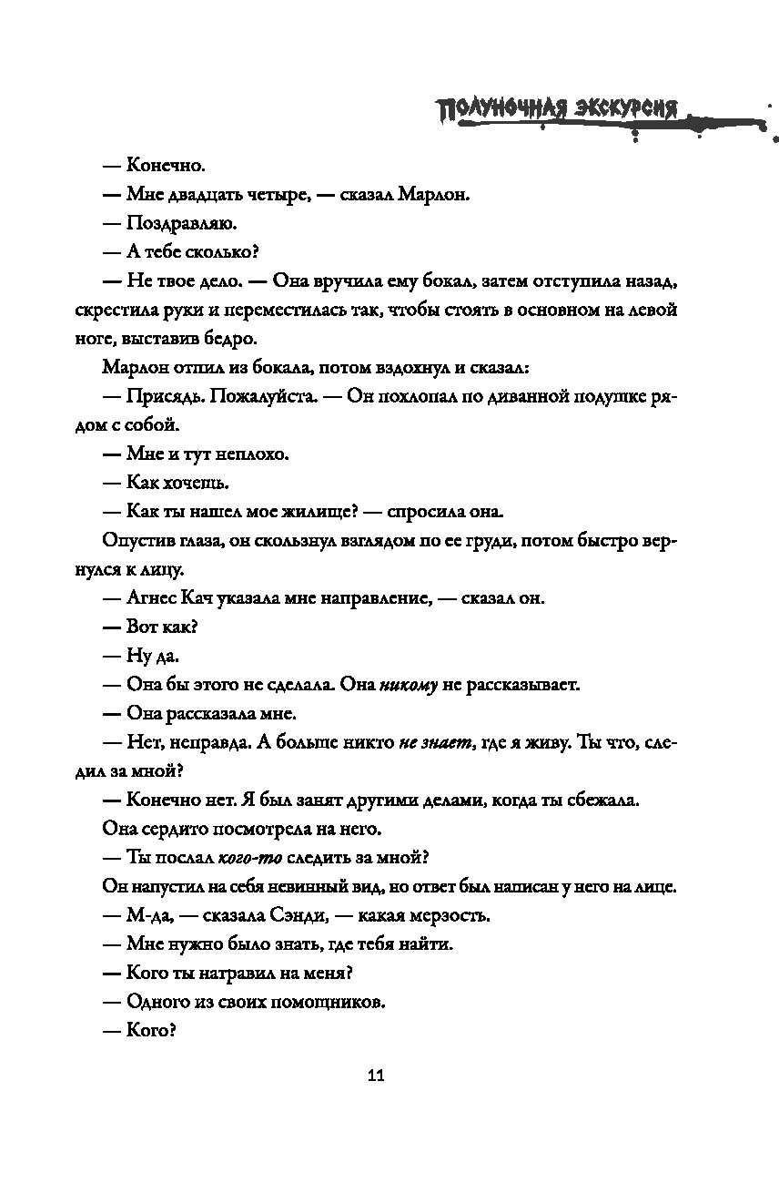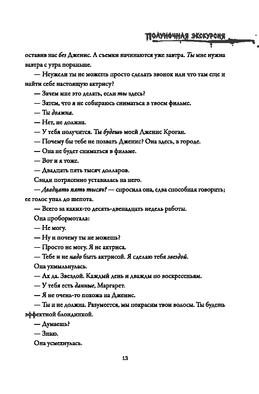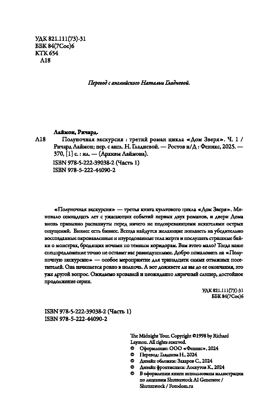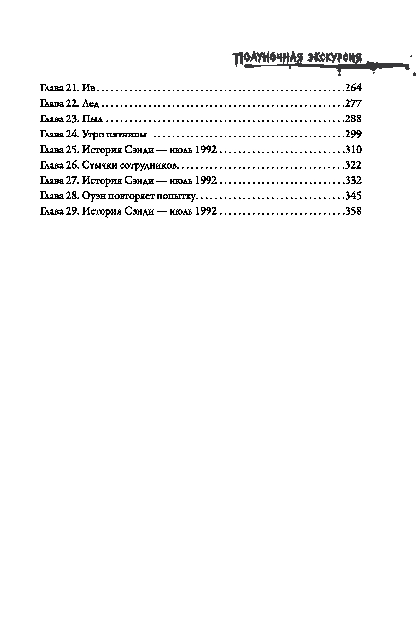 Миновало семнадцать лет с ужасающих событий первых двух романов, и двери Дома вновь призывно распахнуты перед ничего не подозревающими искателями острых ощущений. Бизнес есть бизнес. Всегда найдутся желающие поглазеть на убедительно воссозданные окровавленные и изуродованные тела жертв и послушать страшные байки о монстрах, бродящих ночами по темным коридорам. Вам этого мало? Тогда наше спецпредложение точно не оставит вас равнодушными. Добро пожаловать на "Полуночную экскурсию" – особое мероприятие для тринадцати самых отважных посетителей. Она начинается ровно в полночь. А вот доживете ли вы до ее окончания, это уже другой вопрос.