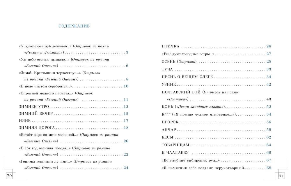 Стихотворения, представленные в книге, входят в программы обязательного и внеклассного чтения: "У лукоморья дуб зелёный..." (отрывок из поэмы "Руслан и Людмила"), "Зимнее утро", "Зимняя дорога", "Осень", "Няне", "Туча", "К ***" ("Я помню чудное мгновенье..."), "Песнь о вещем Олеге", "Полтавский бой" (отрывок из поэмы "Полтава"), "Узник", "Пророк", "Анчар", "Бесы", "К Чаадаеву" и другие.