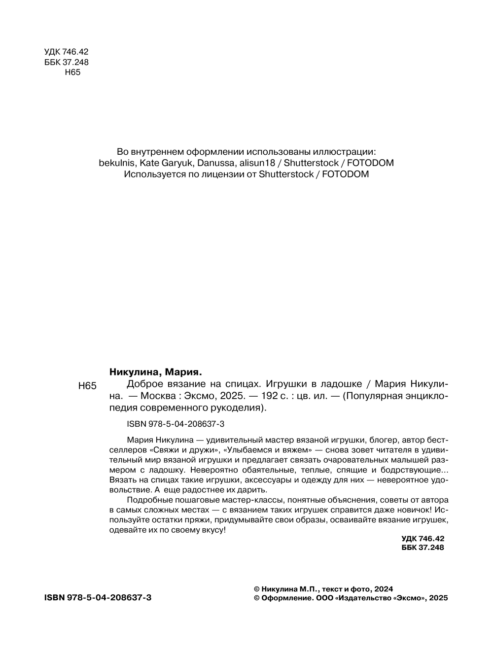 Мария Никулина – удивительный мастер вязаной игрушки, блогер, автор бестселлеров "Свяжи и дружи", "Улыбаемся и вяжем" снова зовет читателя в удивительный мир вязаной игрушки и предлагает связать очаровательных малышей размером с ладошу. Невероятно обаятельные, теплые, спящие и бодрствующие, – вязать на спицах такие игрушки, аксессуары и одежду для них – невероятное удовольствие. А еще радостнее их дарить.