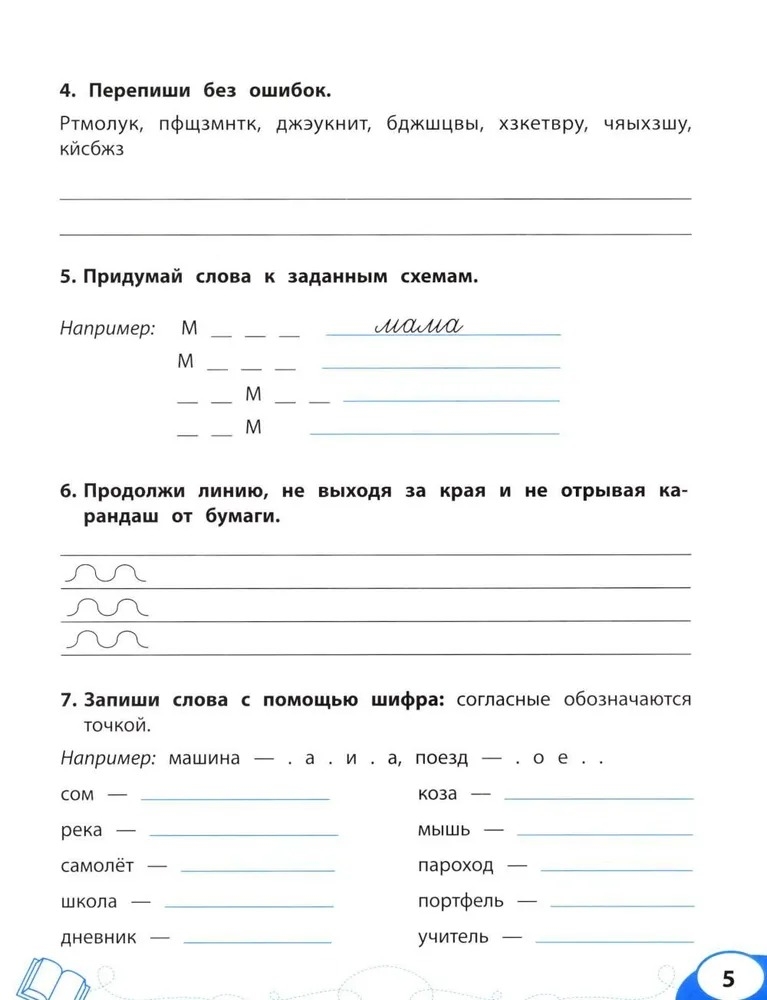 Упражнения, предложенные в сборнике, составлены с учётом созревания головного мозга ребёнка и направлены на создание предпосылок для успешного усвоения процесса формирования письма. Главная цель тренажёра – формирование зрительного восприятия, развитие зрительного внимания, усидчивости, преодоление импульсивности, закрепление образа букв, расширение словарного запаса и звуко-буквенного анализа, а также развитие графомоторных навыков, зрительно-моторной координации и самоконтроля.