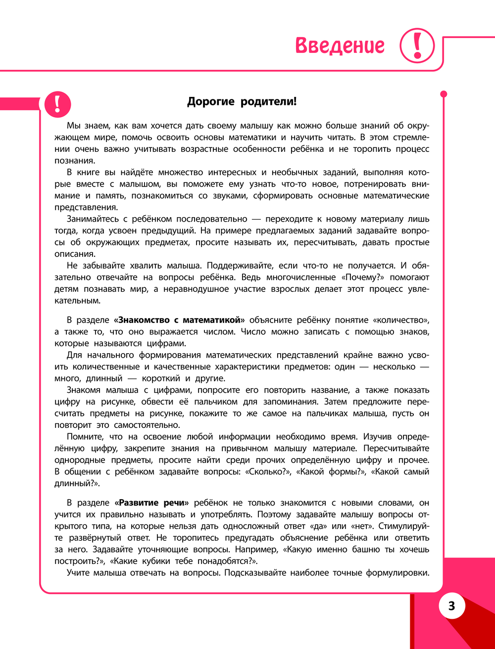 Цель пособия – комплексное развитие малыша 3-4 лет. С помощью материалов, представленных в книге, ребёнок быстро запомнит цифры в пределах 10, научится считать, сравнивать предметы по размеру, познакомится с цветами и формами. Кроме того, пособие содержит задания для развития фонематического слуха, обогащение словарного запаса, расширение кругозора. Занимаясь, малыш получит представление об окружающем мире, в том числе о животных и растениях, частях суток, узнает о правилах безопасности, сможет развить мелкую моторику.