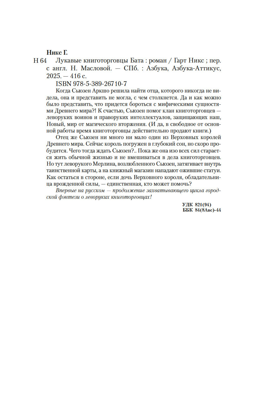 Отец же Сьюзен ни много ни мало один из Верховных королей Древнего мира. Сейчас король погружен в глубокий сон, но скоро пробудится. Чего тогда ждать Сьюзен?.. Пока же она изо всех сил старается жить обычной жизнью и не вмешиваться в дела книготорговцев. Но тут леворукого Мерлина, возлюбленного Сьюзен, затягивает внутрь таинственной карты, а на книжный магазин нападают ожившие статуи. Как остаться в стороне, если дочь Верховного короля, обладательница врожденной силы, – единственная, кто может помочь?