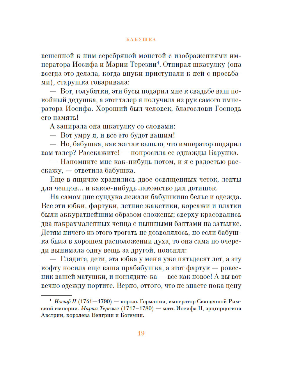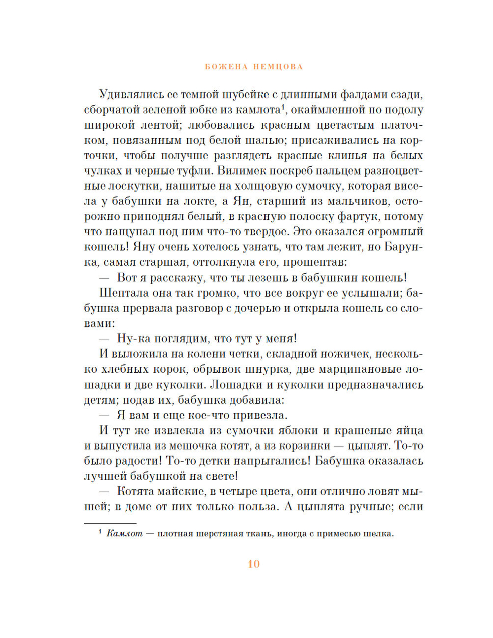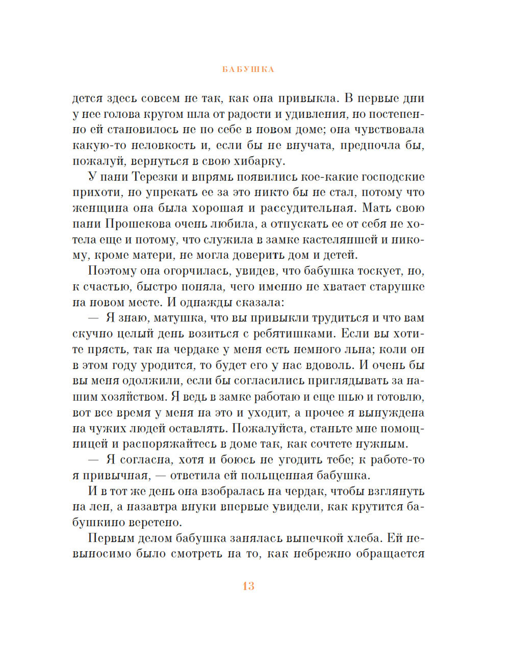 "Бабушка" Божены Немцовой (1820-1862) – самая известная и часто издаваемая книга в Чехии. Уже к концу XIX века она стала символом чешской культуры. Сюжет повести очень простой: бабушка Мадлена оставляет свою деревню и приезжает к дочери, чтобы помочь ей по хозяйству и посидеть с внуками. Дети сразу же полюбили добрую бабушку, которая знает множество удивительных историй, примет и поверий и лично встречалась с самим императором Иосифом! Они с удовольствием слушают ее рассказы о прошлом, принимают участие во всех праздниках и учатся у бабушки уму и терпению.