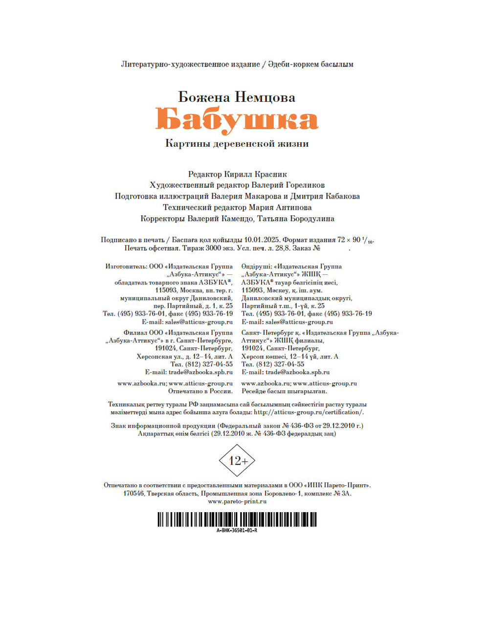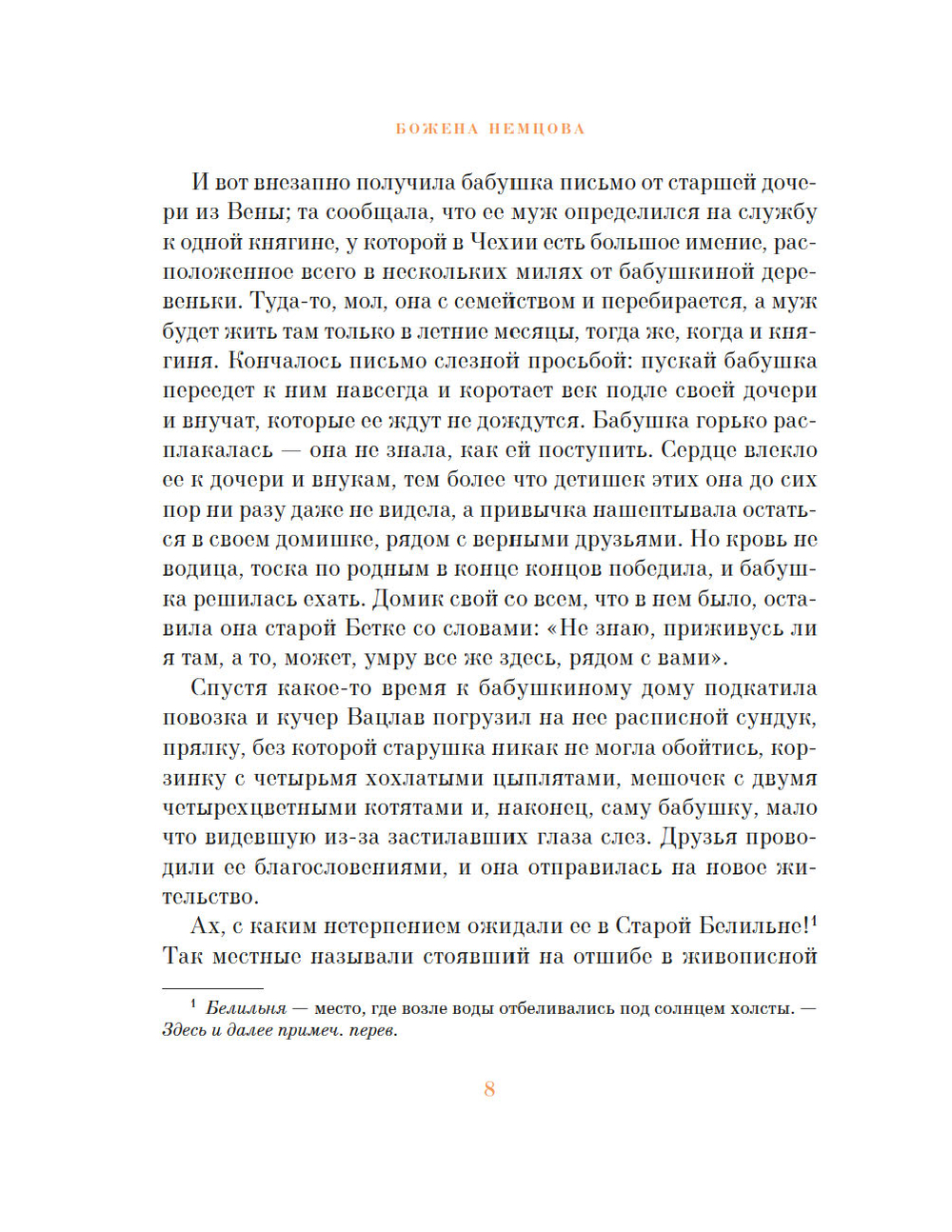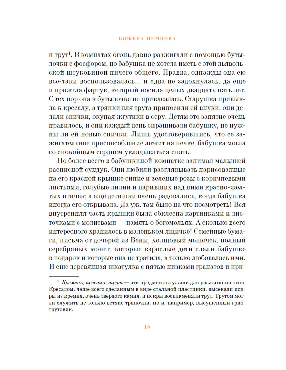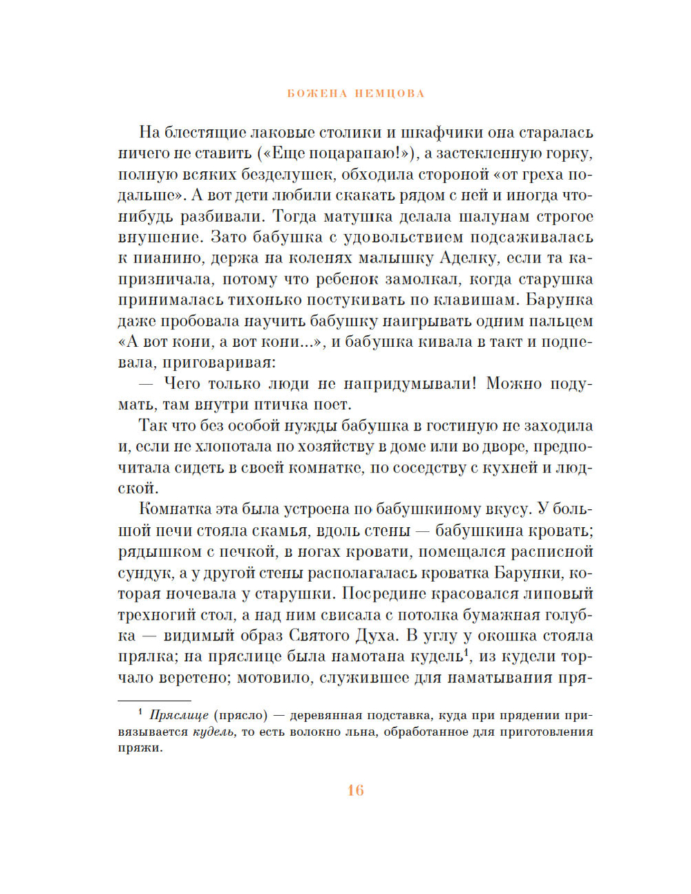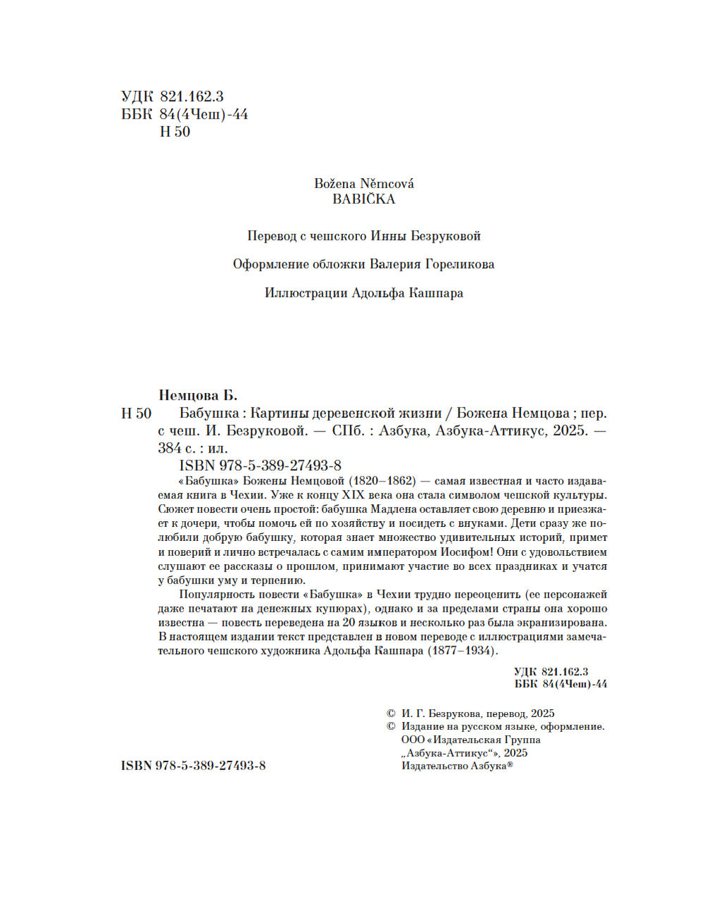 Популярность повести "Бабушка" в Чехии трудно переоценить (ее персонажей даже печатают на денежных купюрах), однако и за пределами страны она хорошо известна – повесть переведена на 20 языков и несколько раз была экранизирована. В настоящем издании текст представлен в новом переводе с иллюстрациями замечательного чешского художника Адольфа Кашпара (1877-1934).