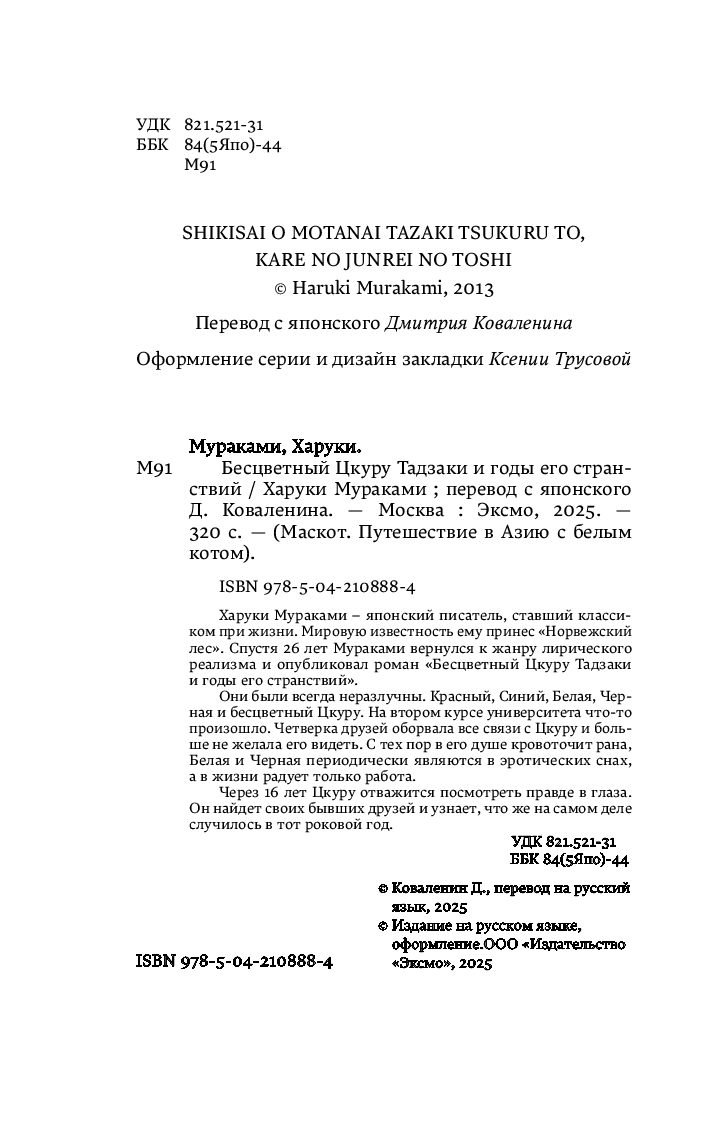 | Название в оригинале | Colorless Tsukuru Tazaki And His Years Of Piligrimage |