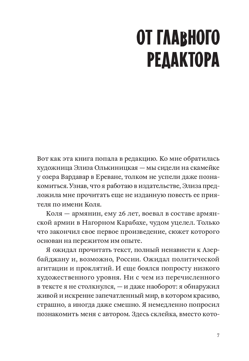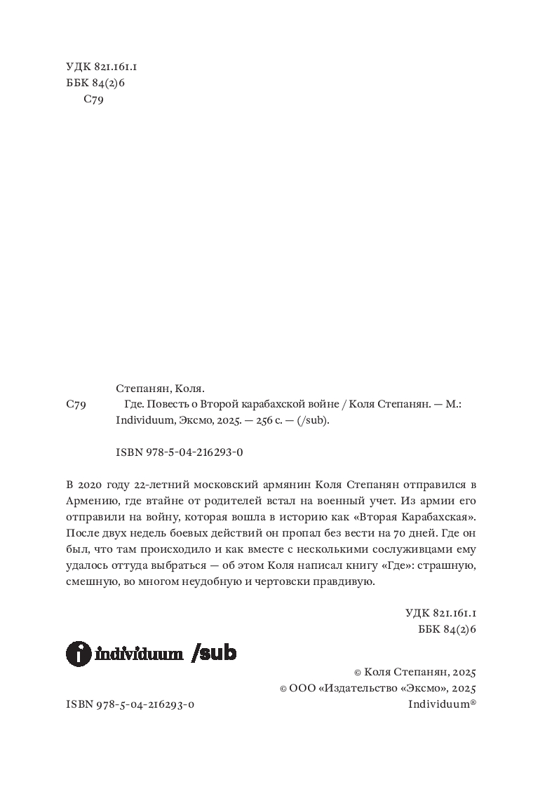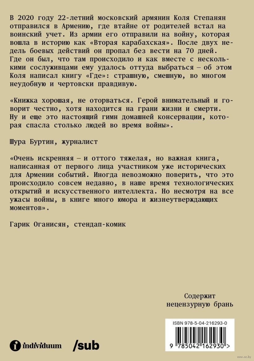 В 2020 году 22-летний московский армянин Коля Степанян отправился в Армению, где втайне от родителей встал на военный учет. Из армии его отправили на войну, которая вошла в историю как "Вторая Карабахская". После двух недель боевых действий он пропал без вести на 70 дней. Где он был, что там происходило и как вместе с несколькими сослуживцами ему удалось оттуда выбраться – об этом Коля написал книгу "Где": страшную, смешную, во многом неудобную и чертовски правдивую.