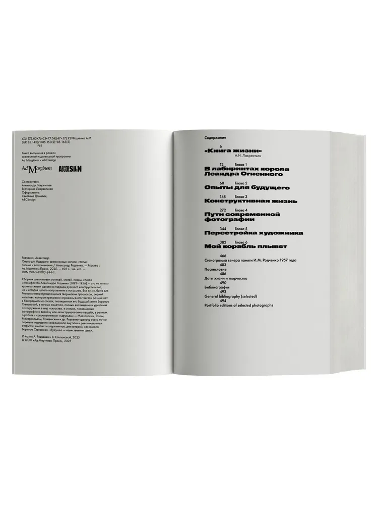 Хроника жизни и творчества художника, графика, дизайнера, фотографа Александра Родченко (1891-1956) содержит дневниковые записи и письма к жене В. Ф. Степановой, посвящённую конструктивизму "Автомонографию" 1922 года; манифест и программу группы конструктивистов 1920-х годов; воспоминания о работе с В. Маяковским, а также репродукции фотографий, рекламных плакатов, книжных обложек, журнальных страниц, эмблем, эскизов, небольших схем, чертежей и пр. В конце издания помещен хронологический очерк под названием "Даты жизни и творчества", библиография статей Родченко и книг о нем.