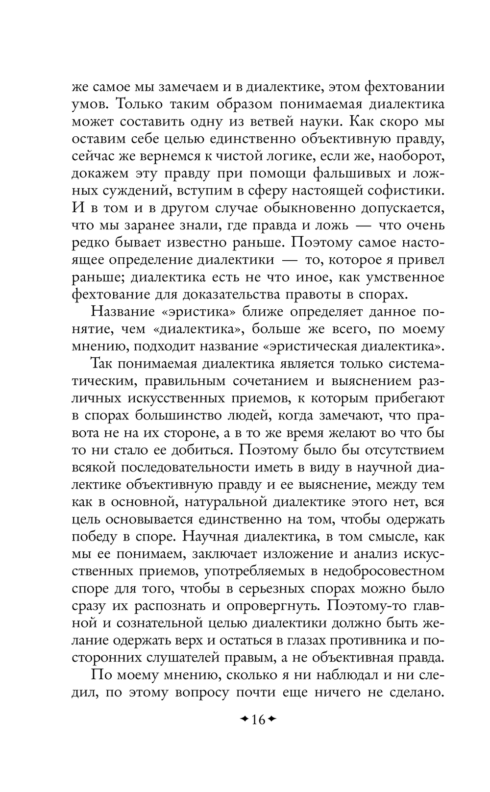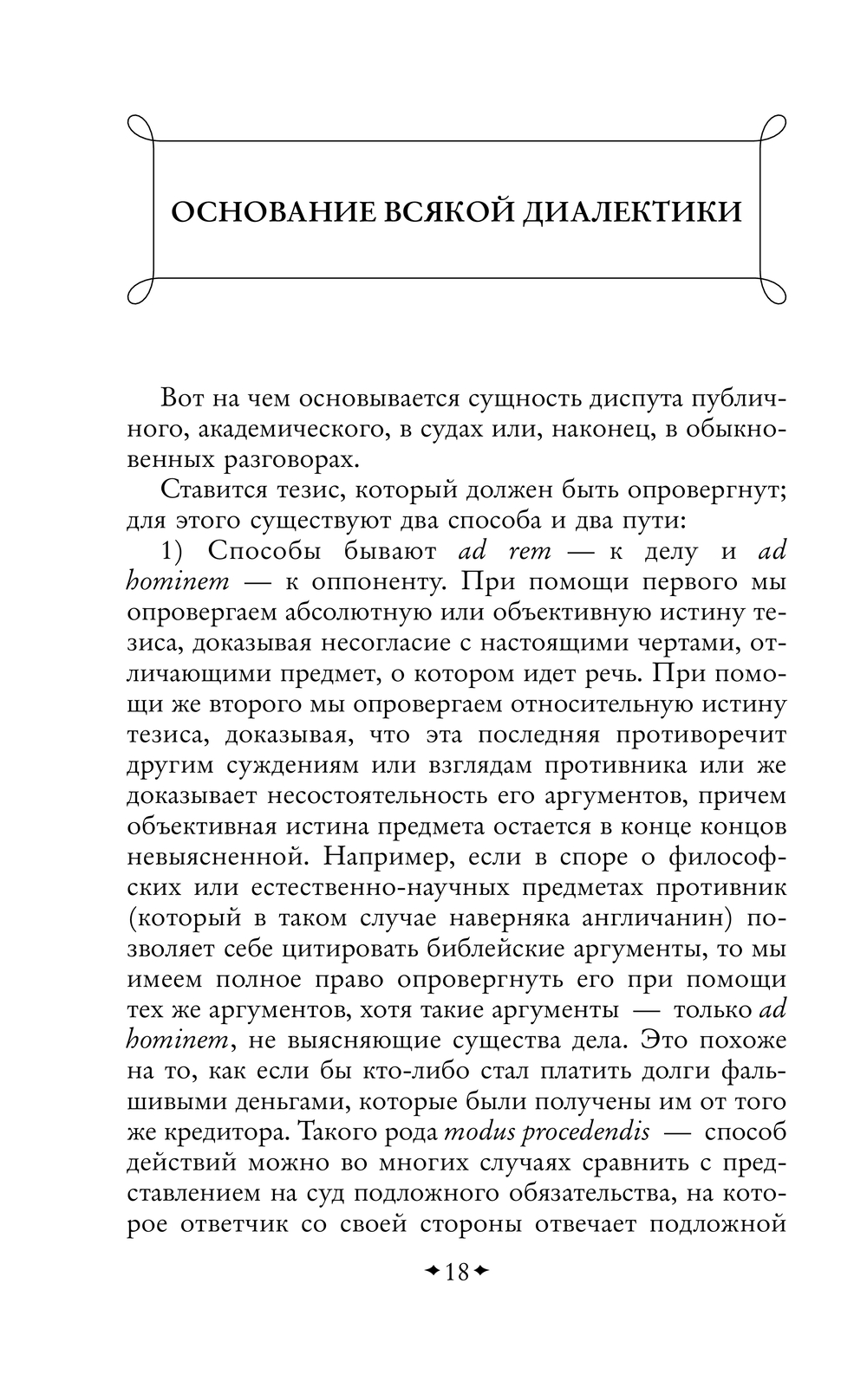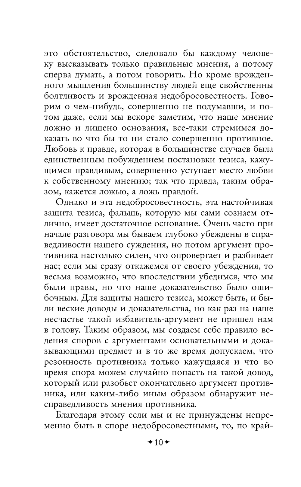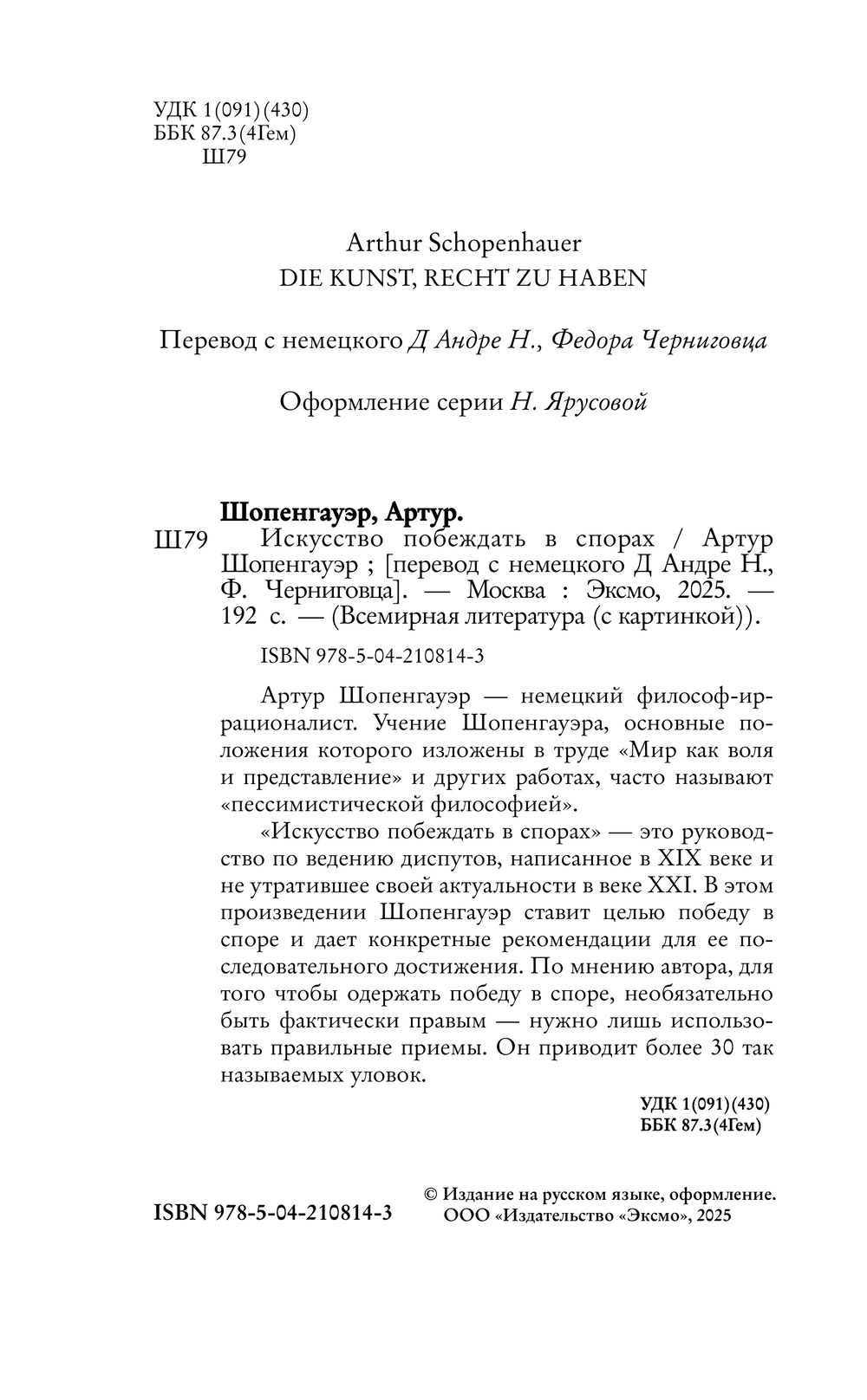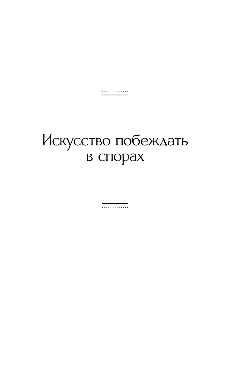"Искусство побеждать в спорах" – это руководство по ведению диспутов, написанное в XIX веке и не утратившее своей актуальности в веке XXI. В этом произведении Шопенгауэр ставит целью победу в споре и дает конкретные рекомендации для ее последовательного достижения. По мнению автора, для того чтобы одержать победу в споре, необязательно быть фактически правым – нужно лишь использовать правильные приемы. Он приводит более 30 так называемых уловок.