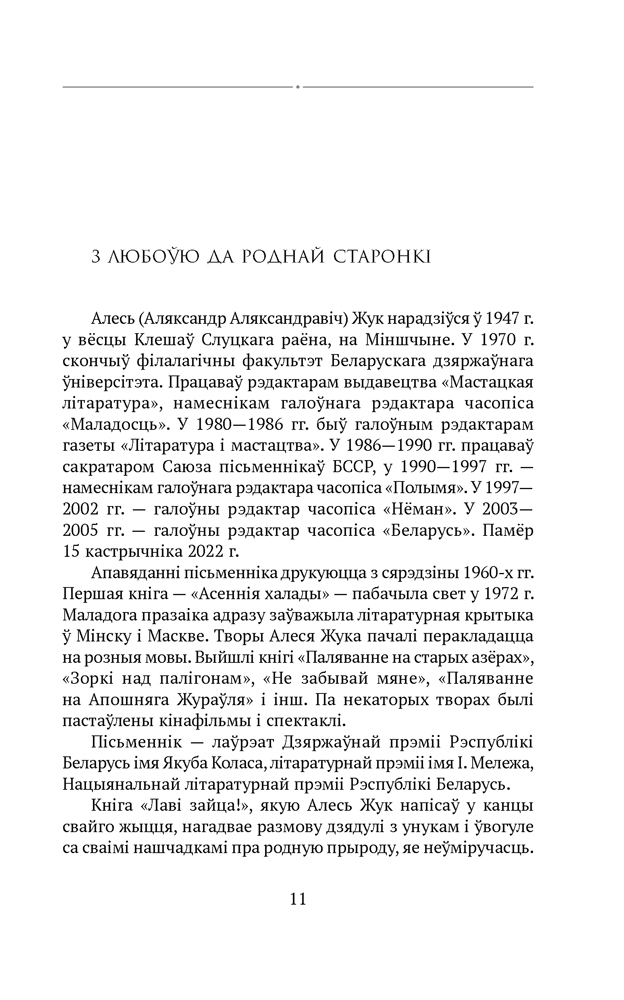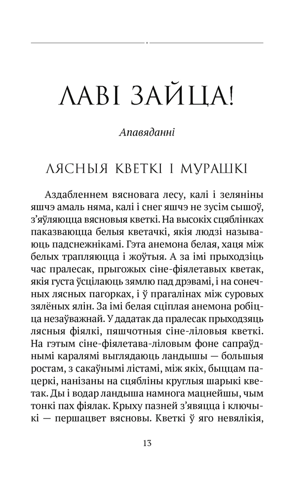 Новая кніга з серыі «Сучасная беларуская літаратура» змяшчае творы ў жанры анімалістыкі. Невялікія апавяданні сучасных пісьменнікаў-прыродазнаўцаў дазволяць чытачу зазірнуць у самыя розныя куты роднай прыроды, падгледзець жыццё звяроў і птушак. Кніга нагадвае, што людзі адказныя за захаванне прыгажосці нашай планеты для будучых пакаленняў.