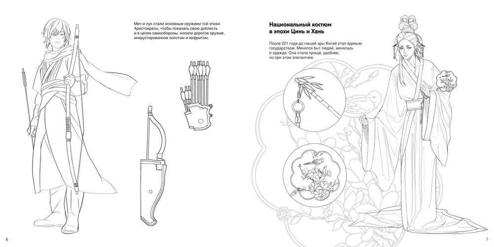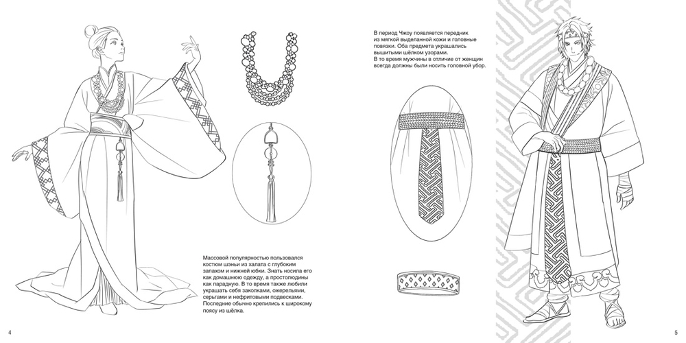 Книга для раскрашивания "Китайский национальный костюм" – это коллекция из 46 иллюстраций от 4-х современных художниц: Plus+, ShumsterArt, BRIT/0.5, Apple Grace, каждая из которых обладает своей уникальной графической манерой. Иллюстрации сопровождаются краткой исторической справкой о том, как на протяжении эпох менялась одежда жителей Поднебесной.