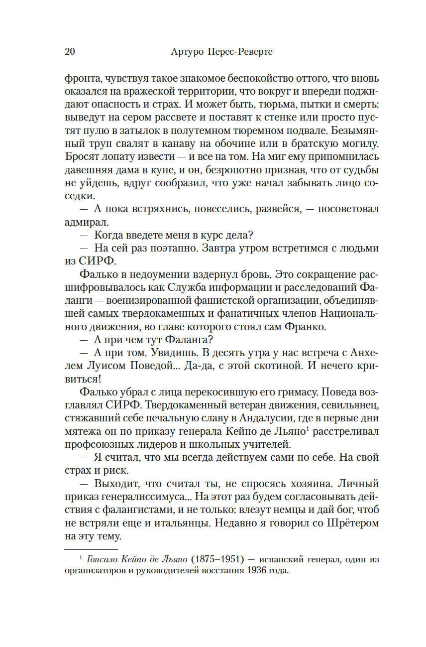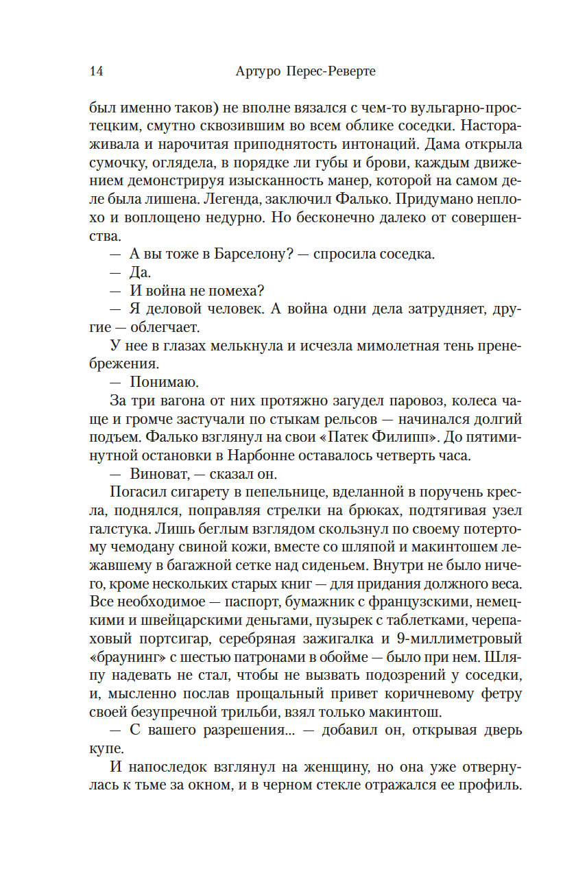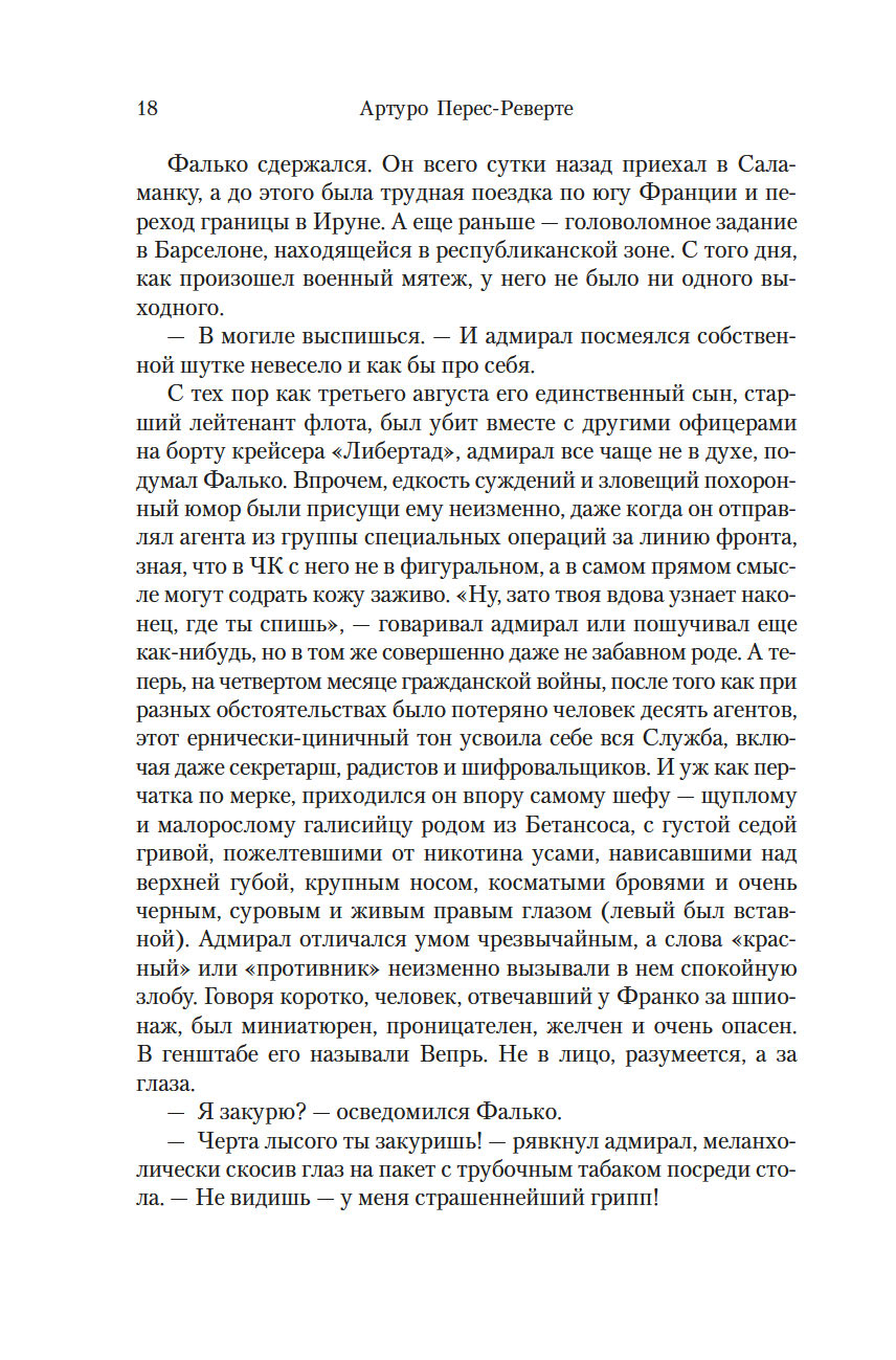 Артуро Перес-Реверте – бывший военный журналист, прославленный автор блестящих исторических, военных, приключенческих, детективных романов, переведенных на сорок языков, обладатель престижнейших литературных наград. Его романы о Фалько – остросюжетные шпионские триллеры и одновременно пародия на них, постмодернистская игра с канонами жанра. Фалько – капитан Алатристе три столетия спустя, Джеймс Бонд в условиях отнюдь не холодной войны, уважительный полупоклон Сомерсету Моэму и Джону Ле Карре.